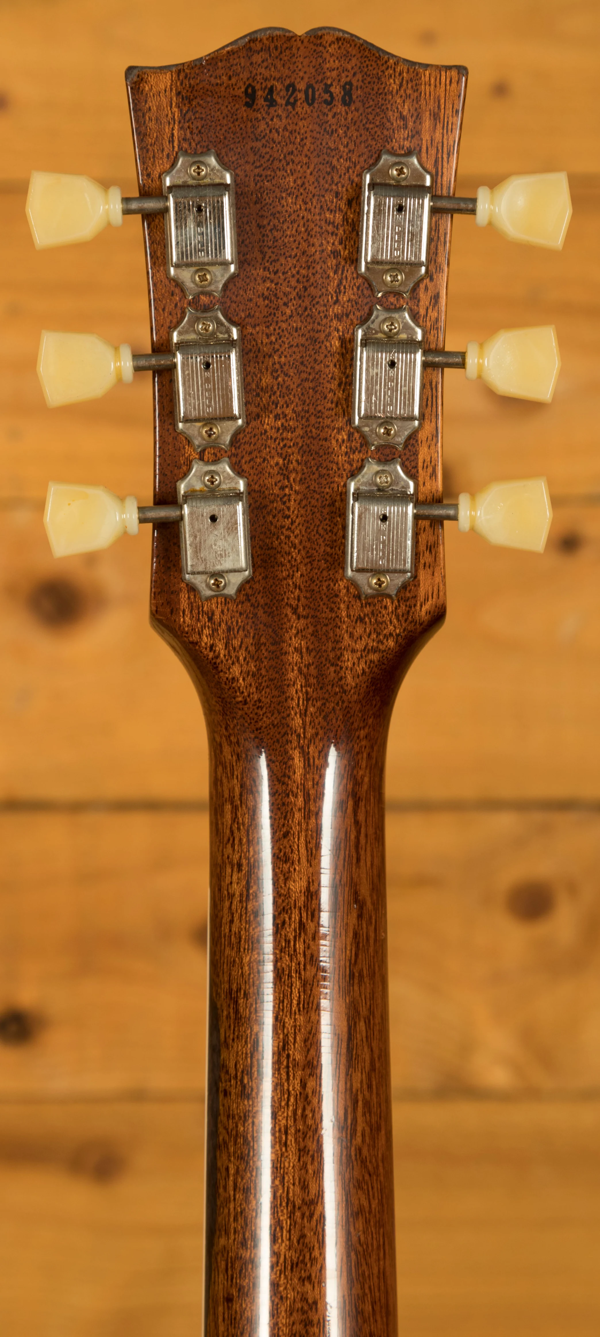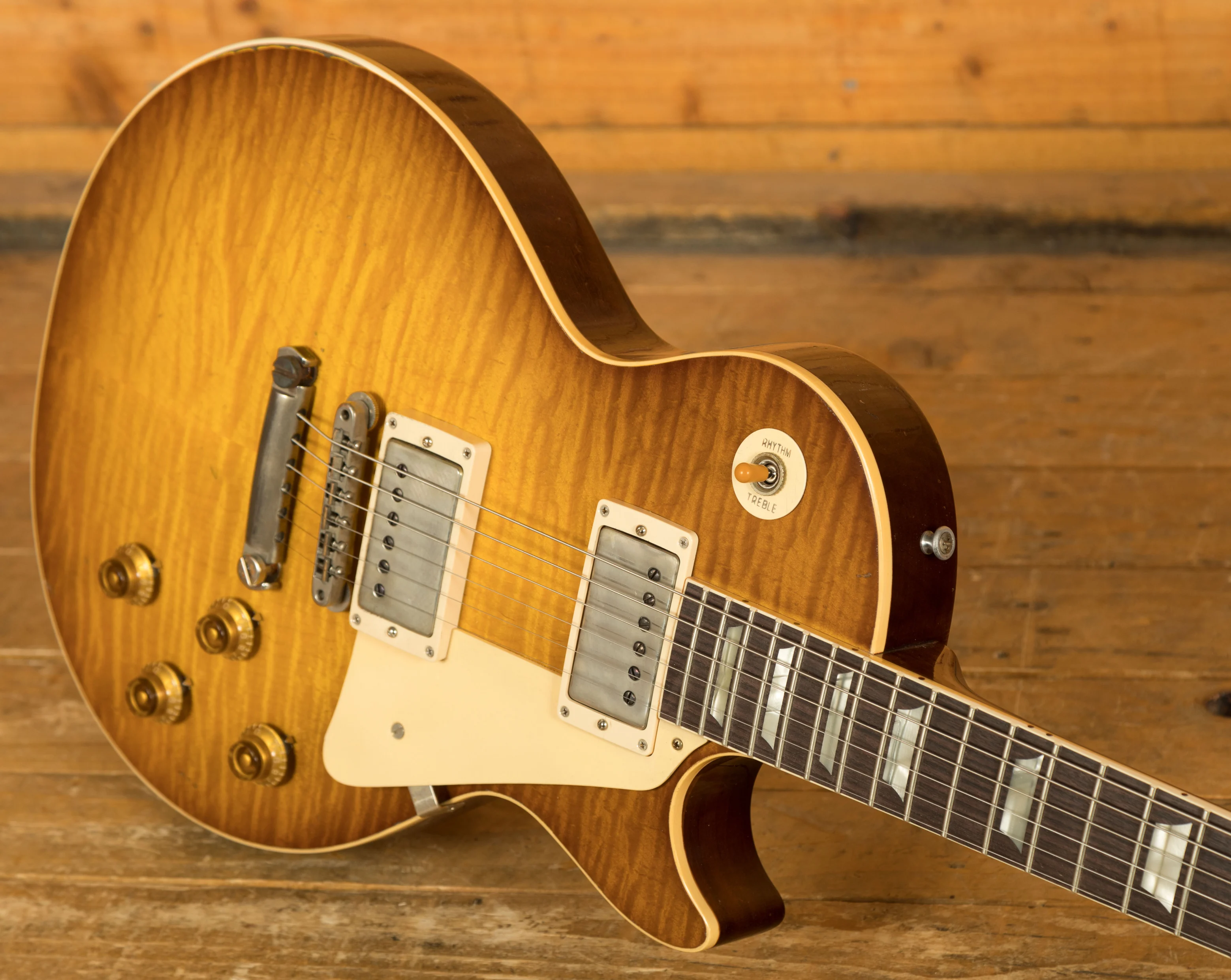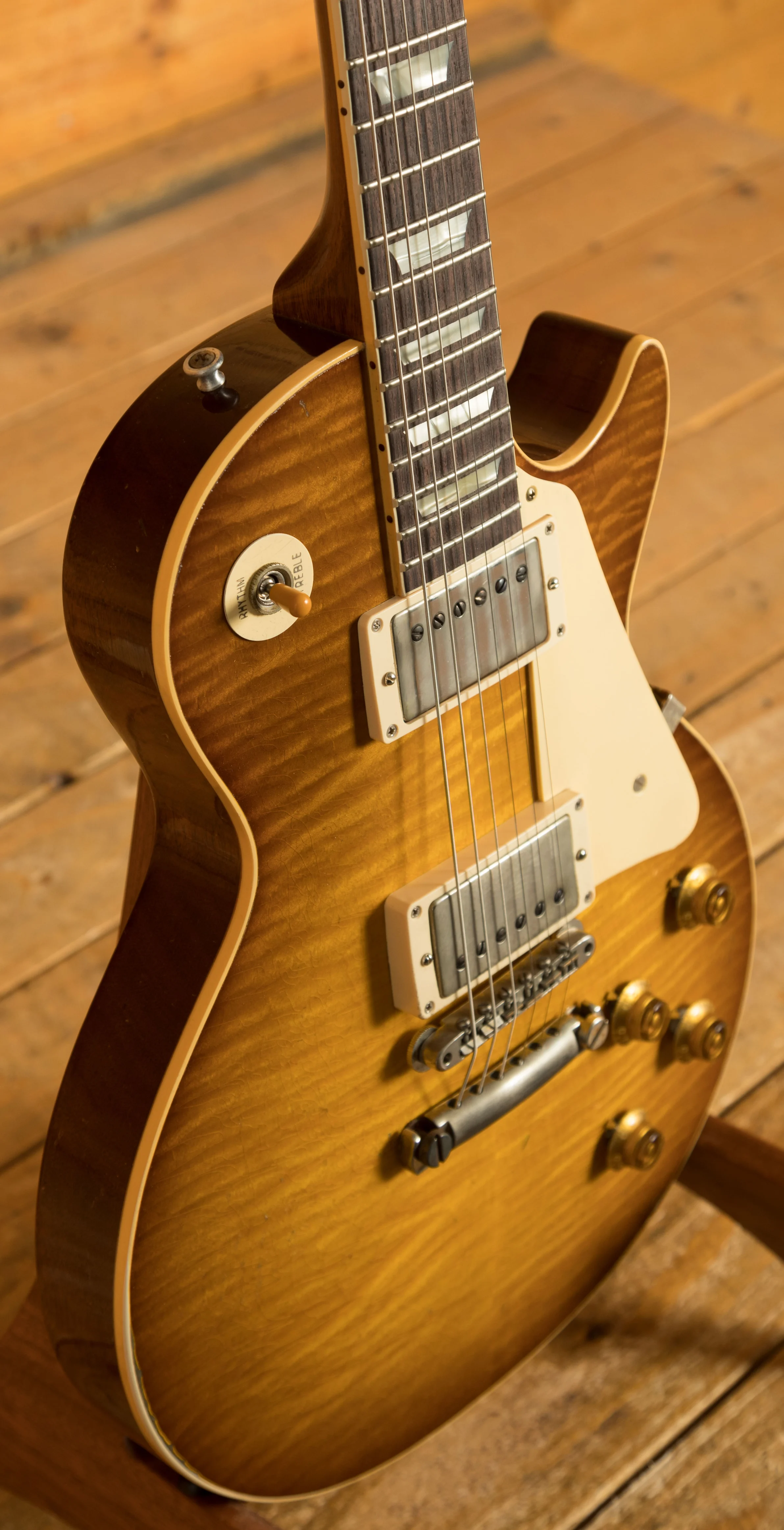 With a Mahogany body, this Les Paul benefits from a figured Maple top for the ultimate tonewood partnership.The figuring on this beauty is incredible. Rich and super resonant it offers premium tone and timeless aesthetics, while the Golden Poppy Burst Heavy Aged Nitro finish looks a million dollars and really allows the wood to breathe and the natural tone to sing through. The Murphy Lab do an incredible job of capturing the feel of a vintage instrument. With hide glue construction, this Les Paul offers true vintage tonality.