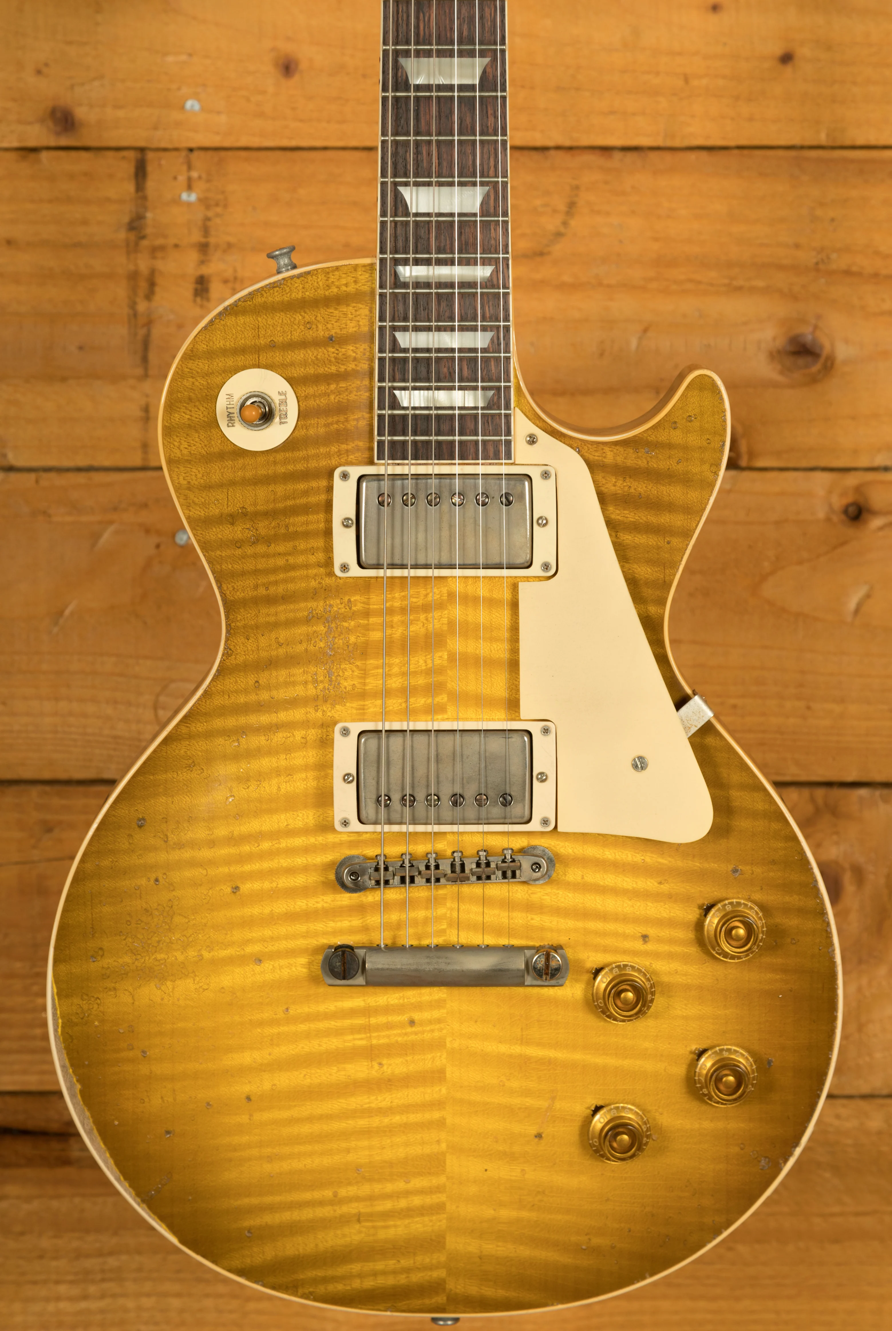 With a Mahogany body, this Les Paul benefits from a figured Maple top for the ultimate tonewood partnership.The figuring on this beauty is incredible. Rich and super resonant it offers premium tone and timeless aesthetics, while the Green Lemon Fade Heavy Aged Nitro finish looks a million dollars and really allows the wood to breathe and the natural tone to sing through. The Murphy Lab do an incredible job of capturing the feel of a vintage instrument. With hide glue construction, this Les Paul offers true vintage tonality.