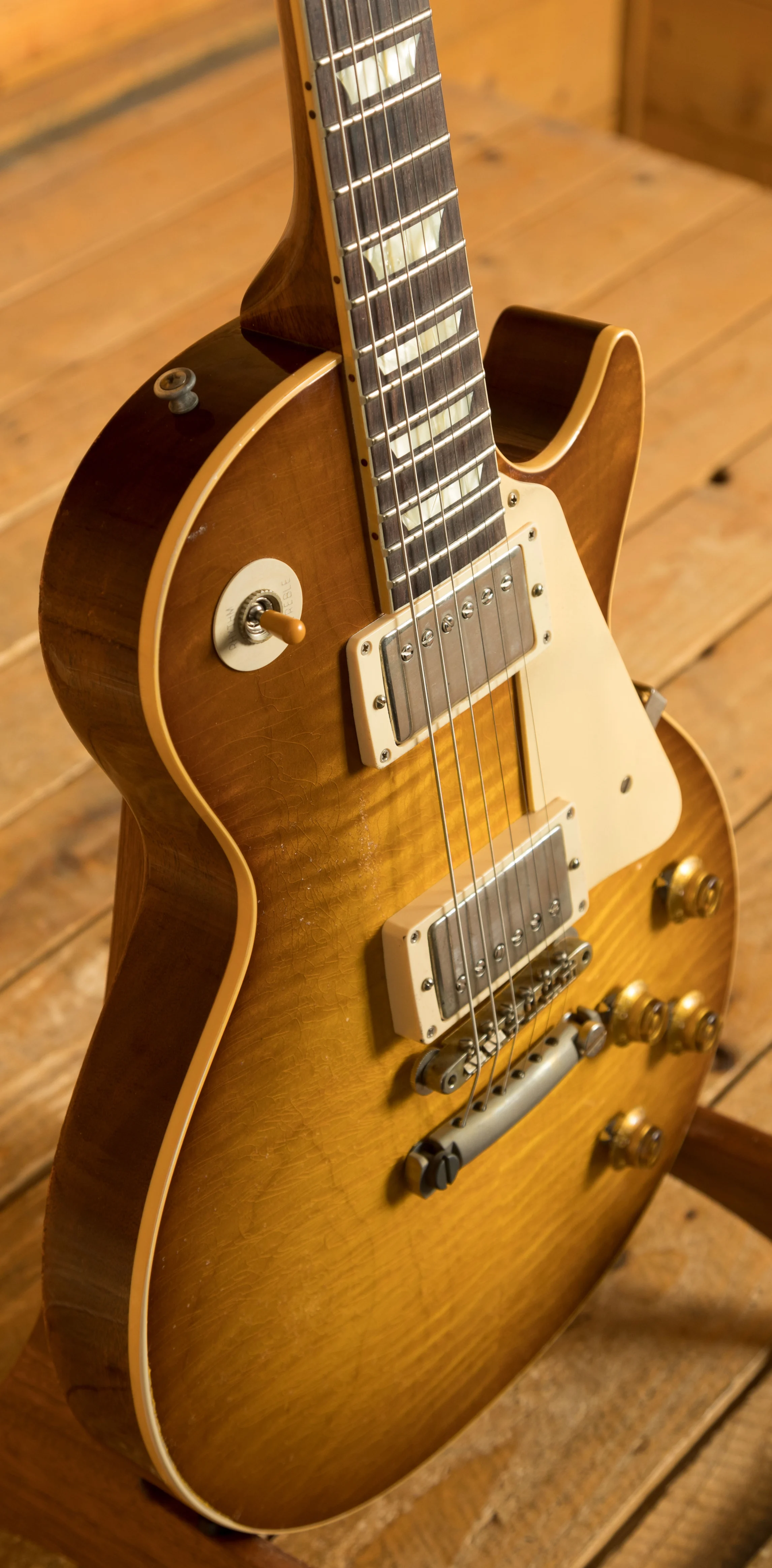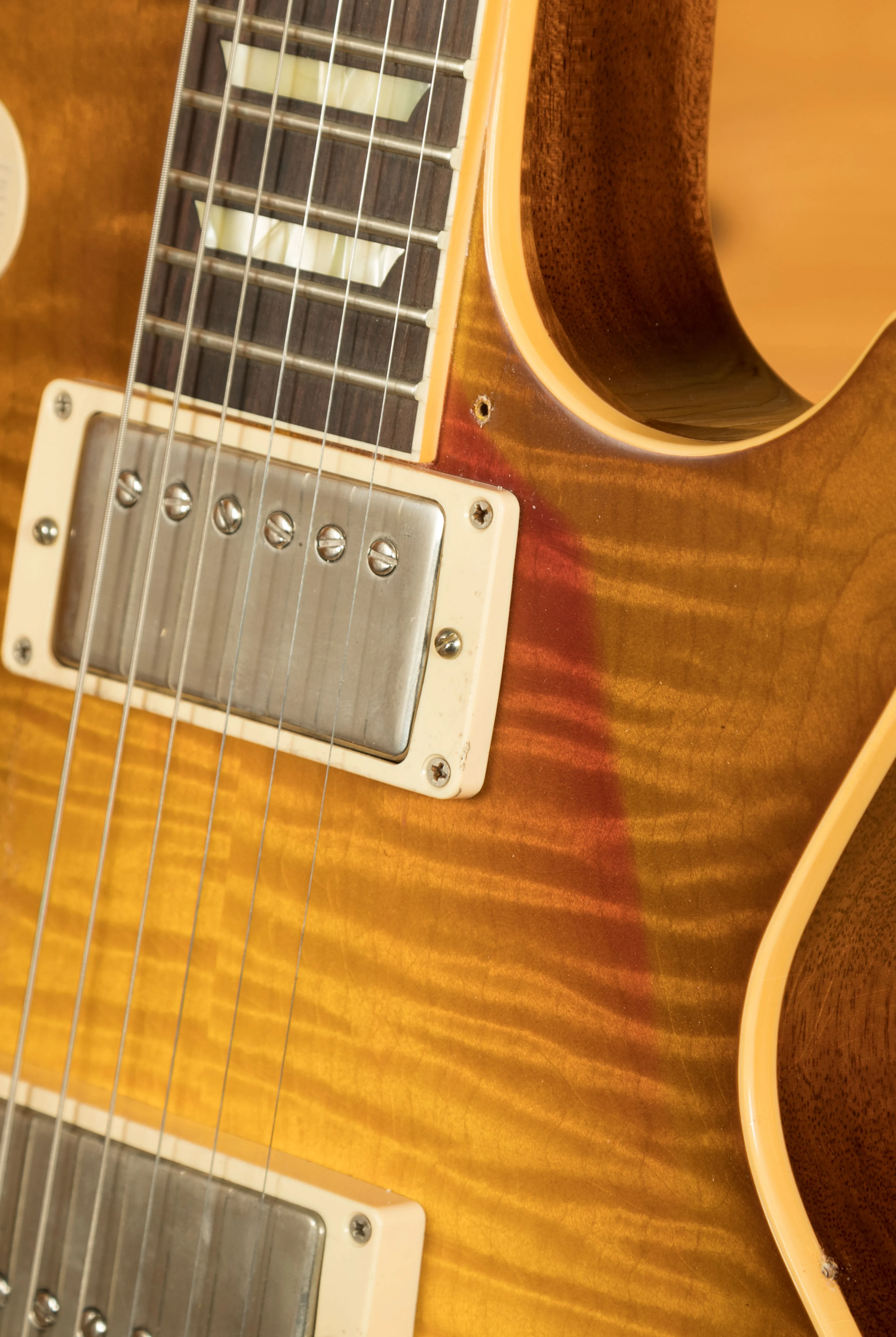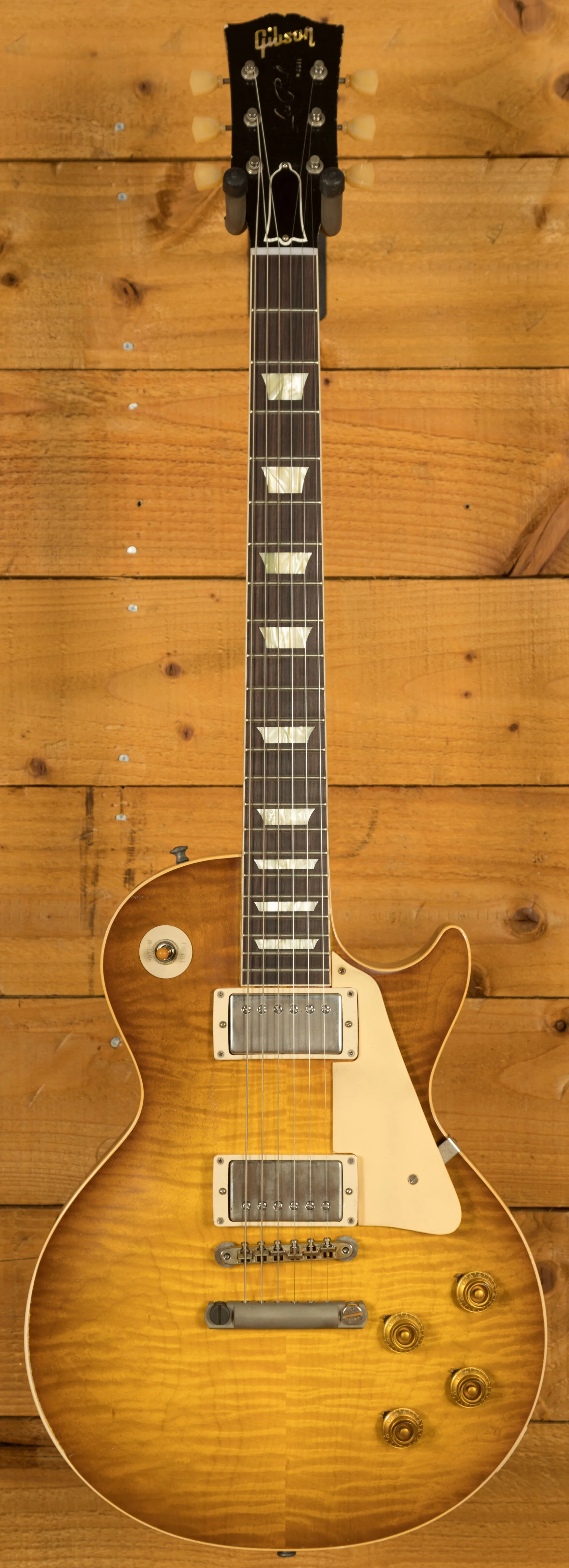 With a Mahogany body, this Les Paul benefits from a figured Maple top for the ultimate tonewood partnership.The figuring on this beauty is incredible. Rich and super resonant it offers premium tone and timeless aesthetics, while the Golden Poppy Burst w/Shadows Heavy Aged Nitro finish looks a million dollars and really allows the wood to breathe and the natural tone to sing through. The Murphy Lab do an incredible job of capturing the feel of a vintage instrument. With hide glue construction, this Les Paul offers true vintage tonality.