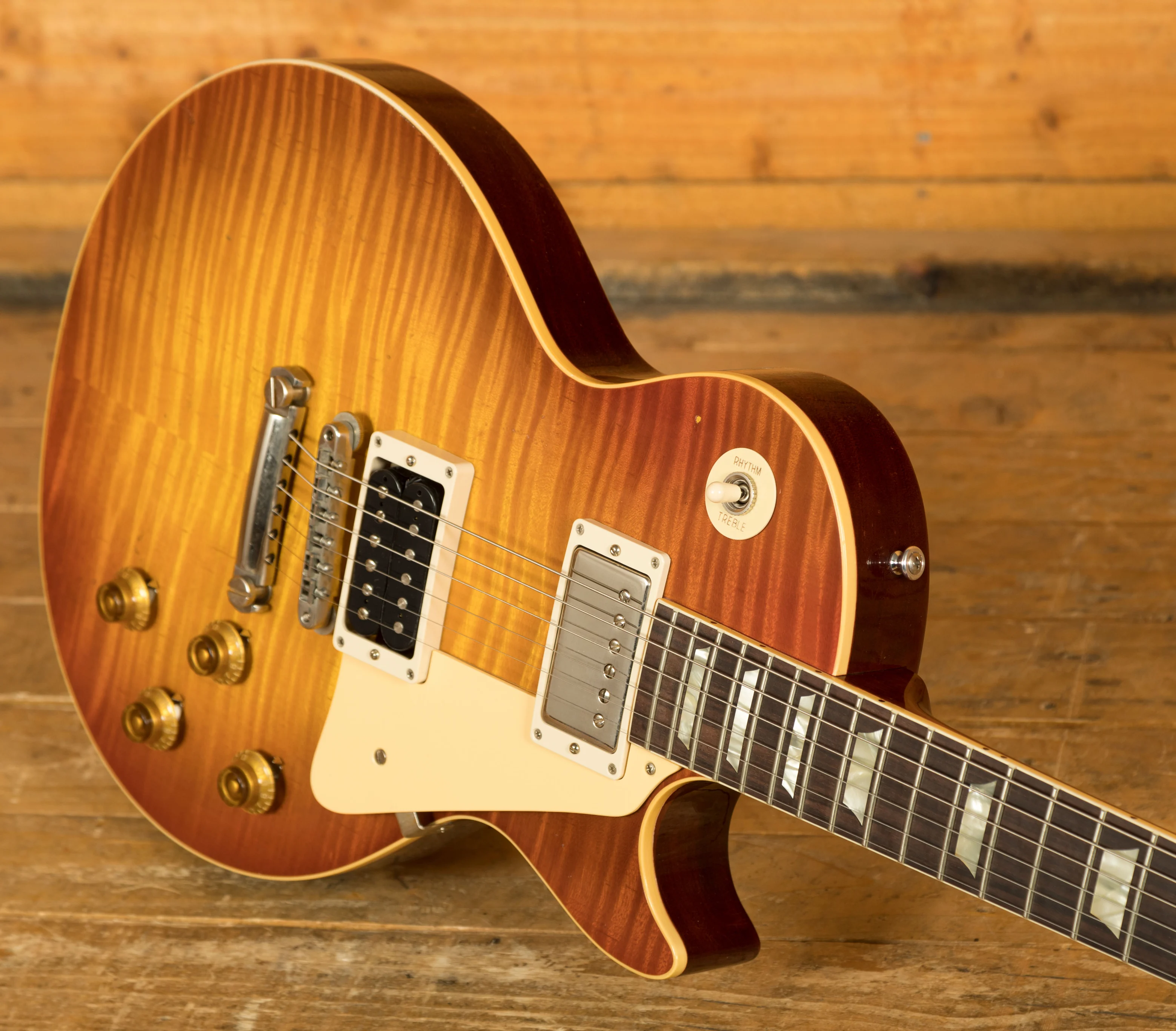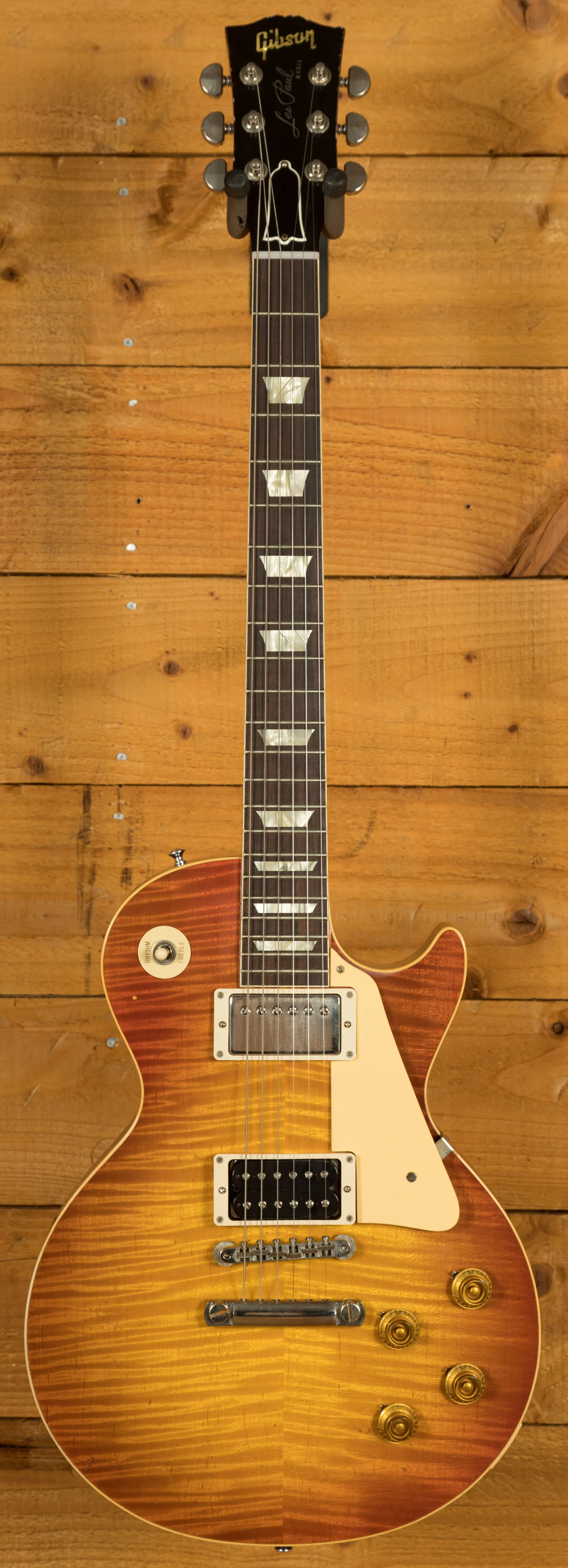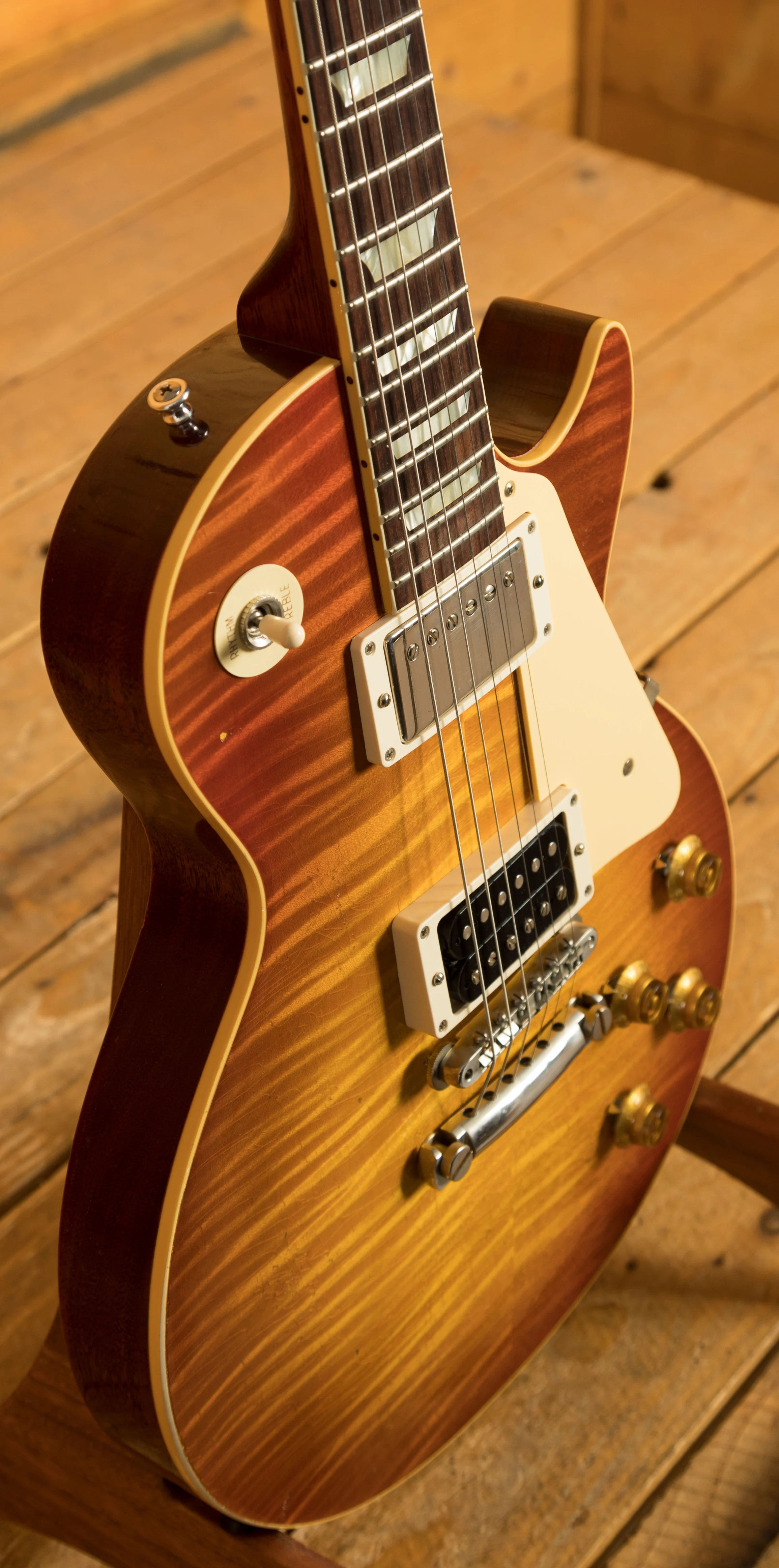 With a Mahogany body, this Les Paul benefits from a figured Maple top for the ultimate tonewood partnership. Rich and super resonant it offers premium tone and timeless aesthetics, while the Sunrise Tea Burst Light Aged Nitro finish looks a million dollars and really allows the wood to breathe and the natural tone to sing through. The Murphy Lab do an incredible job of capturing the feel of a vintage instrument. With hide glue construction, this Les Paul offers true vintage tonality.