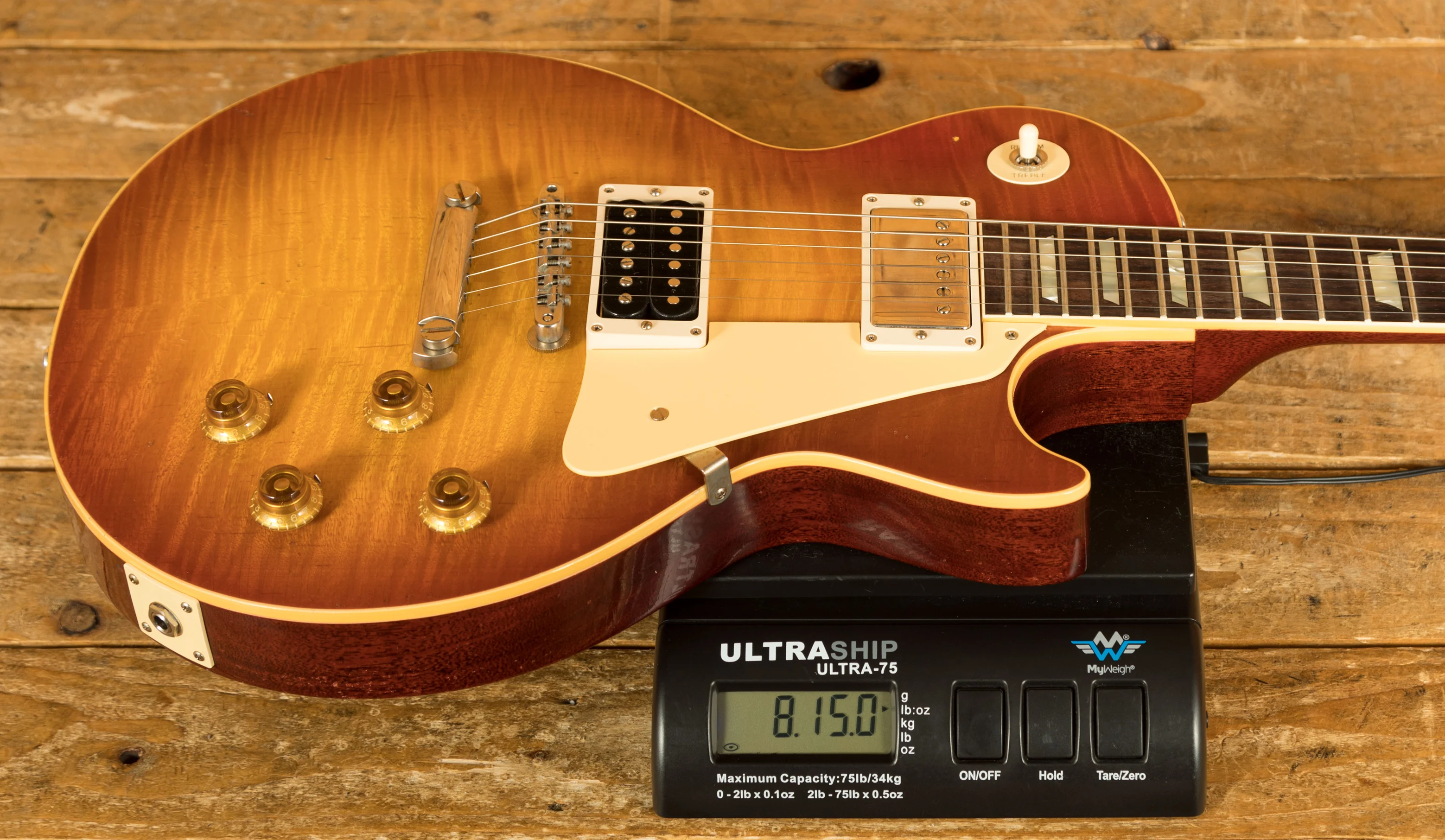 The solid Mahogany neck is topped with a crisp Indian Rosewood fingerboard with classic Gibson Trapezoid inlays, this guitar looks every bit the real deal. With a 24.75" scale length, 12" radius, 1.687" nut width and medium jumbo frets, it retains that classic Les Paul feel. The ABR-1 bridge and light weight stopbar offer an authentic vintage vibe.