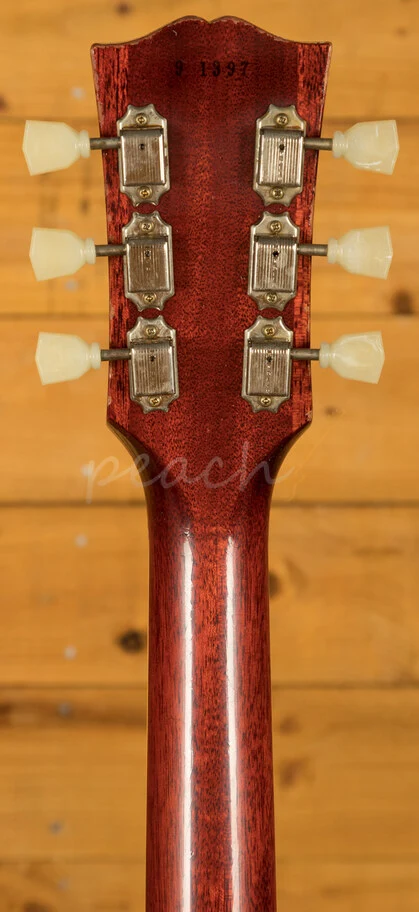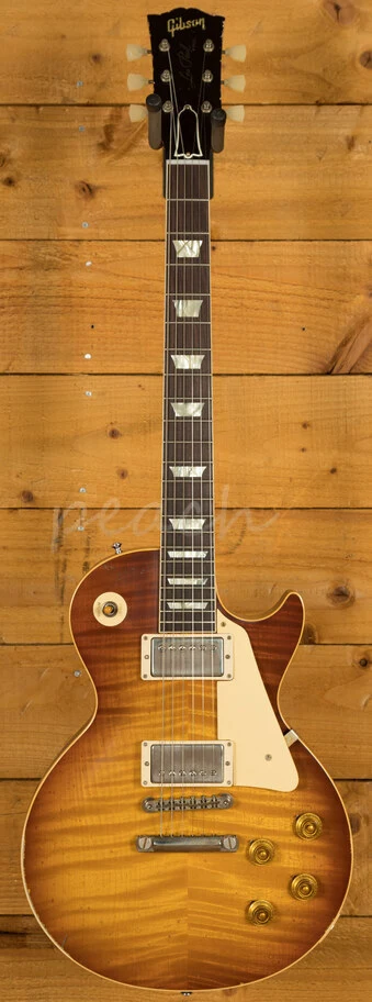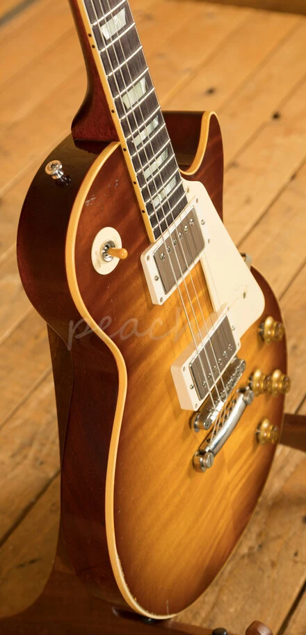 With a Mahogany body, this Les Paul benefits from a hand picked figured Maple top for the ultimate tonewood partnership. We enjoy a very strong relationship with the Gibson Custom Shop here at Peach, with our very own John Priest taking regular trips out to the workshop to pick out some awesome tops for our guitars. The figuring on this beauty is incredible. Rich and super resonant it offers premium tone and timeless aesthetics, while the Cherry Tea Burst Light Aged Nitro finish looks a million dollars and really allows the wood to breathe and the natural tone to sing through. Hand painted by the legend himself Tom Murphy this Les Paul is of the highest quality. The Murphy Lab do an incredible job of capturing the feel of a vintage instrument. With hide glue construction, this Les Paul offers true vintage tonality.