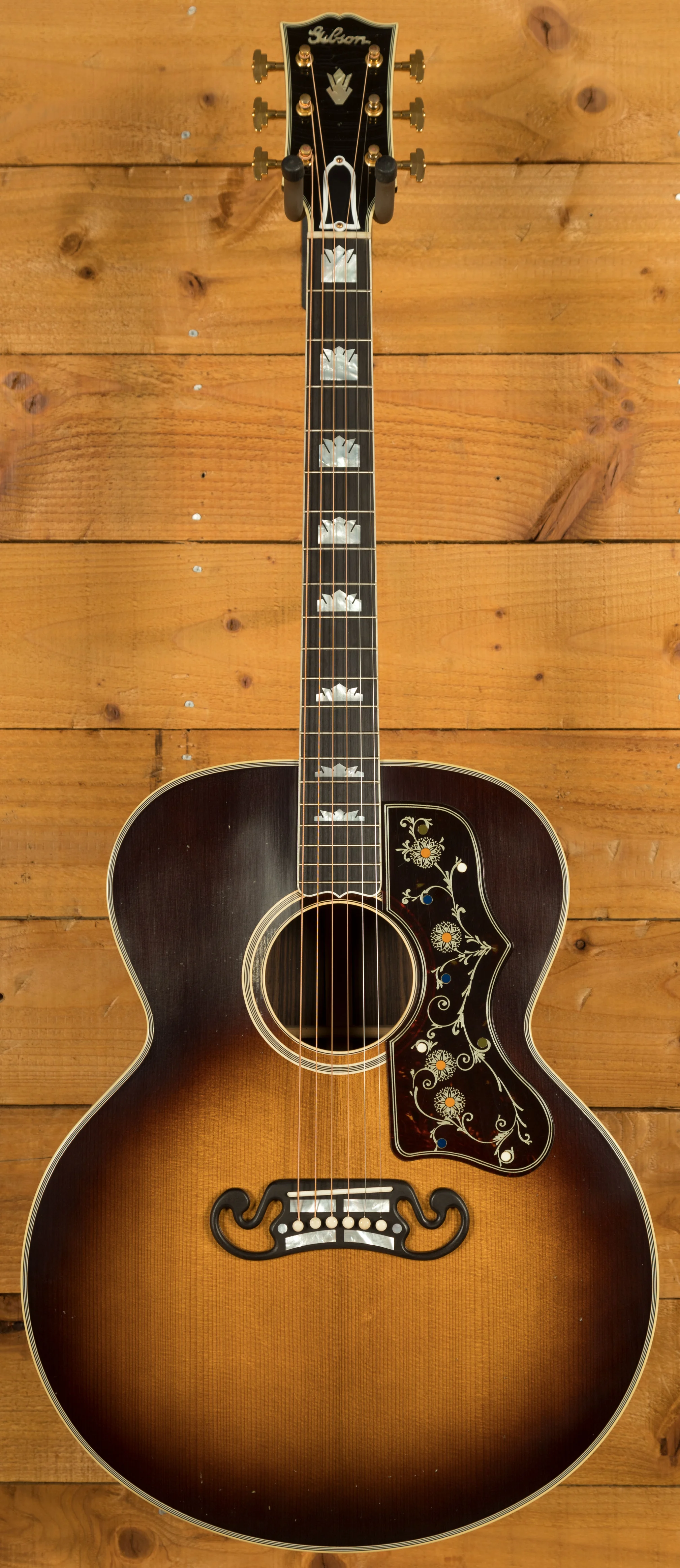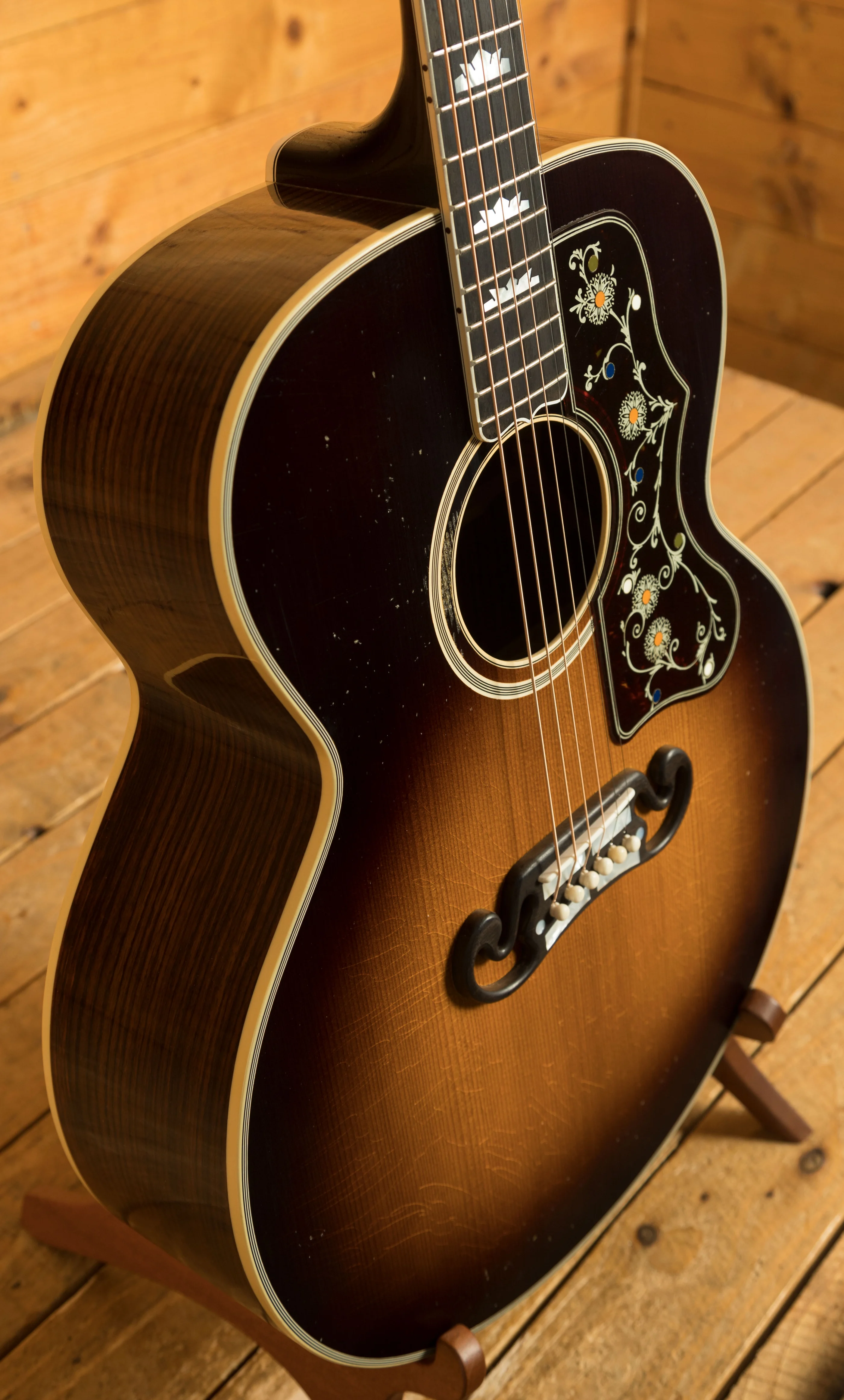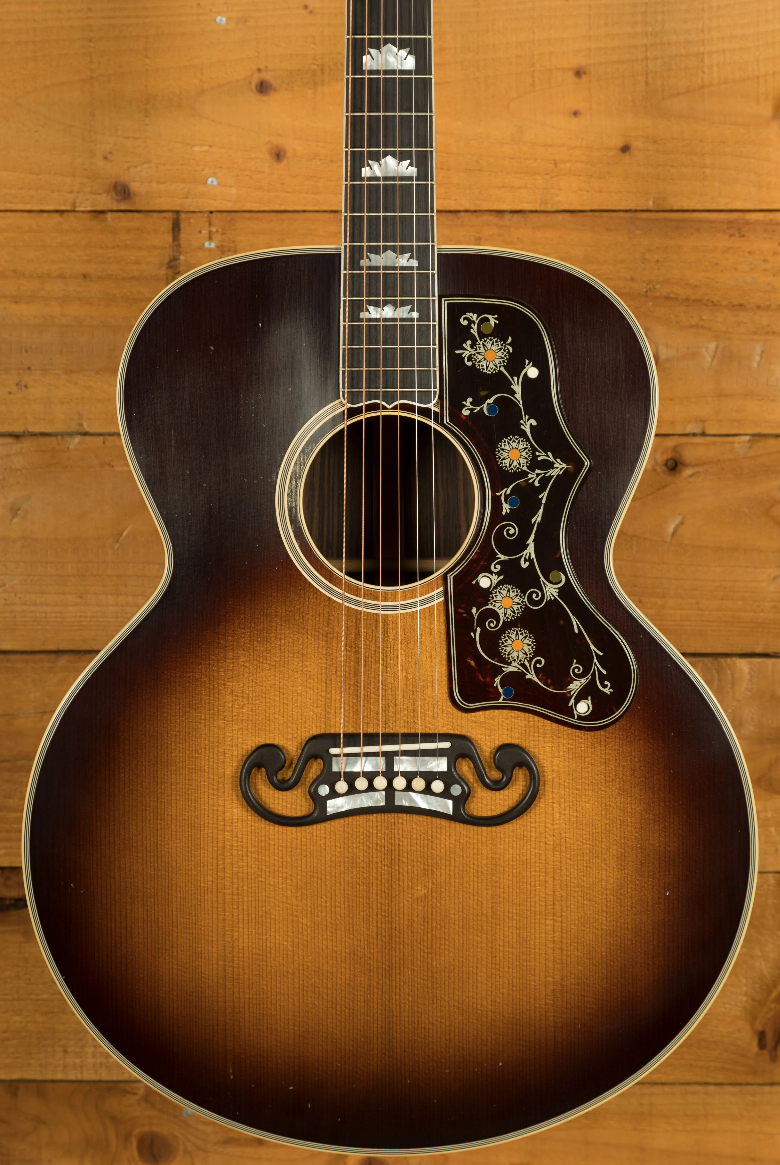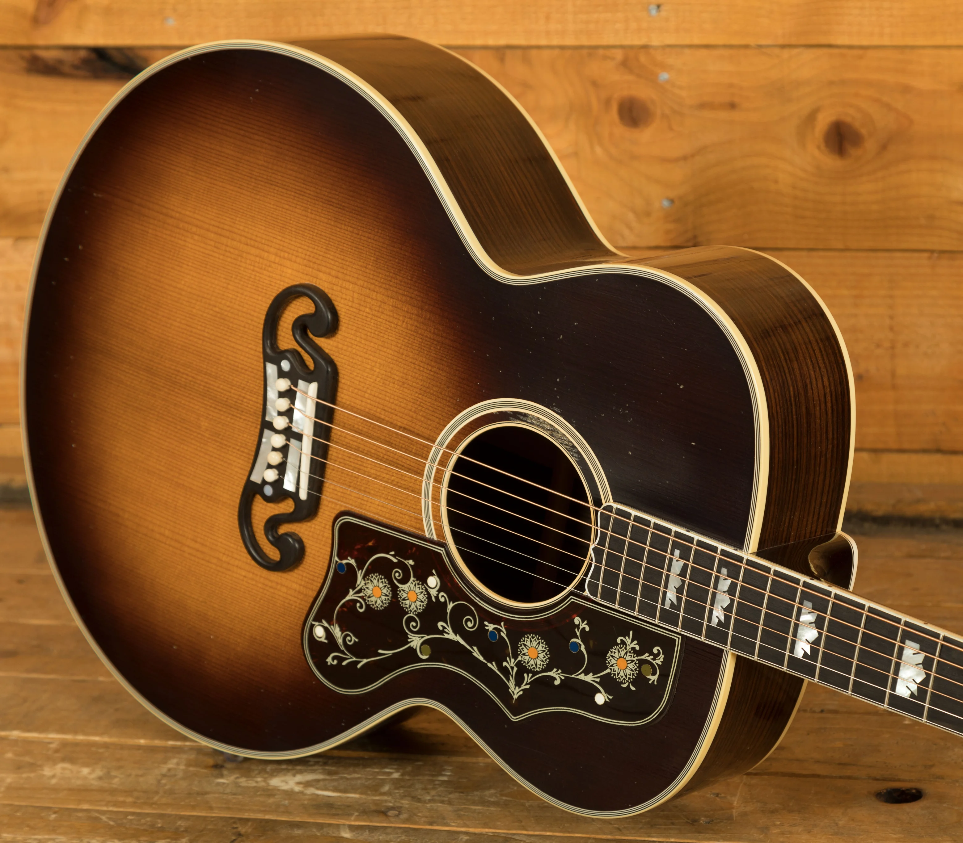 Early Pre-war SJ-200s were built with rosewood back and sides, but low demand in the years following the Depression kept production numbers small. As a result, those rosewood-bodied SJ-200s have become rare finds and are now especially prized by collectors. With a thermally aged Sitka Spruce top paired up with some truly stunning Rosewood, back and sides, this SJ-200 boasts a slightly different sound compared to later SJ-200 models. Its still loud, and really powerful, but its slightly warmer and has a more prominent mid range. With a period correct aged Faded Vintage Sunburst finish, this SJ-200 really does look the real deal! The ageing and lacquer cracking is truly awesome, the Murphy Lab team have done such an incredible job at capturing the visual charm of what an old Gibson looks like today.