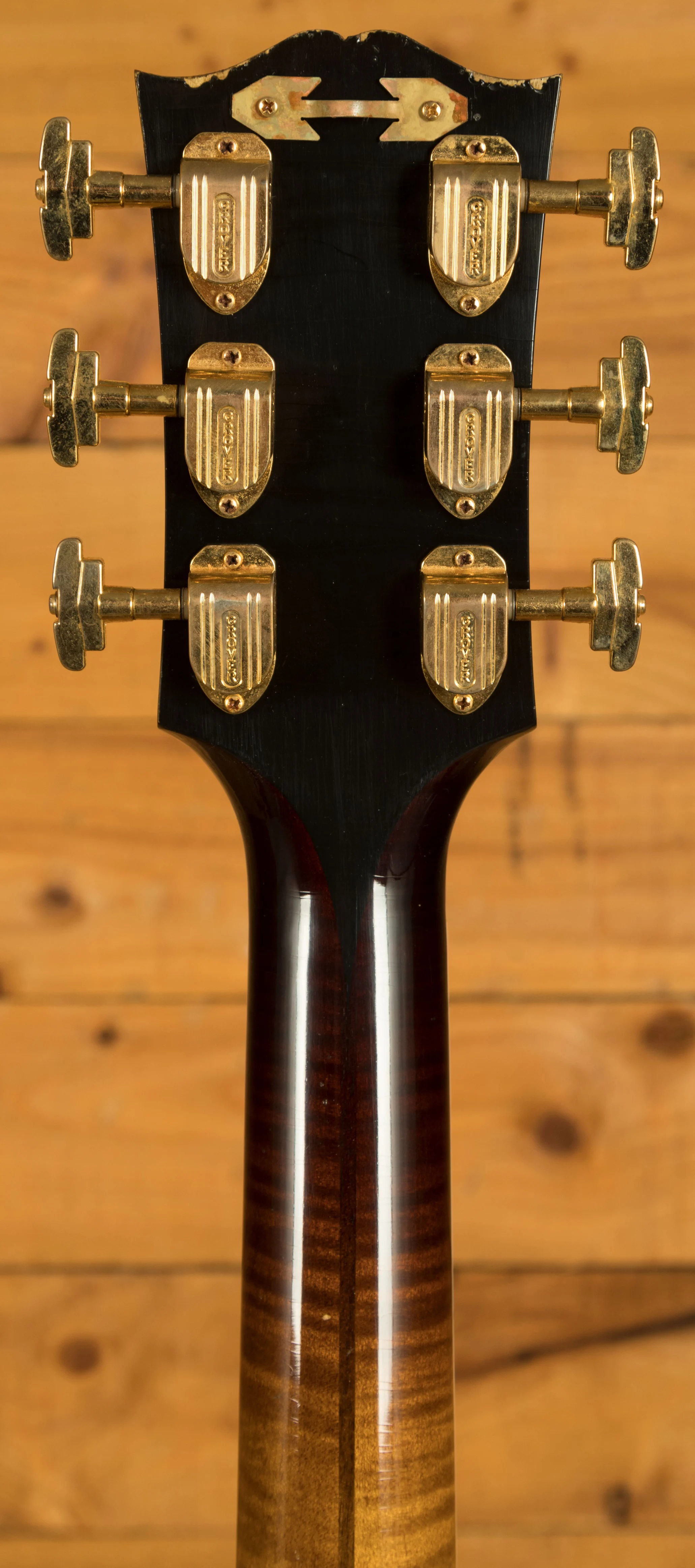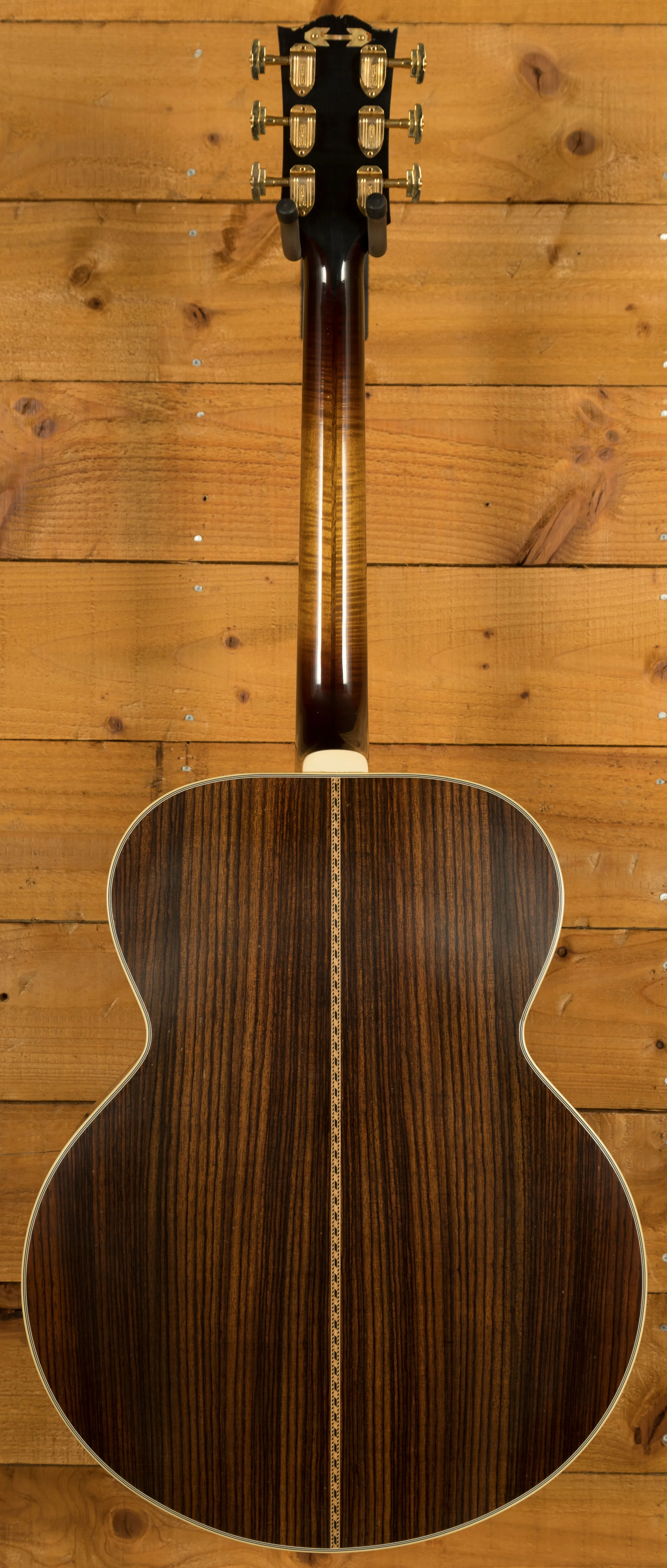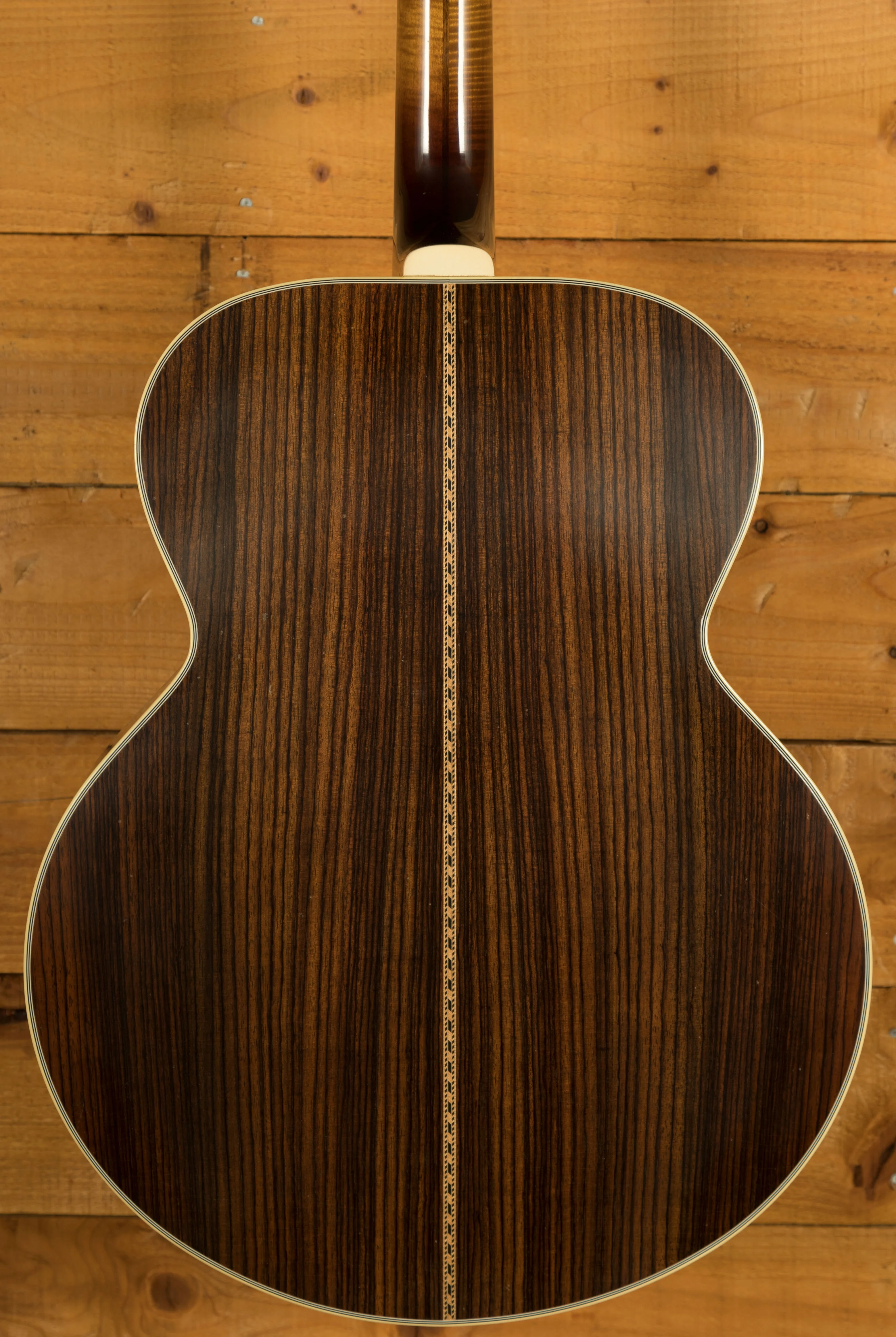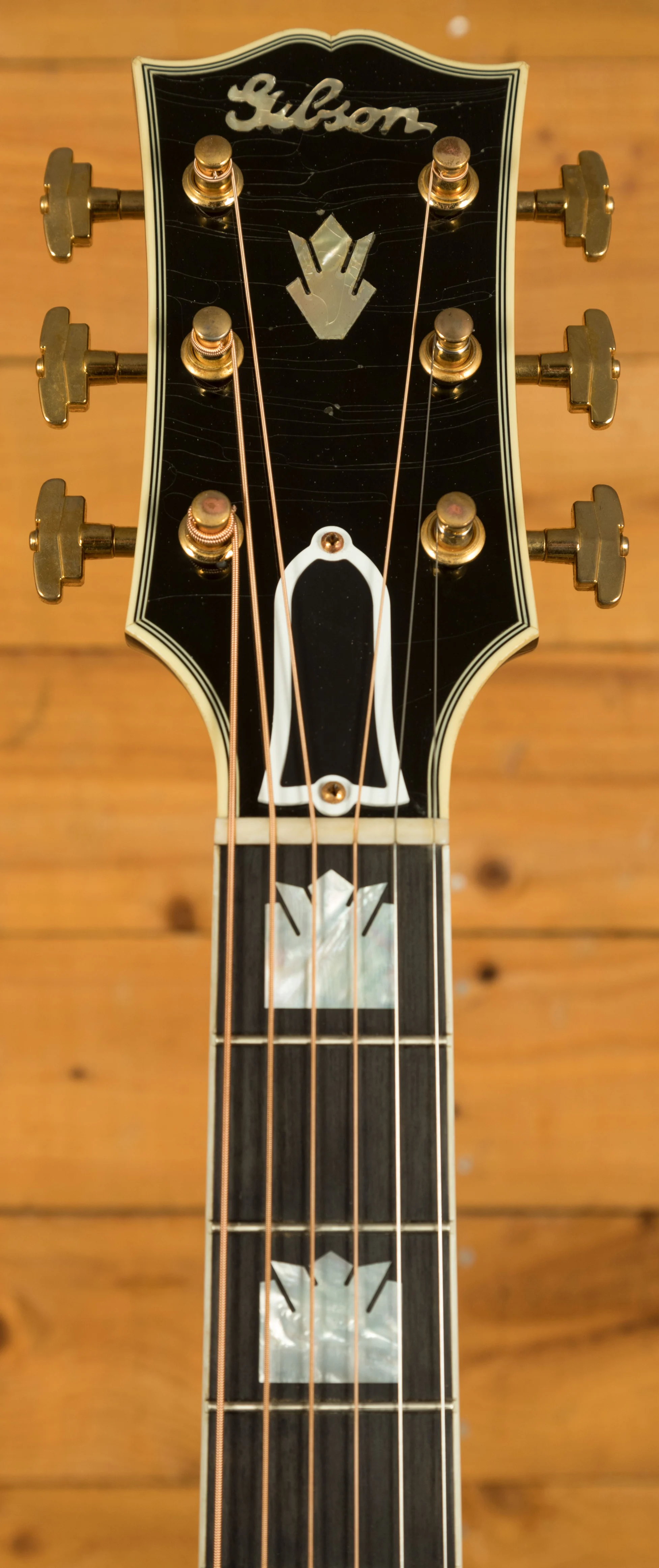 This Pre-War SJ-200 features a D shaped 2-piece Maple neck with a Walnut stringer. It really fills you hand and feels super secure while still be quick and easy to move around. The dark Ebony fingerboard is adorned with traditional Mother of Pearl Graduated Crown inlays, 43.815mm nut width, a 25.5 scale length, and 20 vintage frets.