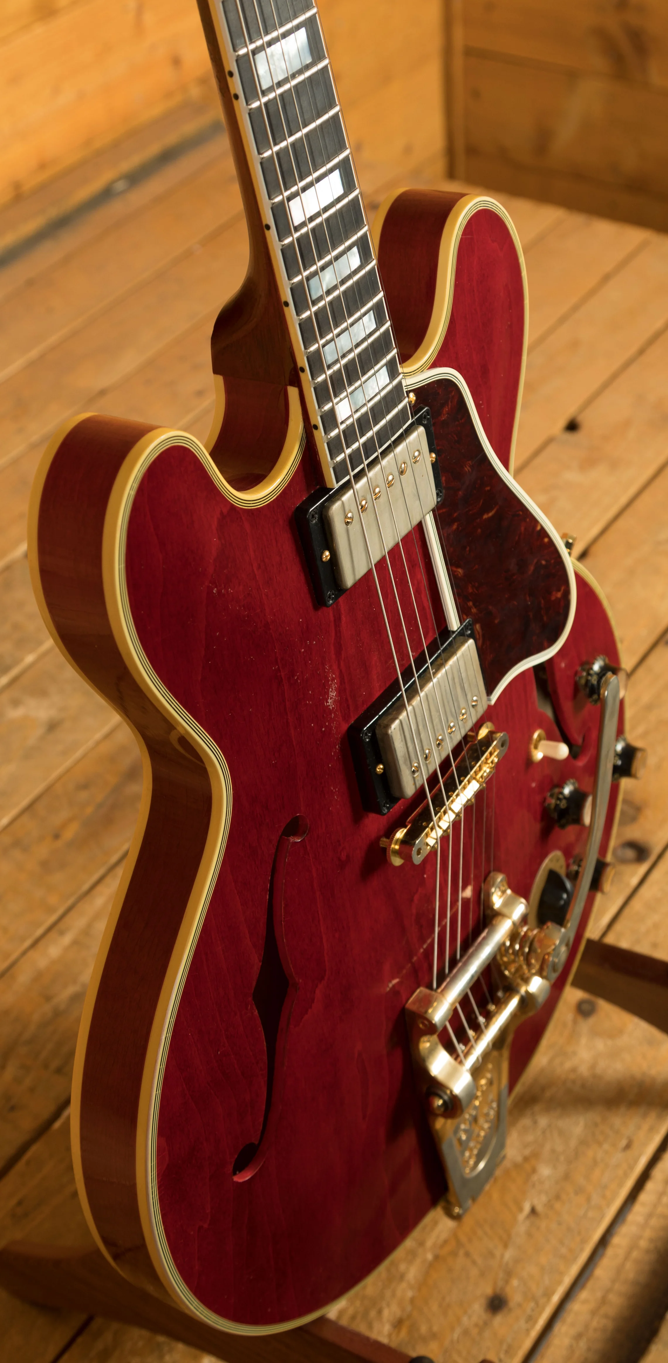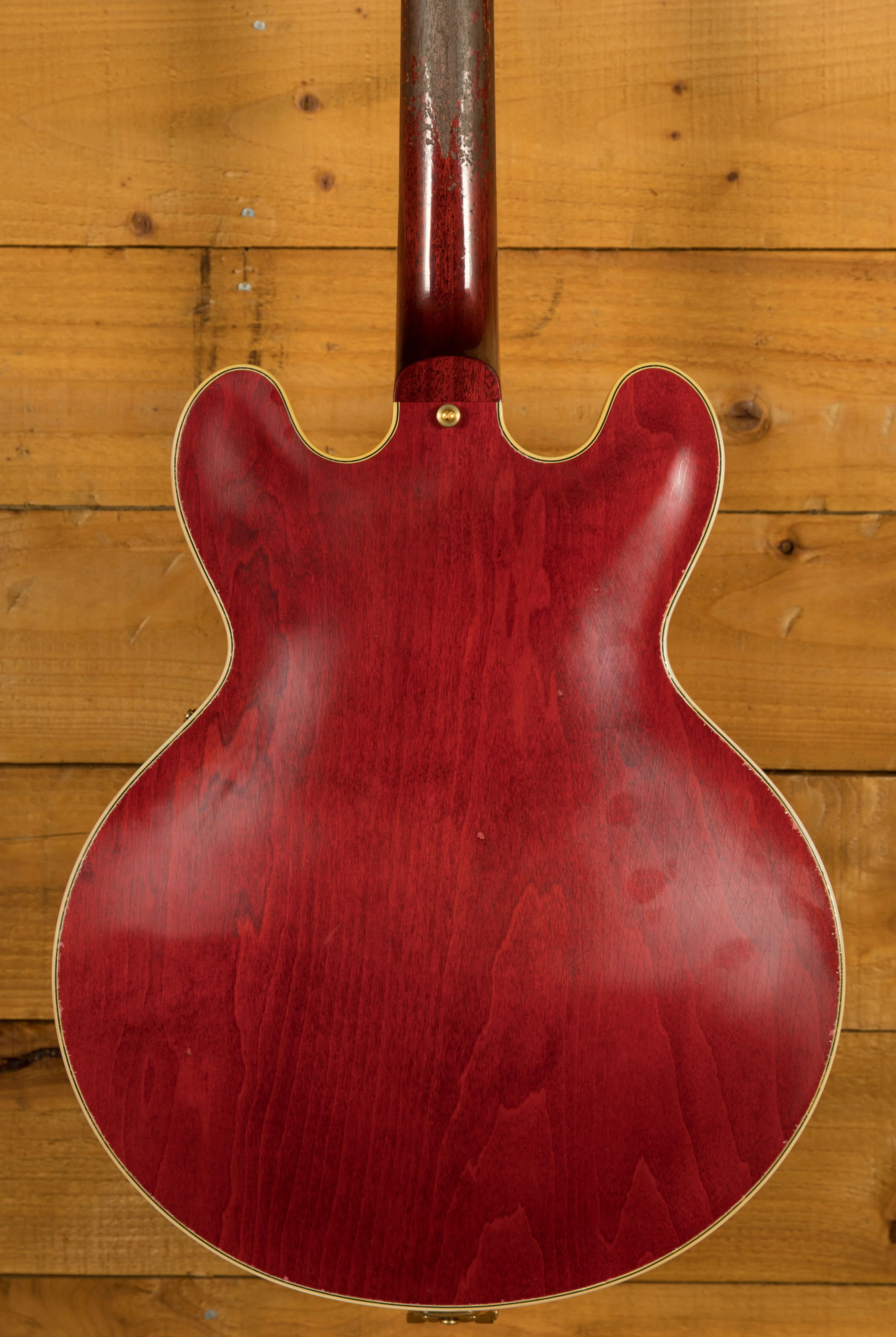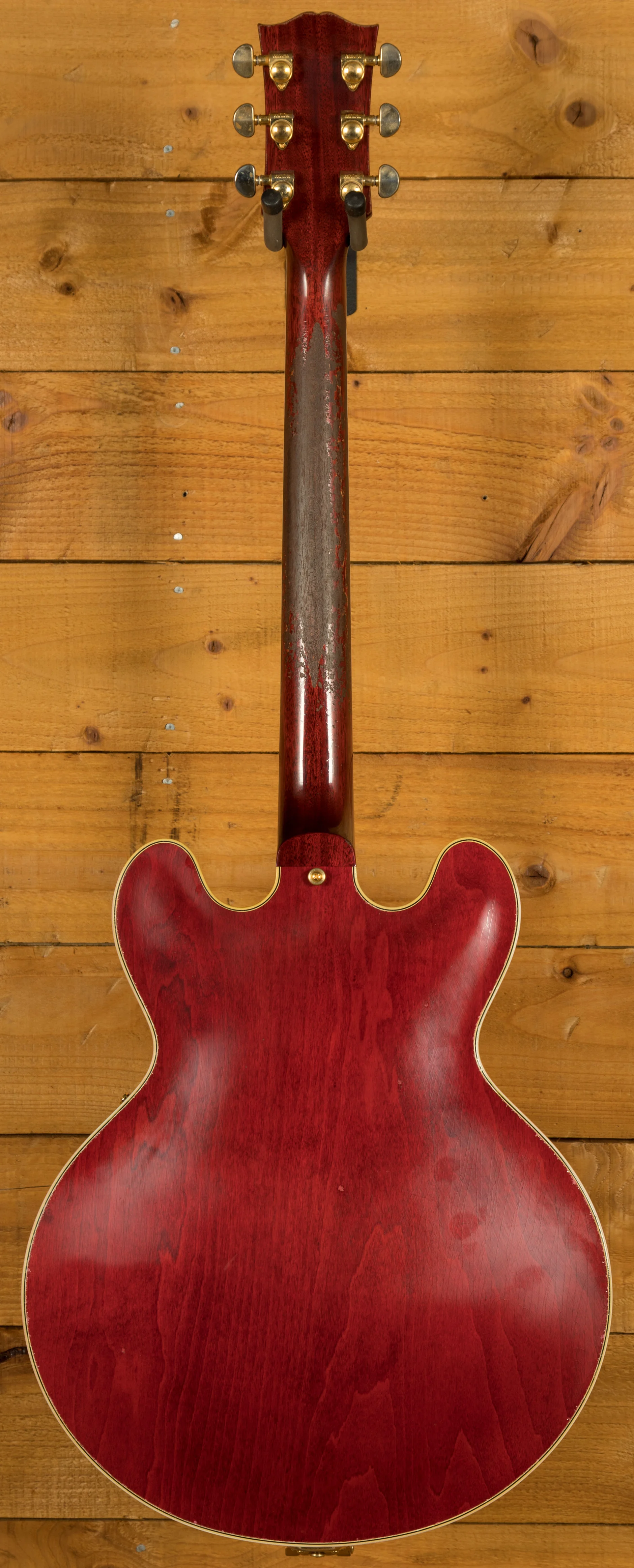 The neck is something special, crafted from Mahogany; it features a gorgeous Ebony fingerboard, embellished with block inlays. With 22 frets and a 24.75" scale length it feels smooth and comfortable, equally at home playing slick lead work or heavy chord strumming. With hide glue construction, this 355 offers true vintage tonality.