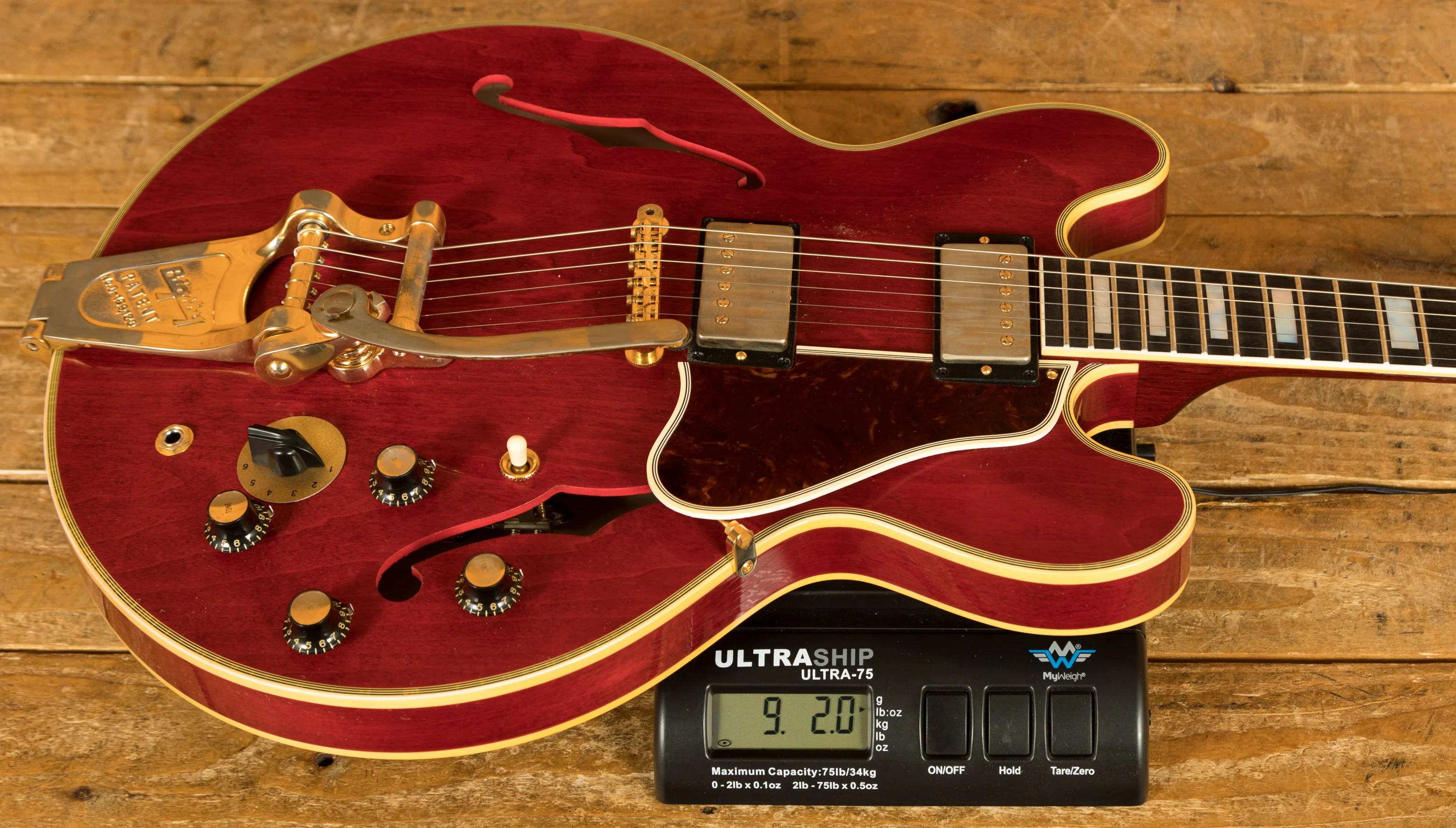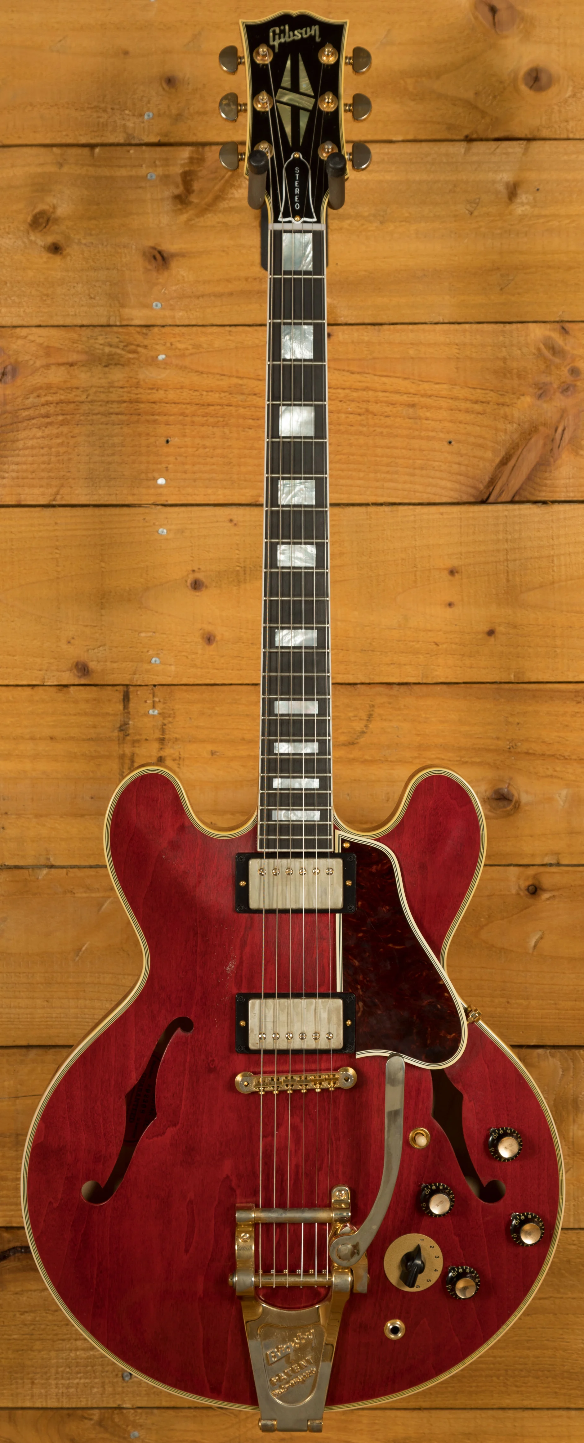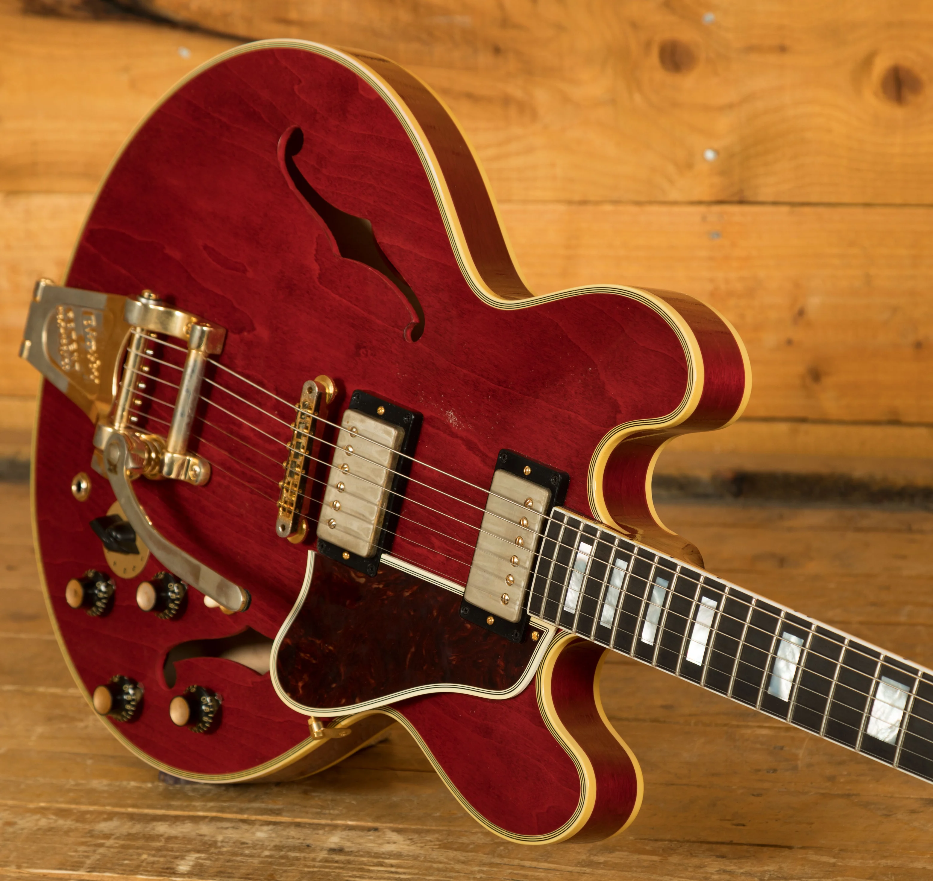 The neck is something special, crafted from Mahogany; it features a gorgeous Ebony fingerboard, embellished with block inlays. With 22 frets and a 24.75" scale length it feels smooth and comfortable, equally at home playing slick lead work or heavy chord strumming. With hide glue construction, this 355 offers true vintage tonality.