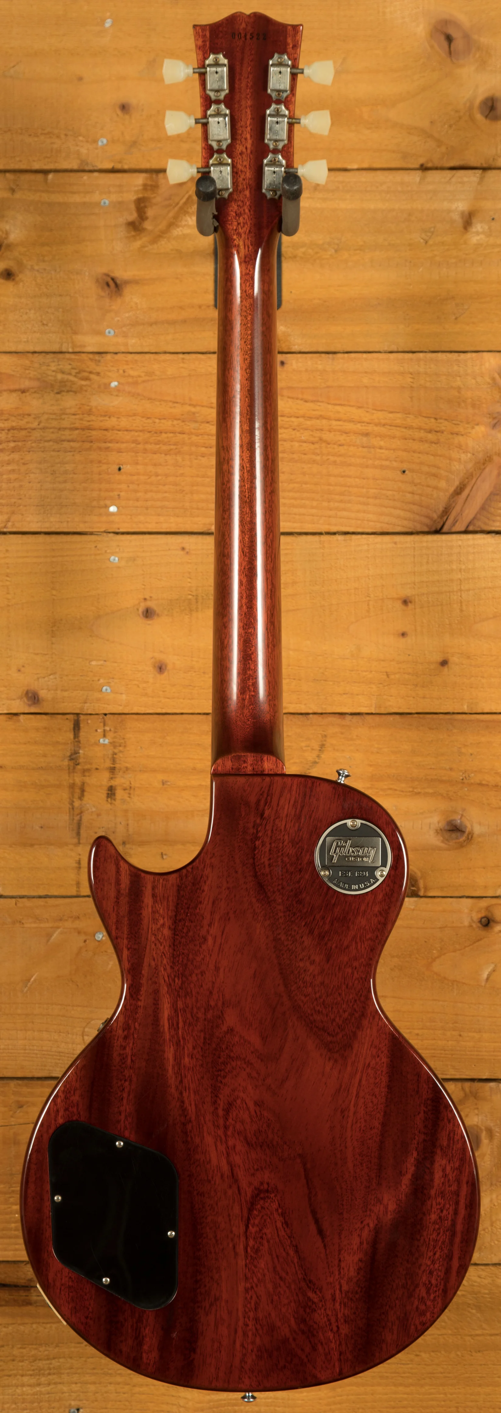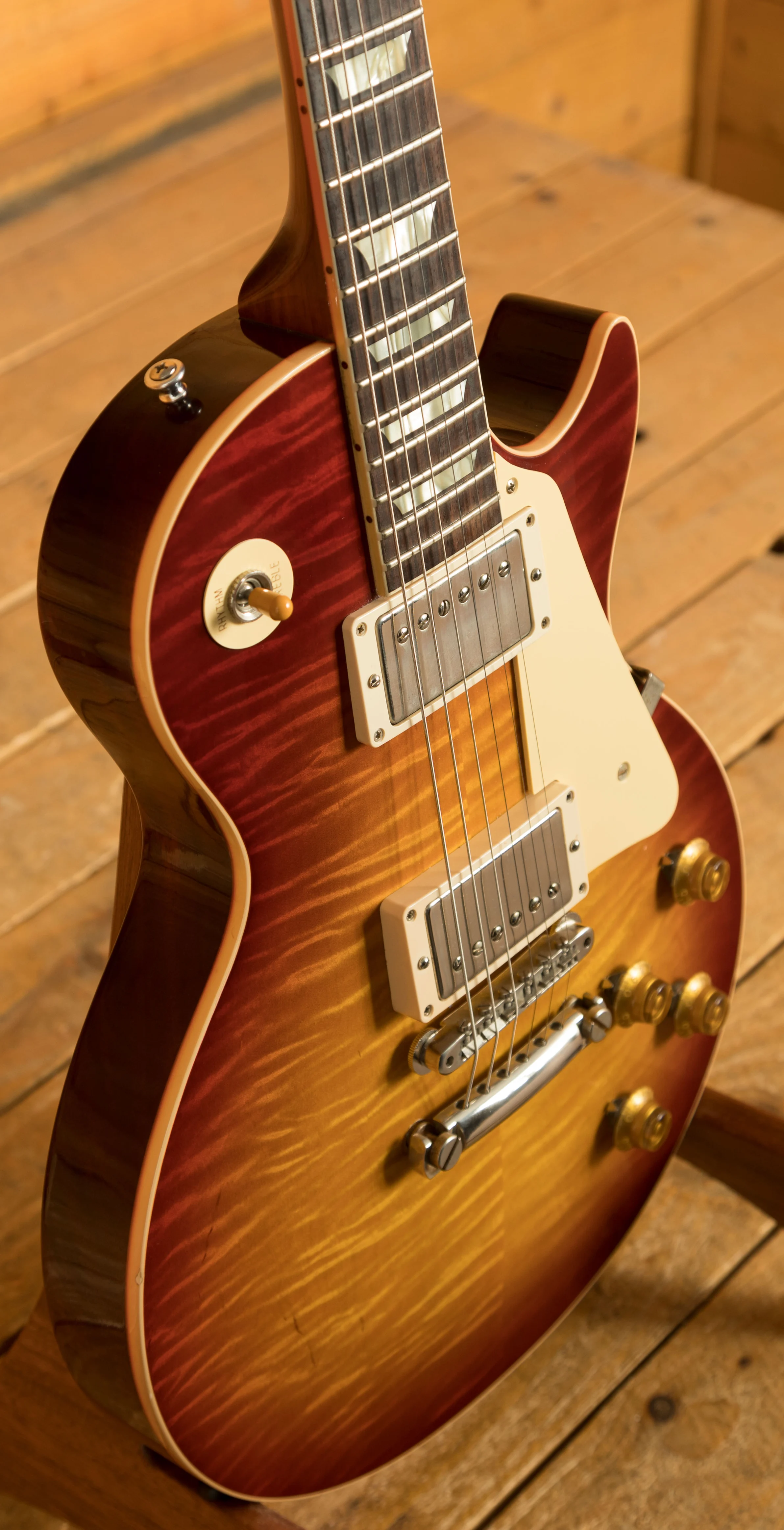 The Vintage Original Spec (VOS) finish is one of the highlights of the Gibson Custom Shop Historic Reissue series. The lightly aged nitrocellulose lacquer finish gives the guitar a patina that mimics the wear of an instrument that has been carefully played and maintained over decades. In this Deep Cherry Sunburst model, the nitro finish produces a mellow, vintage tone that gives the guitar an aura of authenticity. This particular guitar, being pre-owned, has some additional dings and scratches that further enhance its vintage vibe.