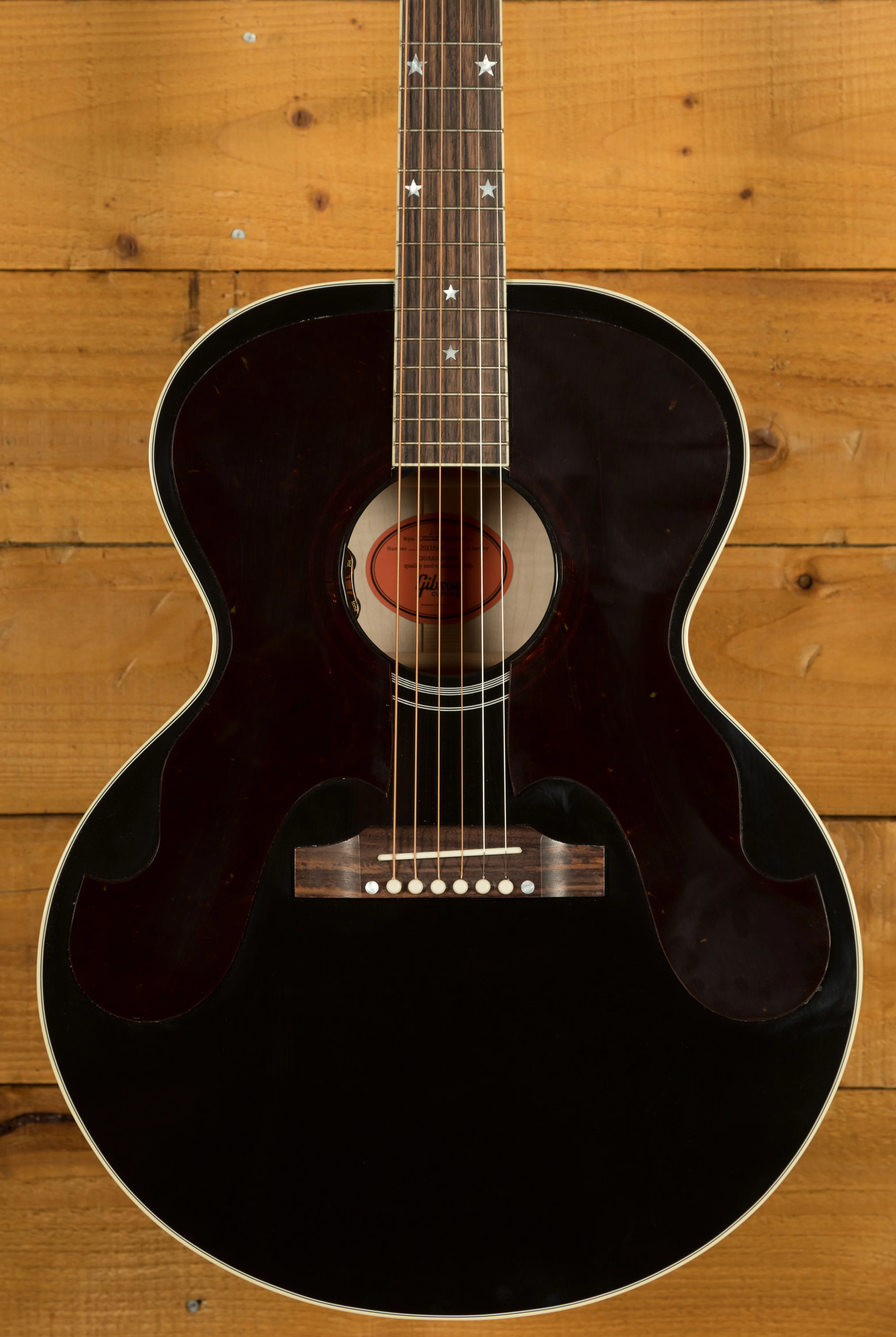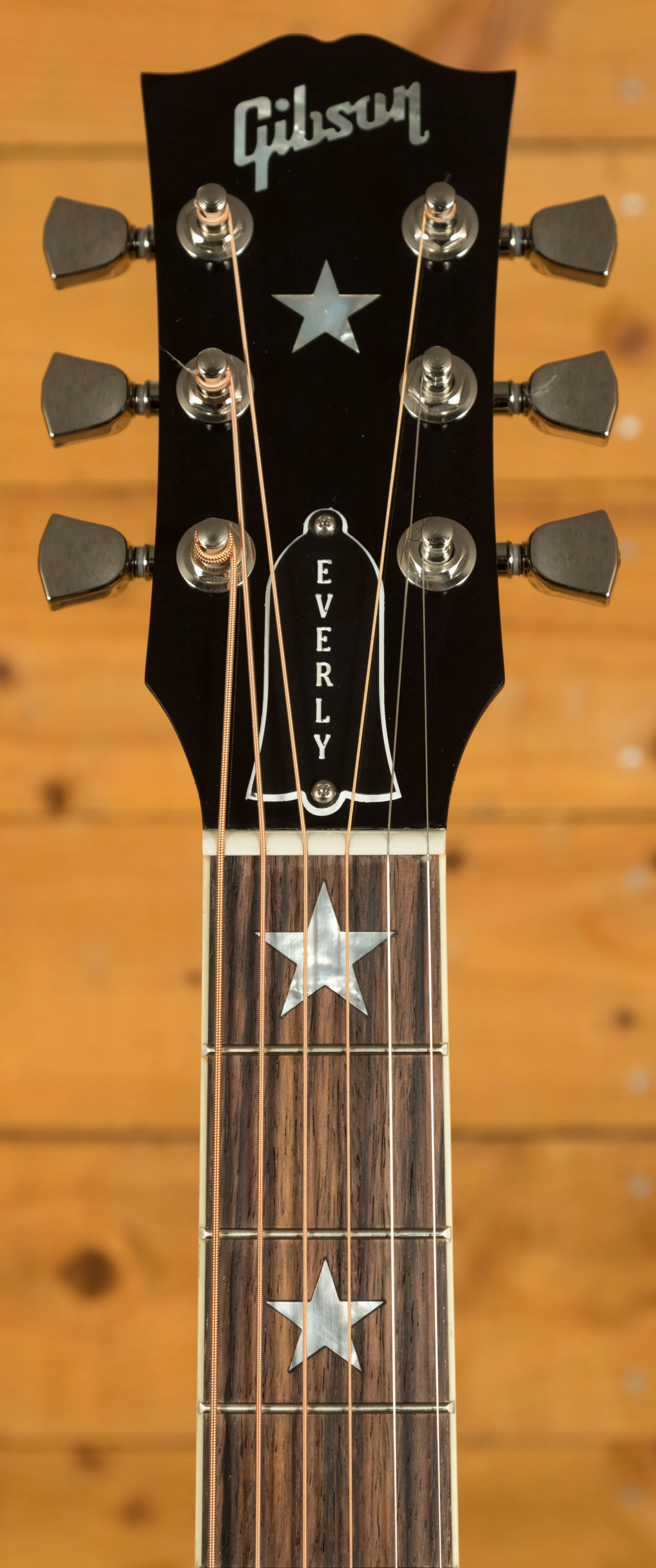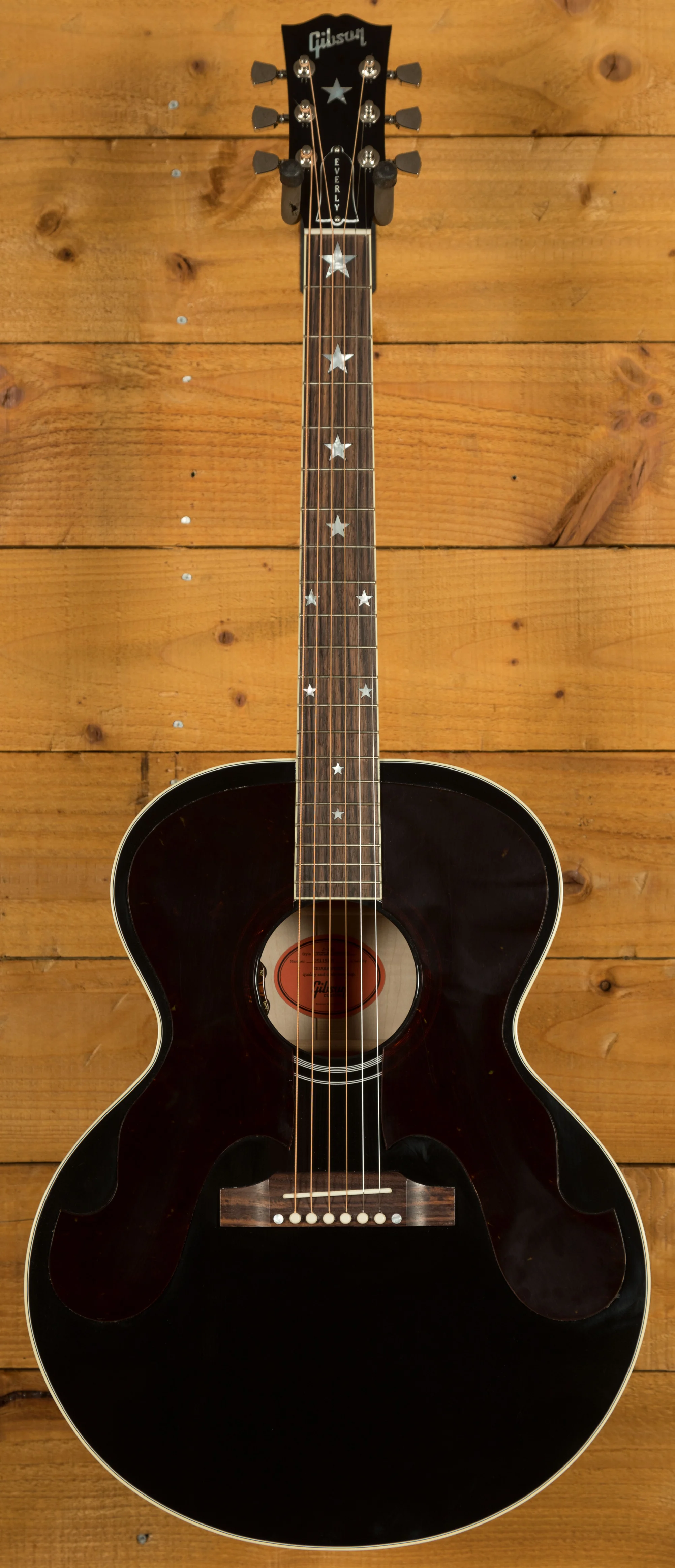 The guitar's distinctive aesthetic is defined by its double tortoise moustache pickguards, a feature designed in collaboration with the Everly Brothers themselves. Mother of pearl star inlays on the headstock and neck add a touch of elegance. The slim taper mahogany neck provides comfortable playability, while the Indian rosewood fingerboard with a 12-inch radius offers a smooth surface for fretting.