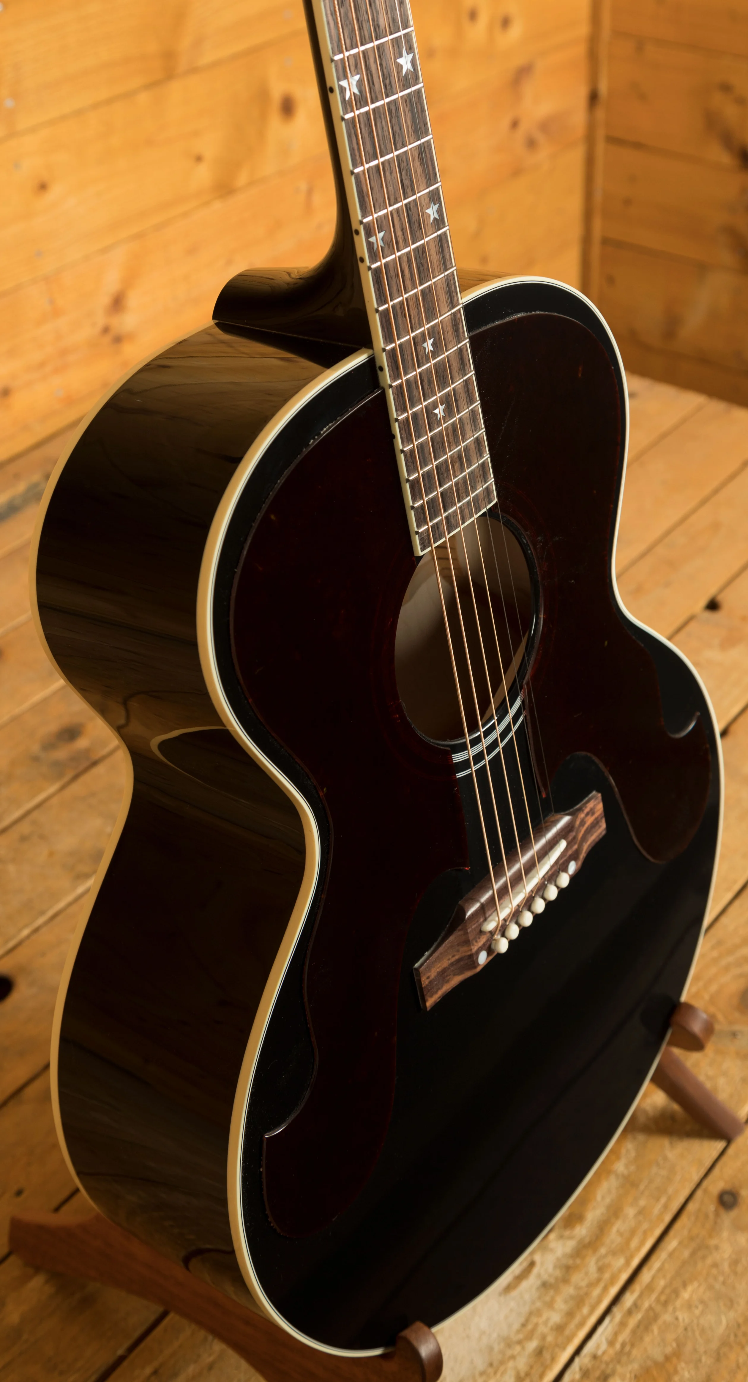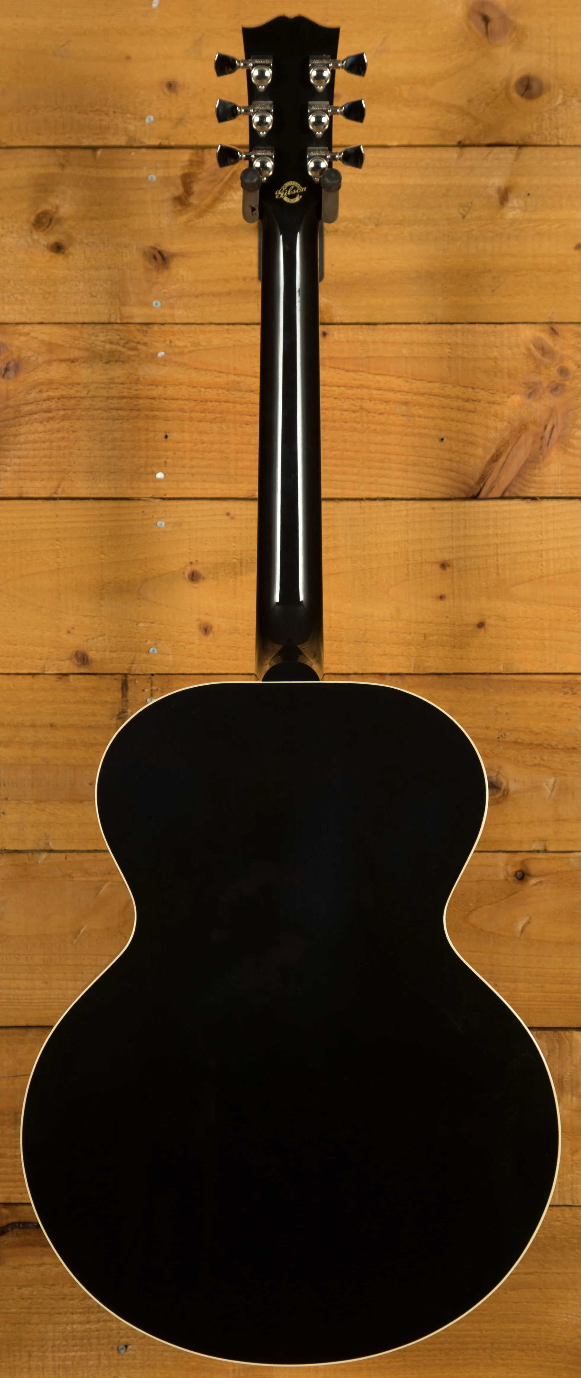 The J-180 features a maple body and a Sitka spruce top, a tonewood combination known for its balanced tone and projection. The traditional hand-scalloped X-bracing further enhances the resonance and responsiveness of the guitar. The ebony gloss nitrocellulose lacquer finish not only looks striking but also allows the wood to breathe and age gracefully.