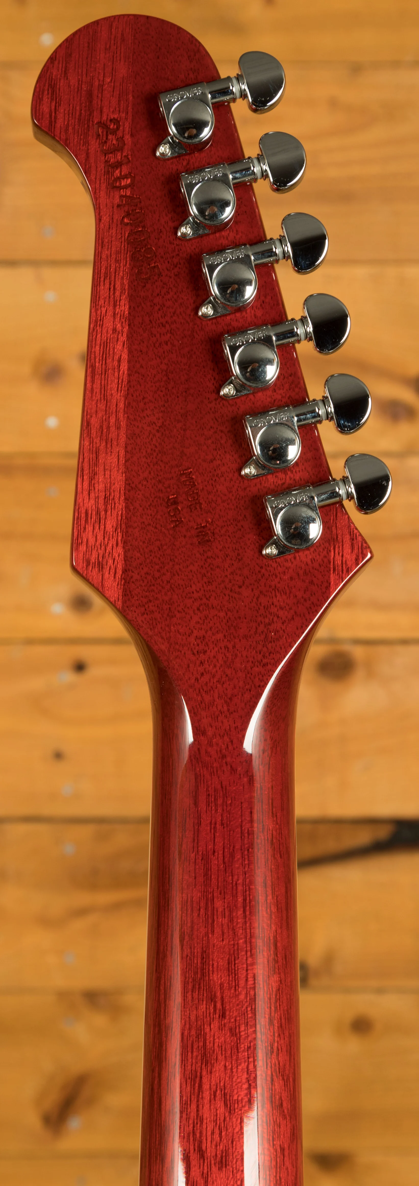 In the mid 1960s, the original Firebird design transitioned through several different iterations. One of the significant transitions that occurred flipped the headstock to the Non-Reverse shape. Unlike the original Reverse Firebird headstock design, which featured a two-layered headstock with a holly veneer, the new headstock was flat, like the bill of a platypus. Our friends at Gibson are thrilled to be re-issuing this lesser-known edition of the Firebird!