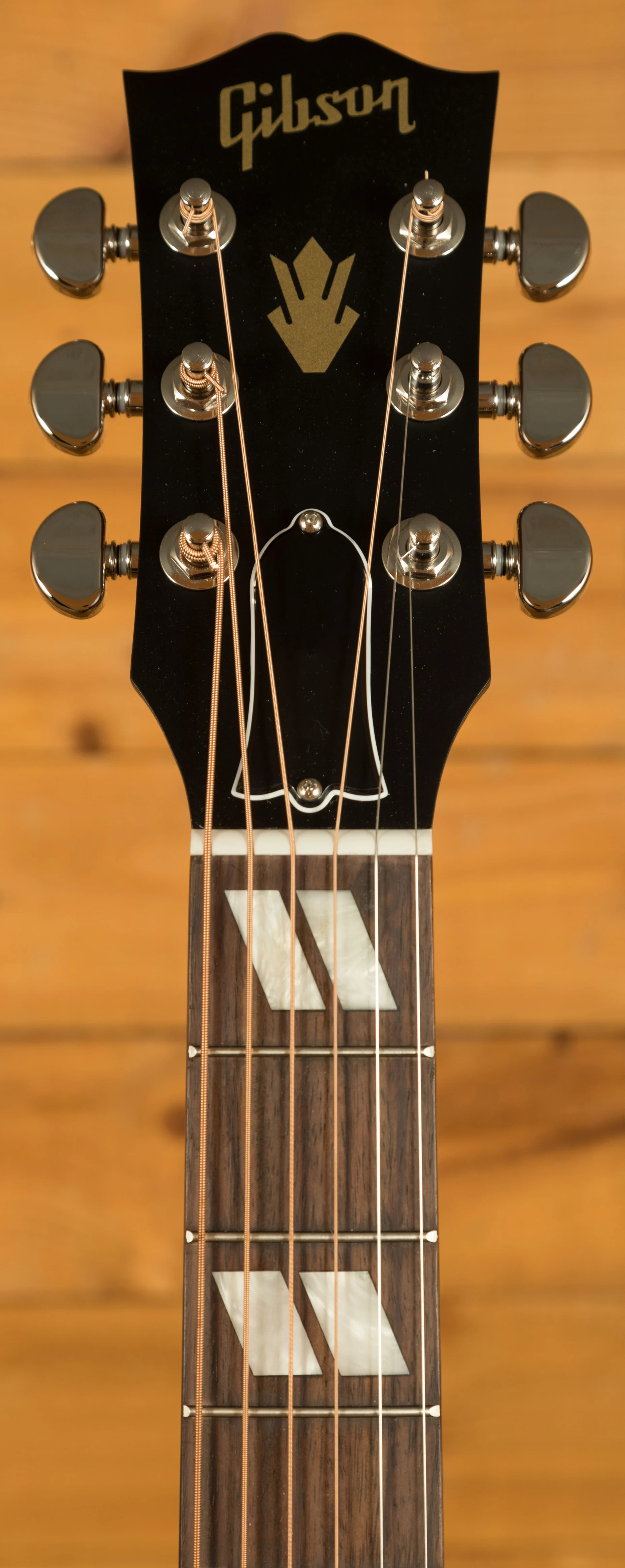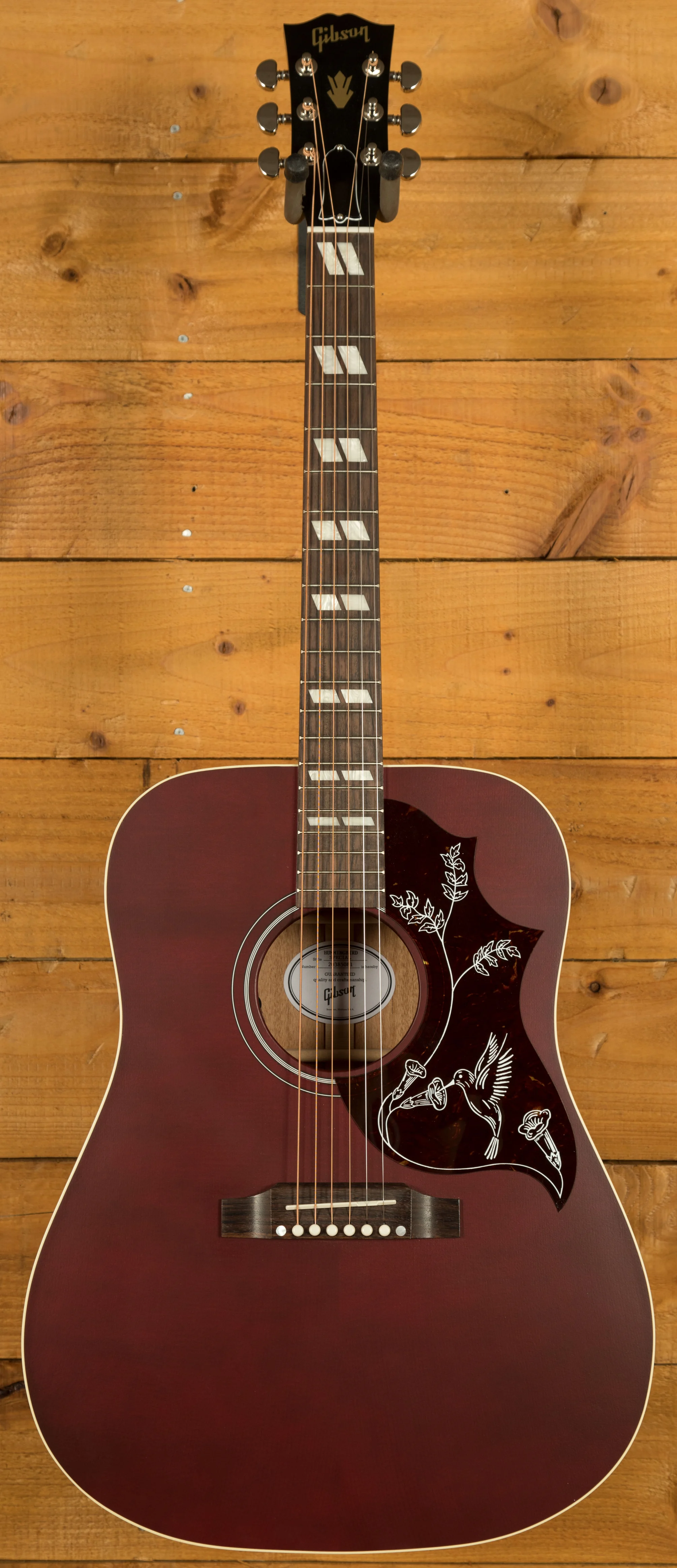 The Utile neck is attached to the body with a compound dovetail joint and is affixed with hot hide glue, which ensures great stability no matter the situation. The neck has a comfortable feeling Round profile, which allows for quick, fast movements. The Rosewood fretboard has a 12 radius, 20 frets, a 24.75 scale length, a 43.815mm nut width, and pearloid parallelogram inlays, which is one of the visual hallmarks that makes the Hummingbird easily recognisable.