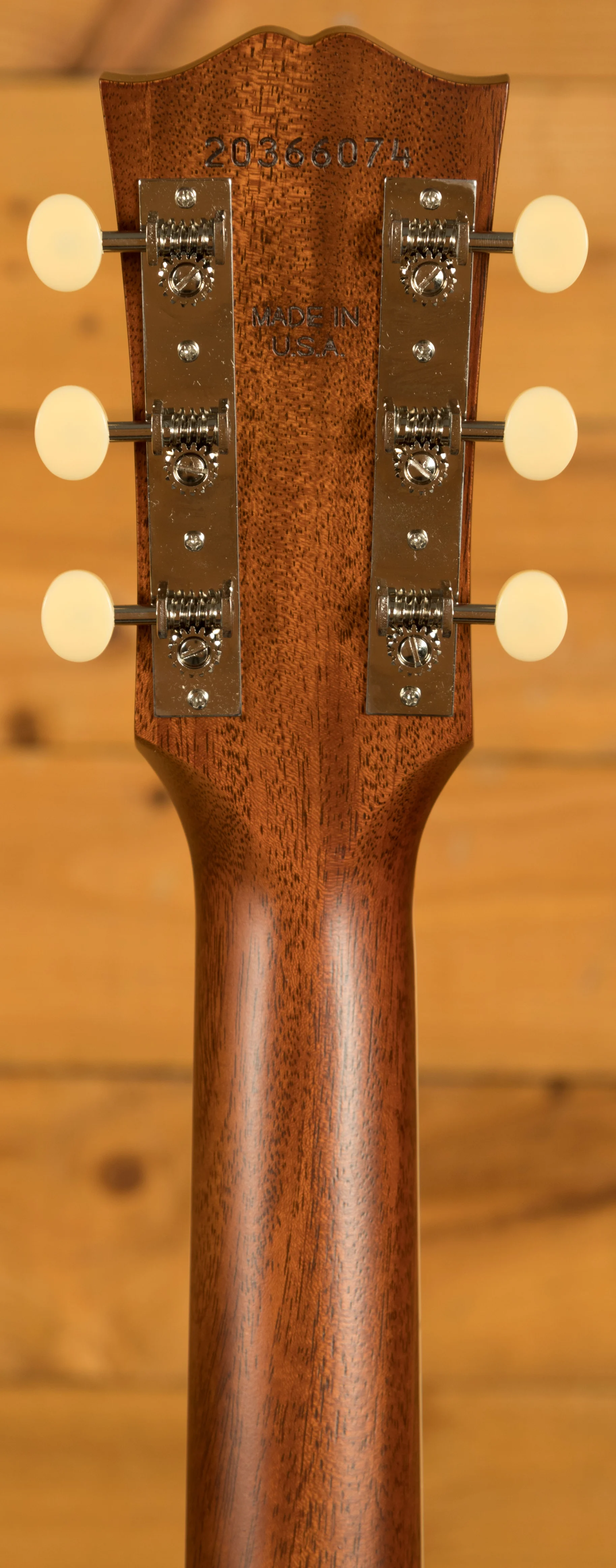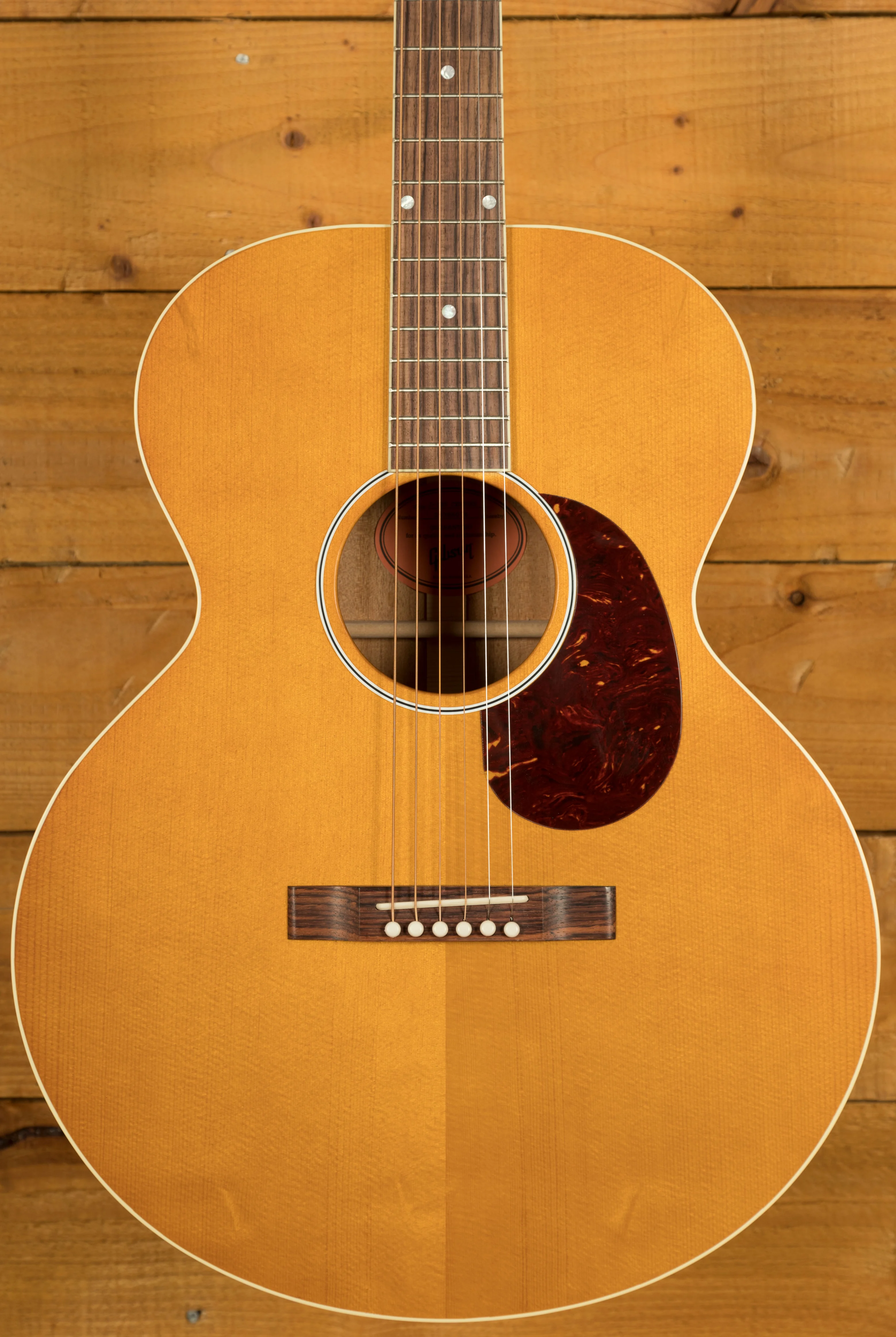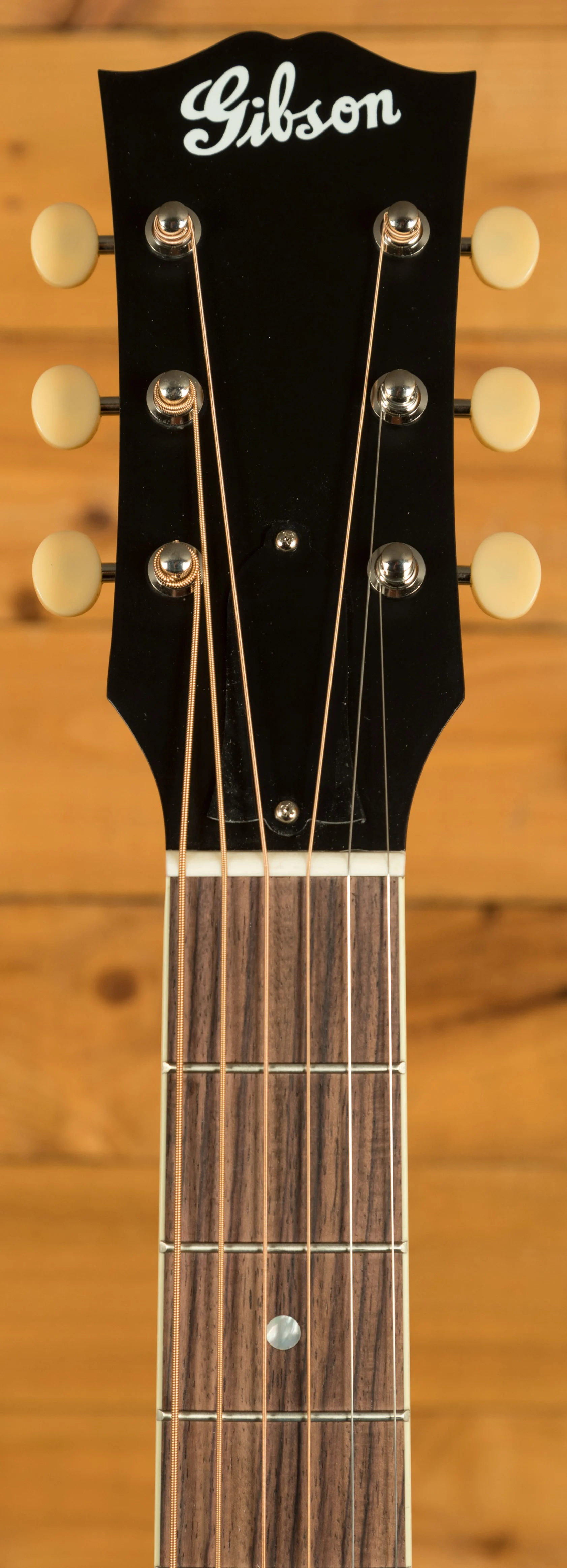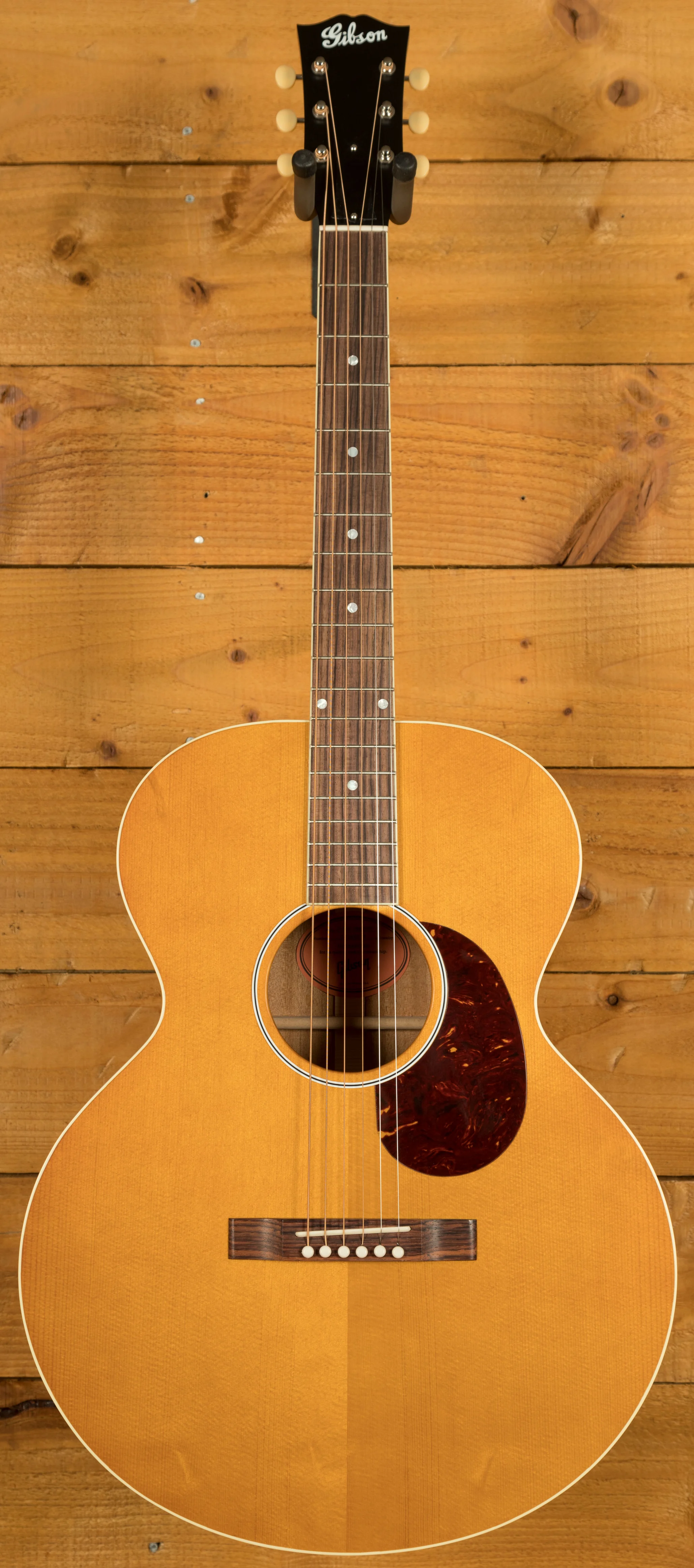 Across this model you’ve got a bunch of vintage inspired appointments that really make this guitar standout. The headstock features open-back Golden Age strap tuners, alongside an early 1900s-style Gibson script logo. The body also features a sloped-rectangle closed-slot bridge crafted from Rosewood.