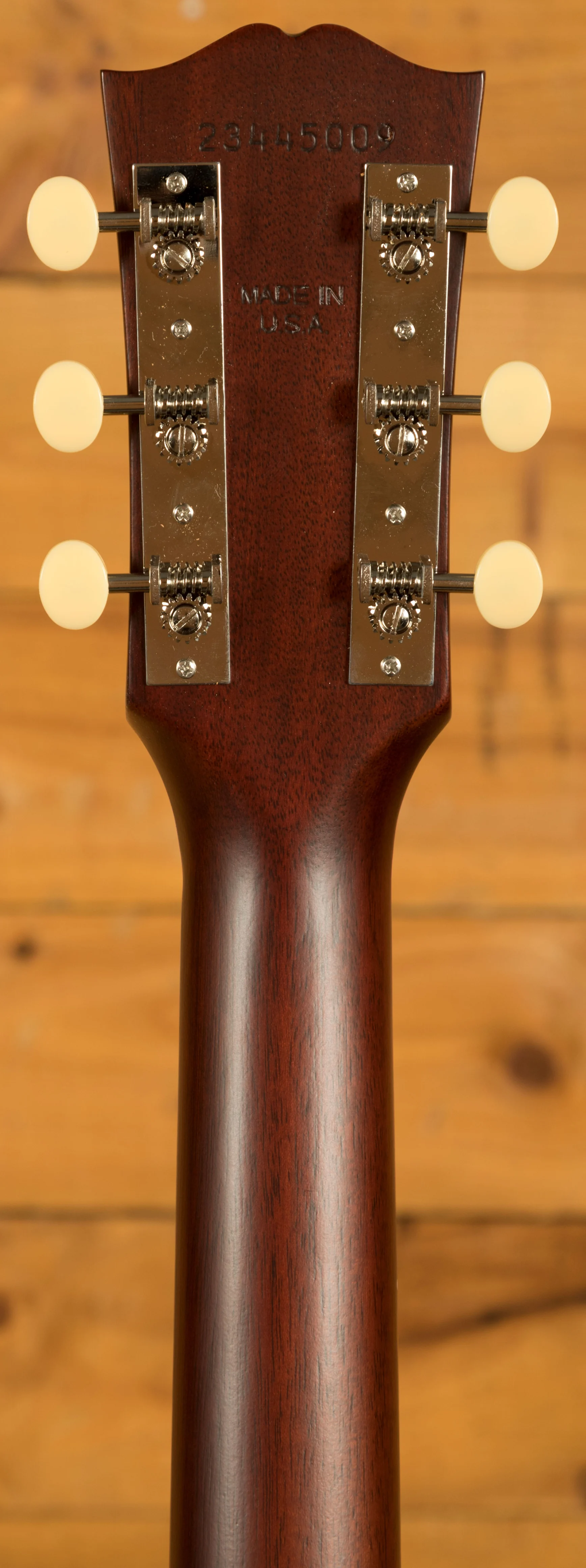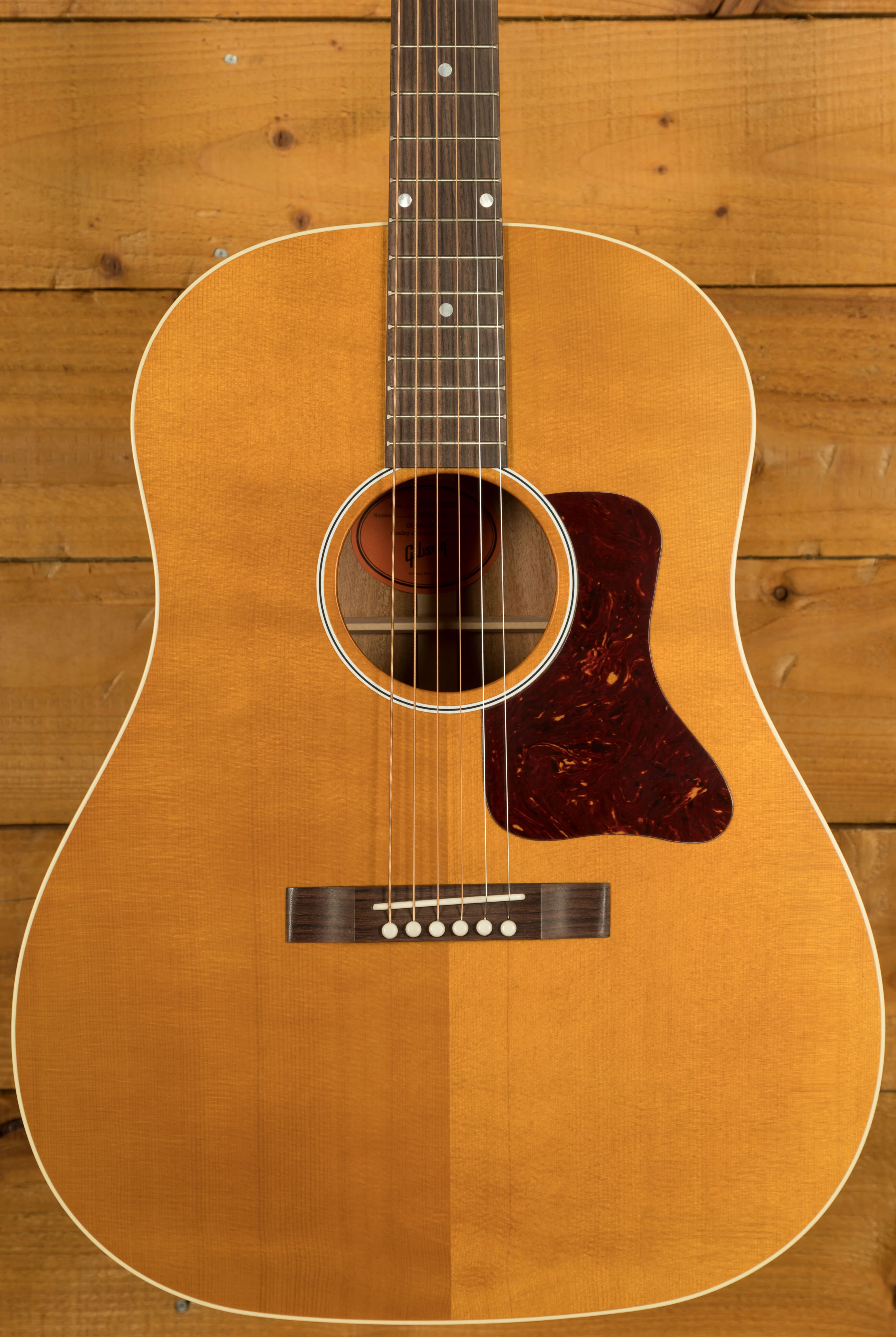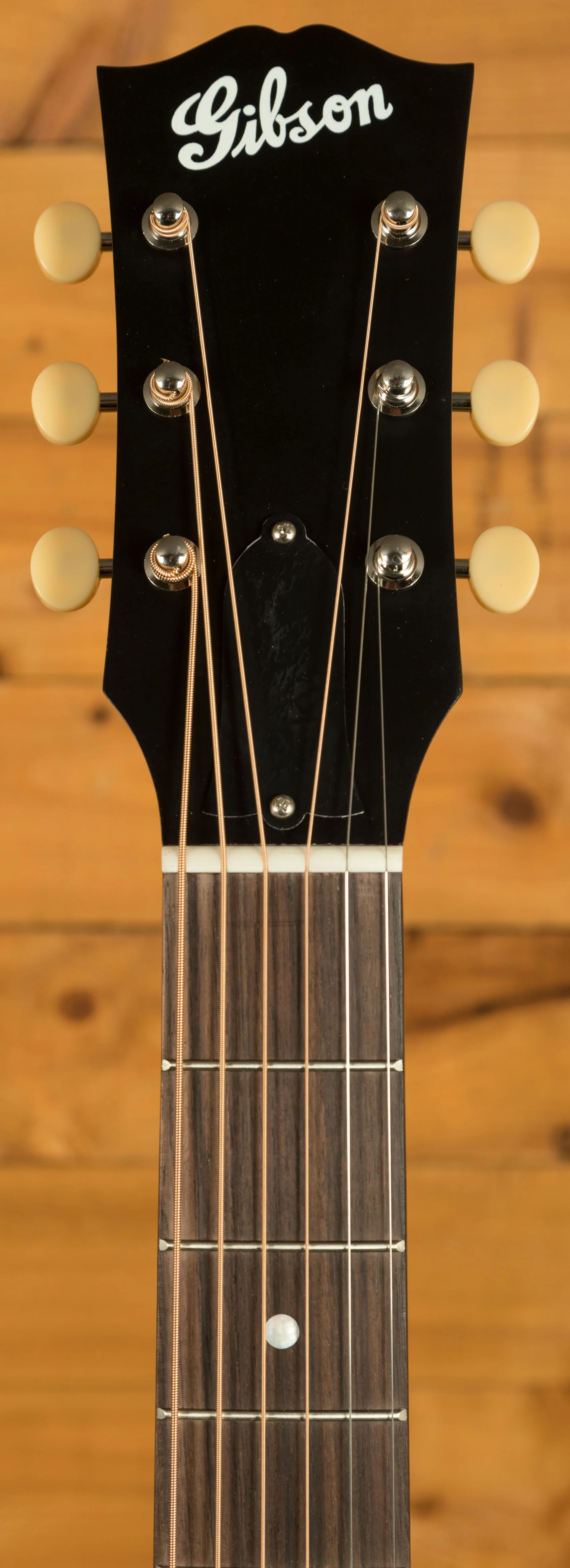 Across this model you’ve got a bunch of vintage inspired appointments that really make this guitar standout. The headstock features open-back Golden Age strap tuners, alongside an early 1900s-style Gibson script logo. The body also features a sloped-rectangle closed-slot bridge crafted from Rosewood.