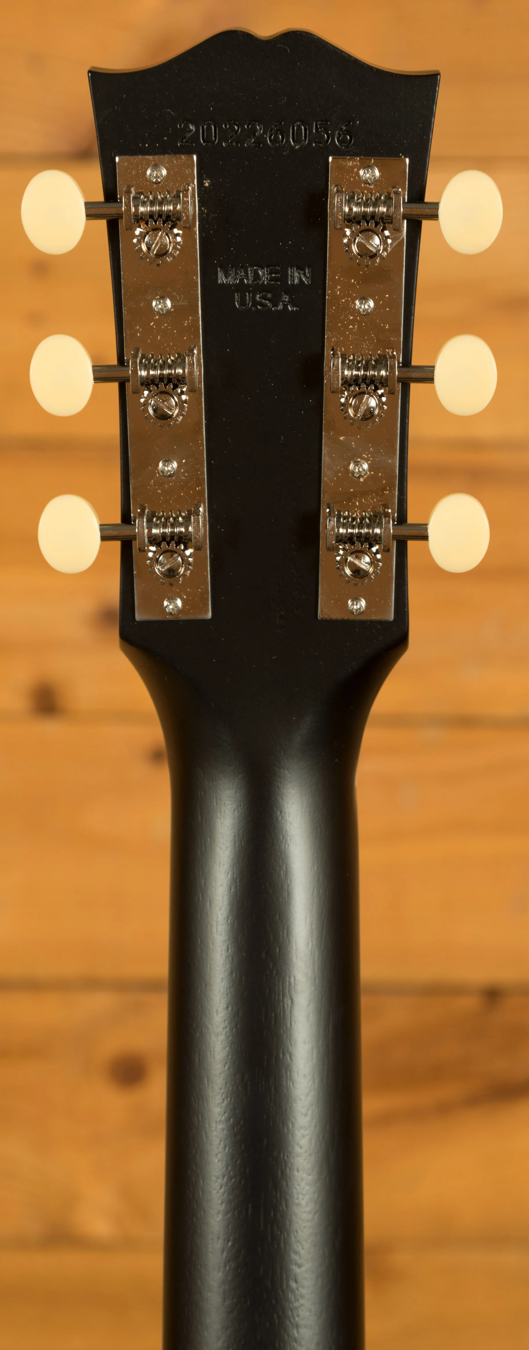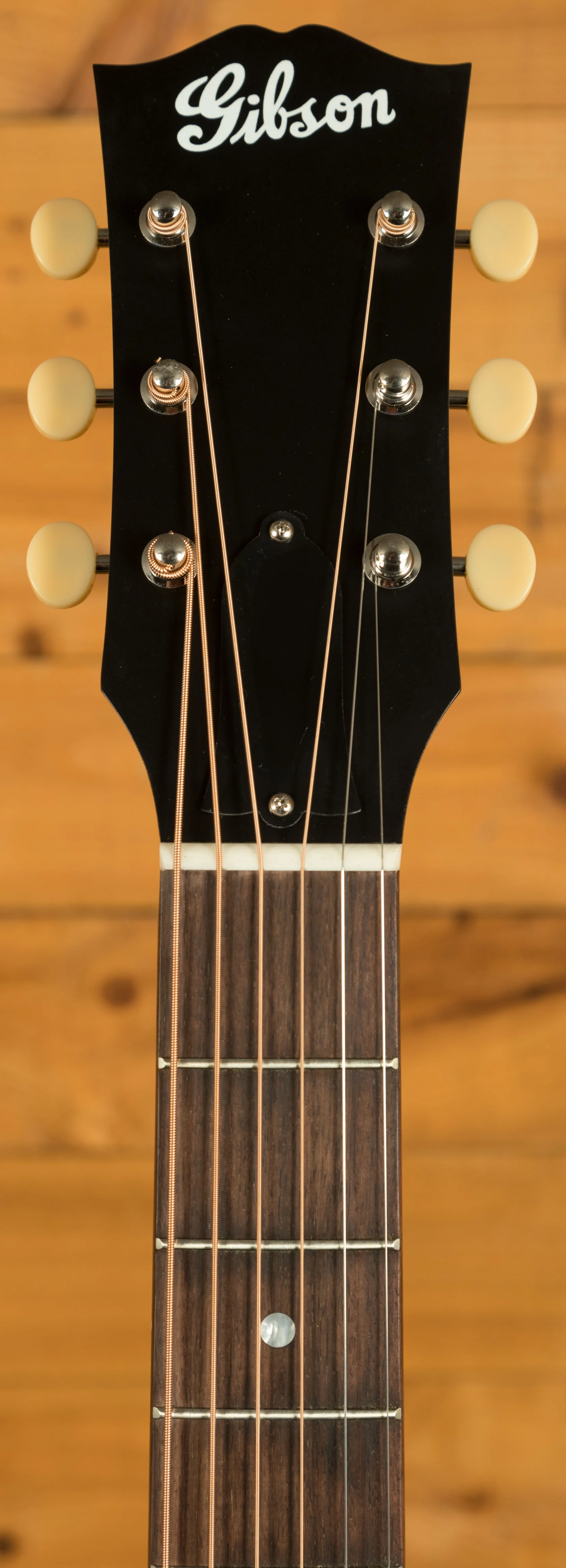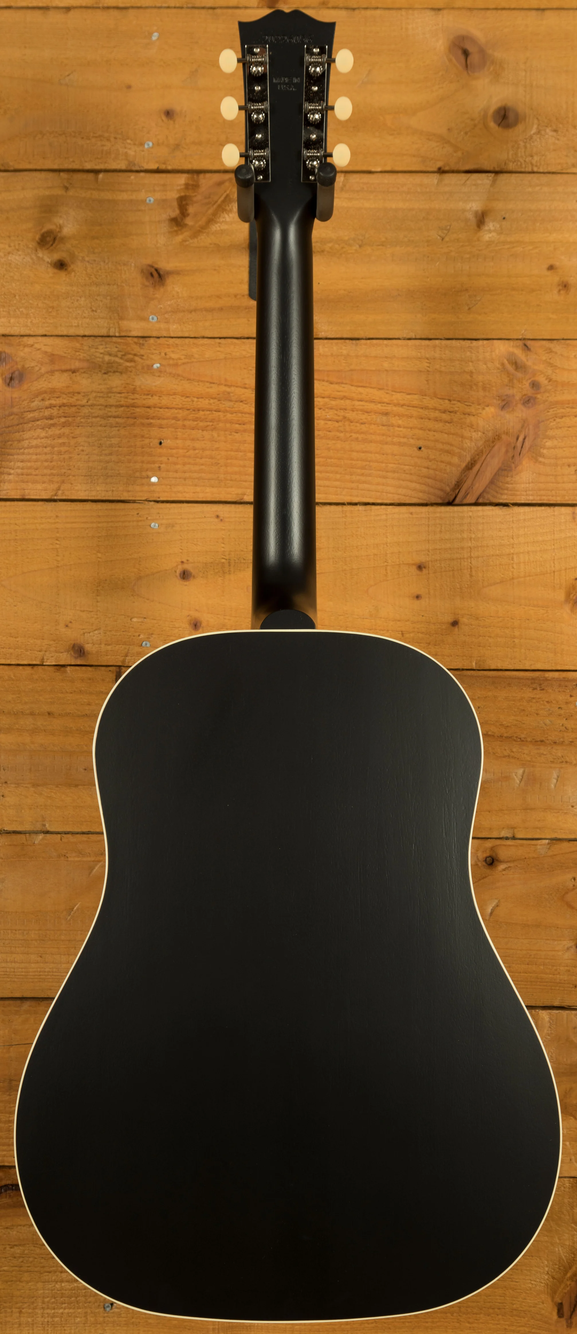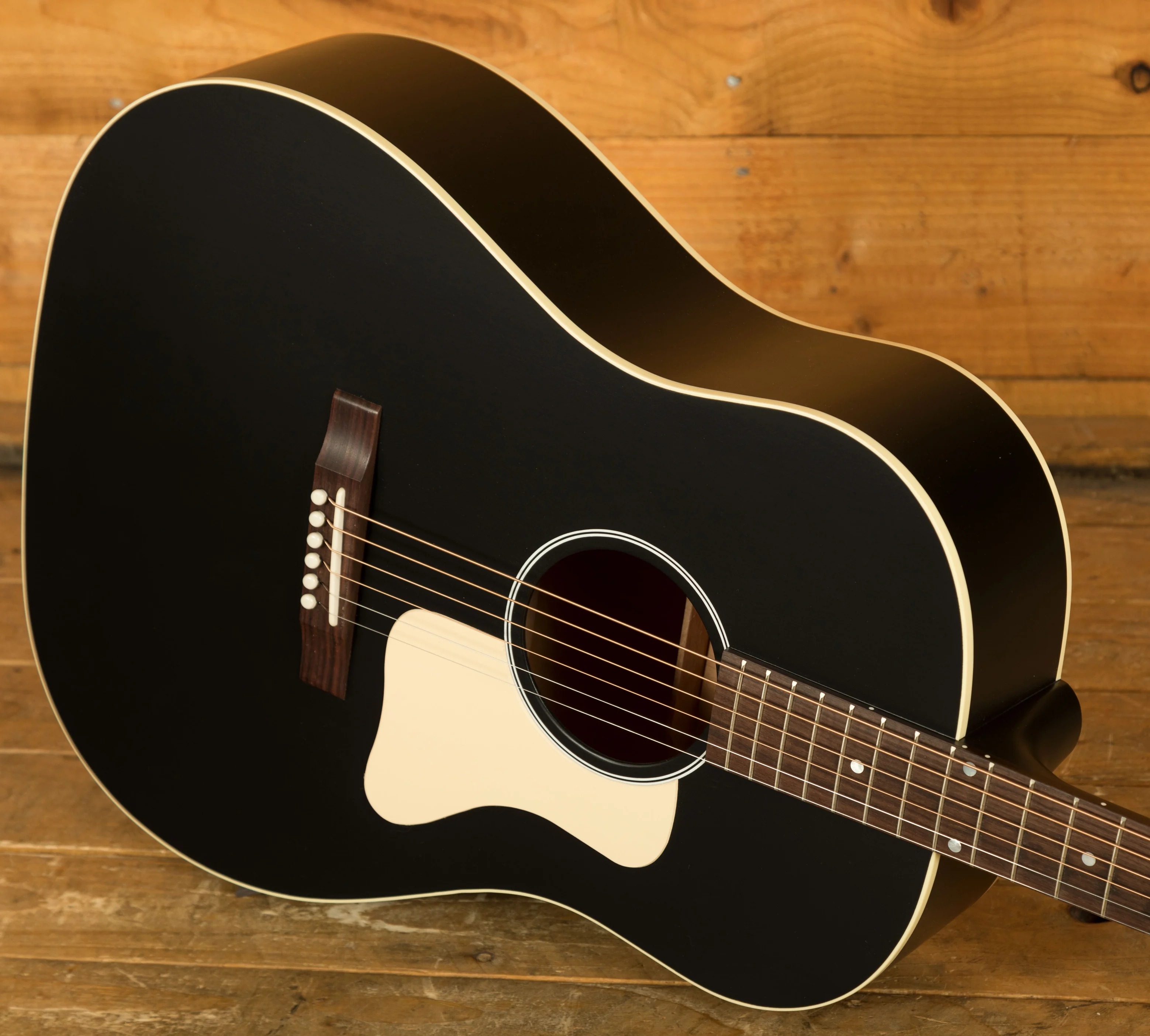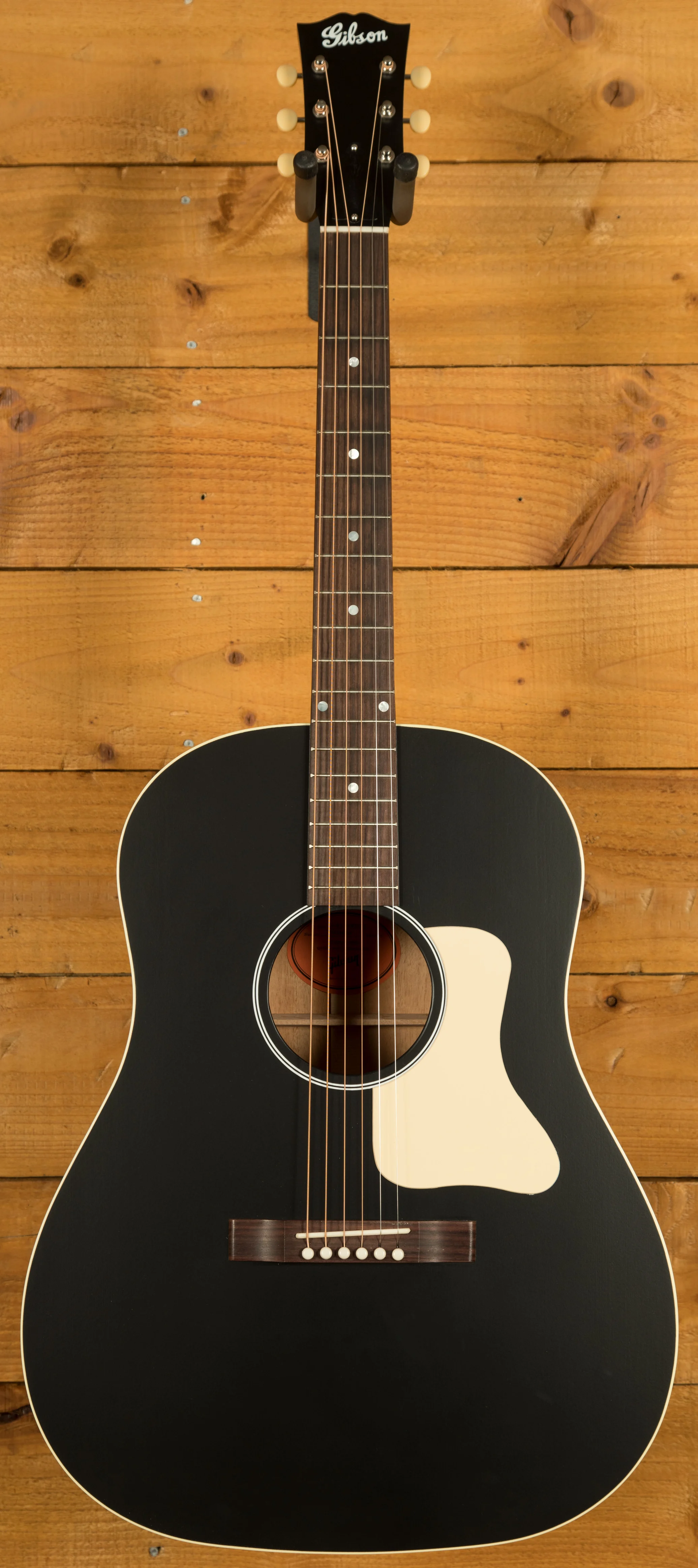 Across this model you’ve got a bunch of vintage inspired appointments that really make this guitar standout. The headstock features open-back Golden Age strap tuners, alongside an early 1900s-style Gibson script logo. The body also features a sloped-rectangle closed-slot bridge crafted from Rosewood.