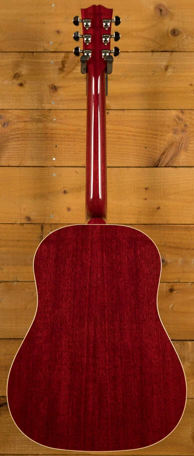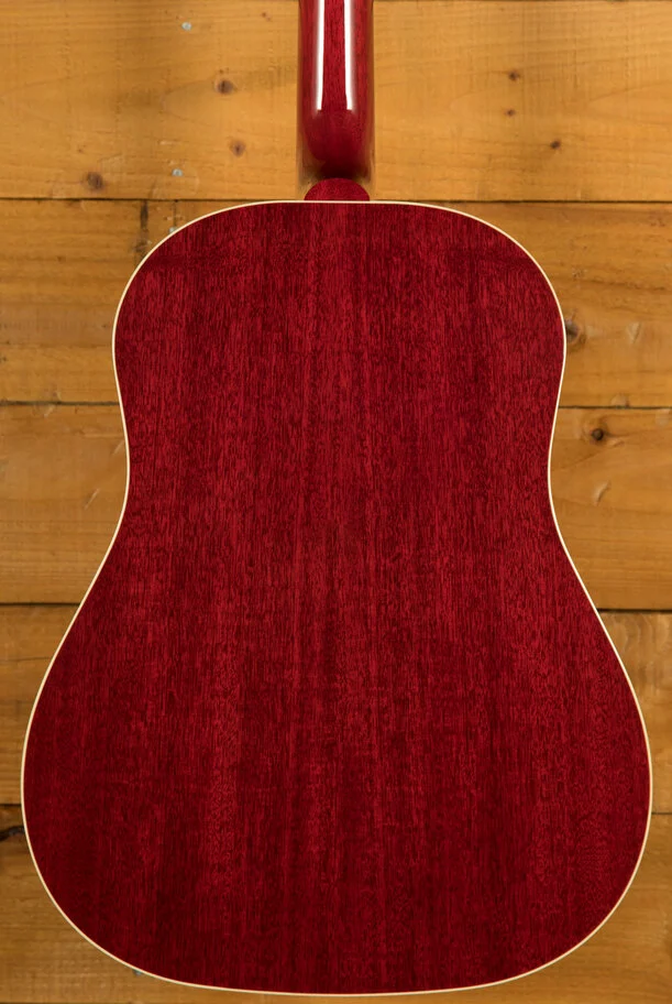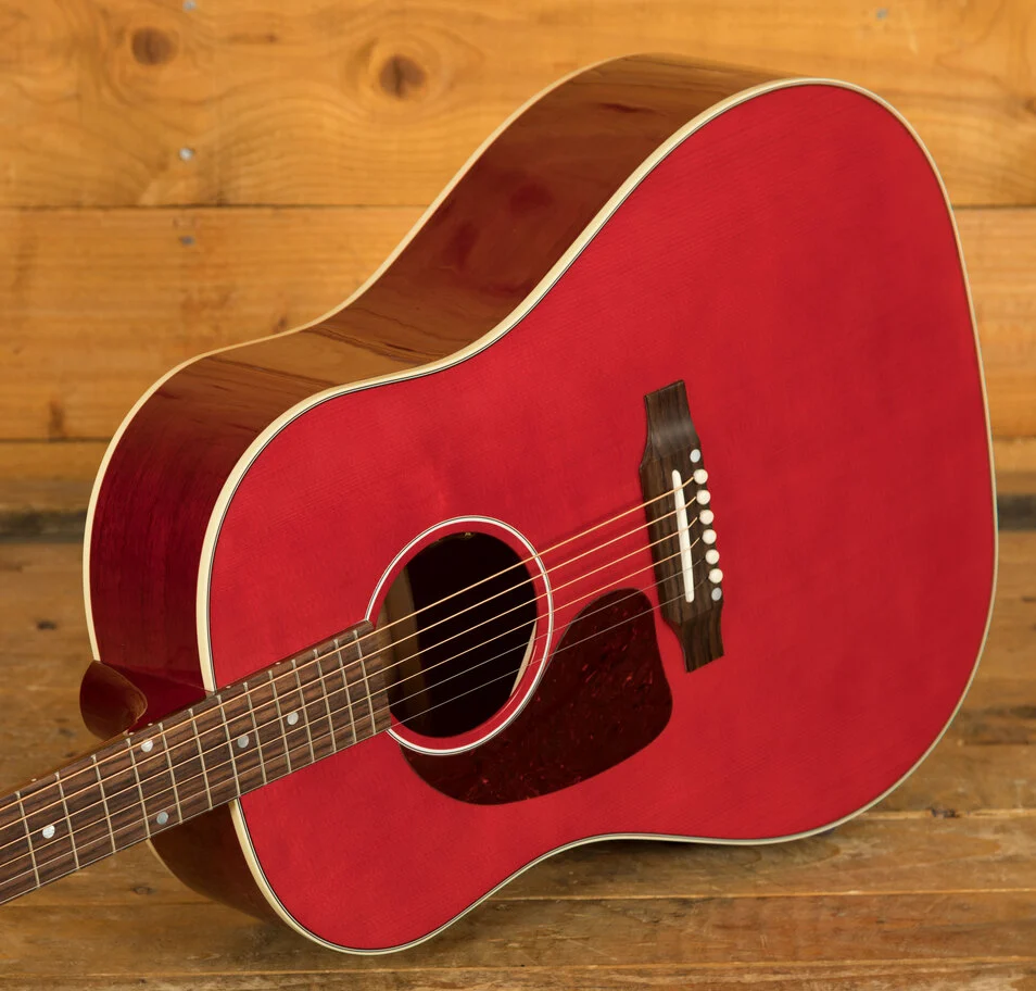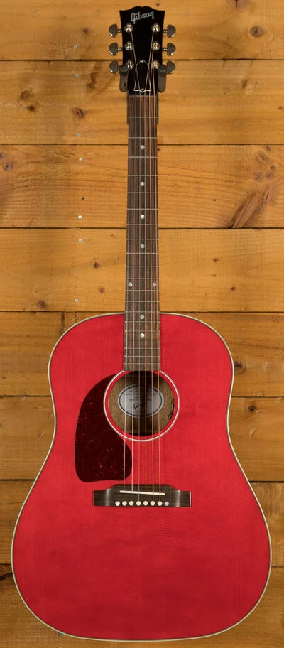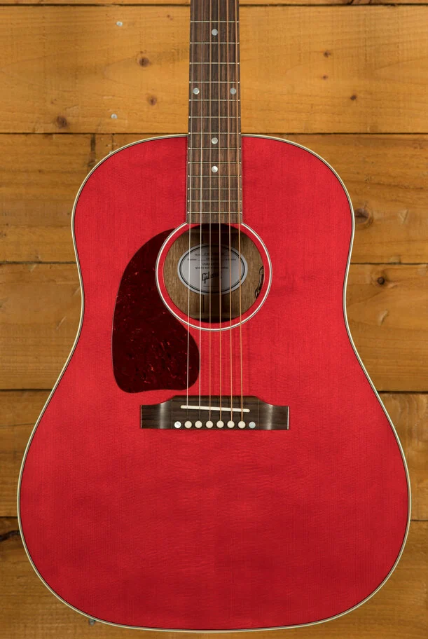 The Gibson J-45 has a long and storied history, dating back to its introduction in 1942. Nicknamed "The Workhorse," it has become a best-selling acoustic guitar for Gibson, known for its versatile sound and robust construction. This iconic round-shoulder dreadnought model has served as a reliable instrument for countless musicians across genres. The J-45 Standard Cherry builds on this legacy, offering a refined version of this classic design.