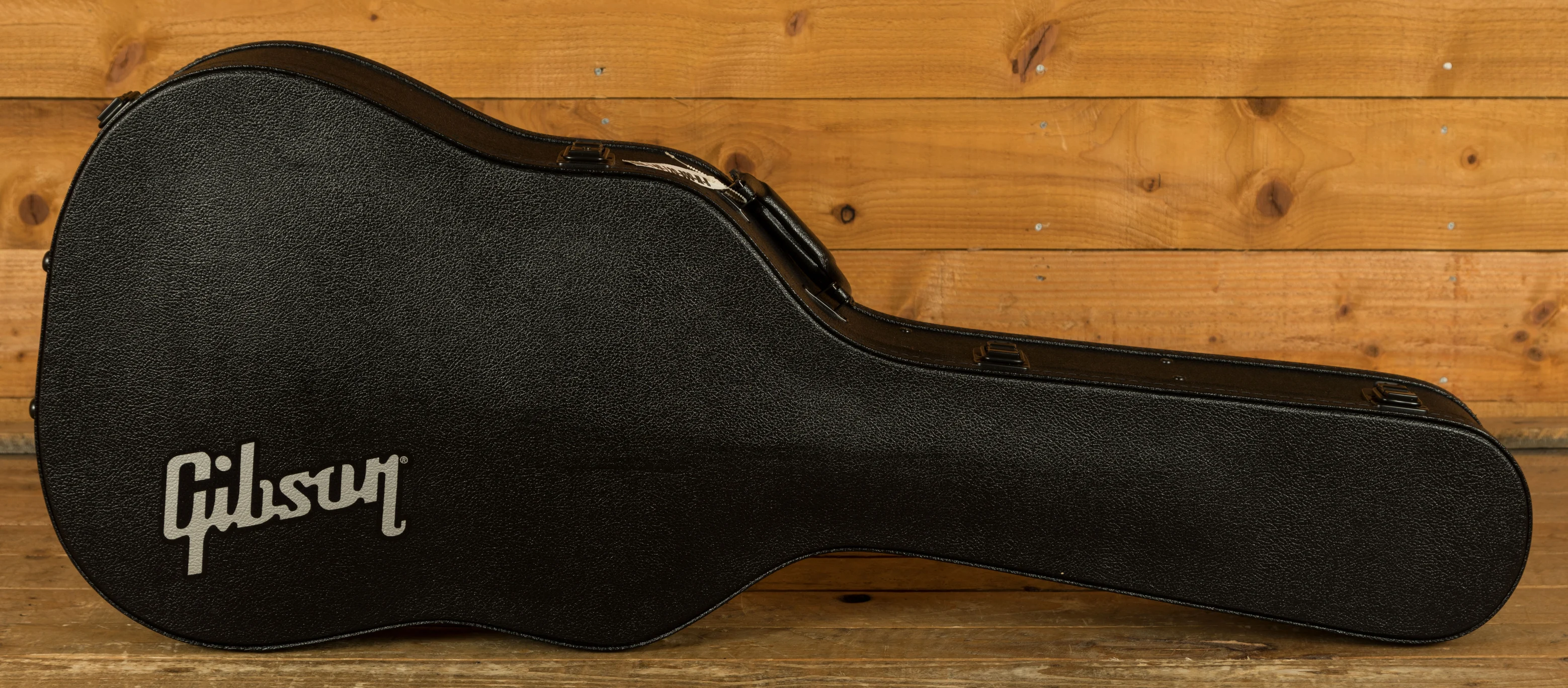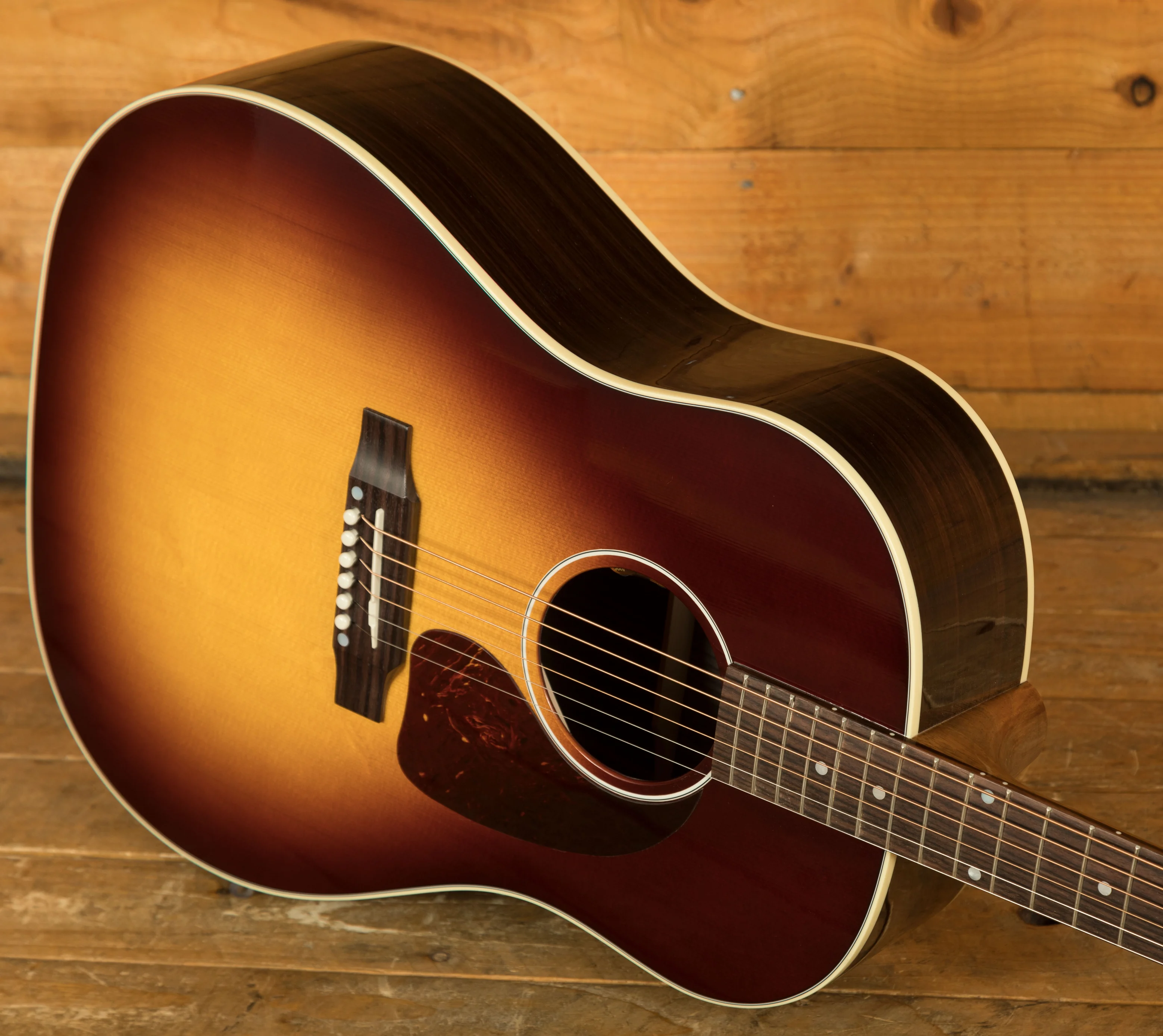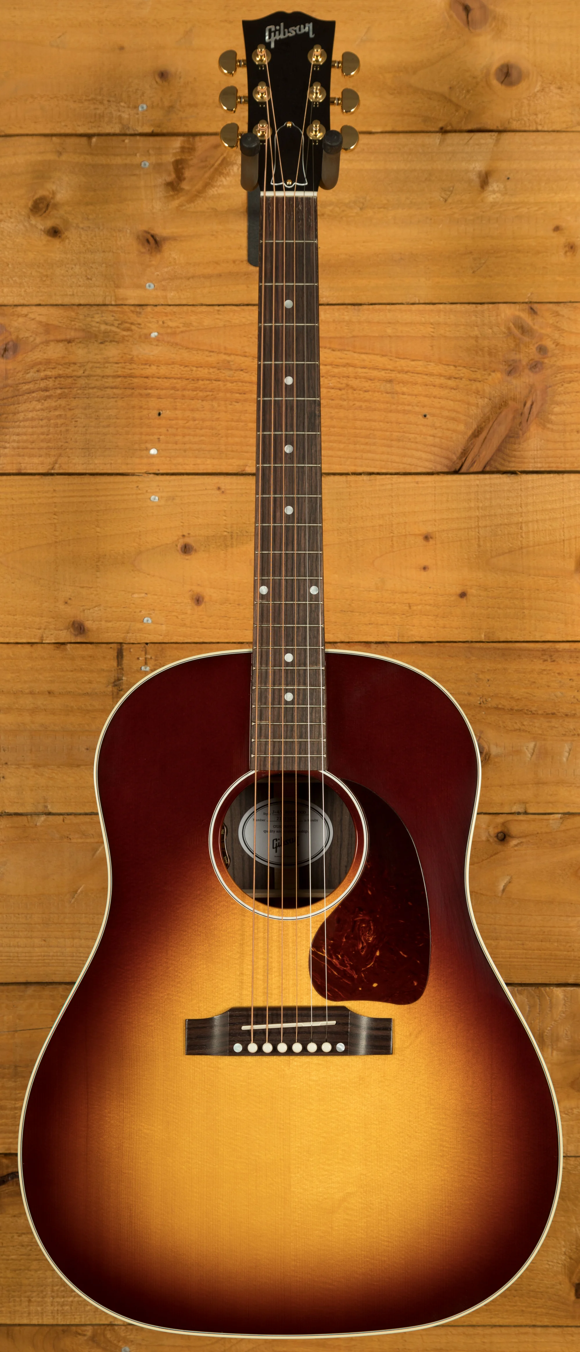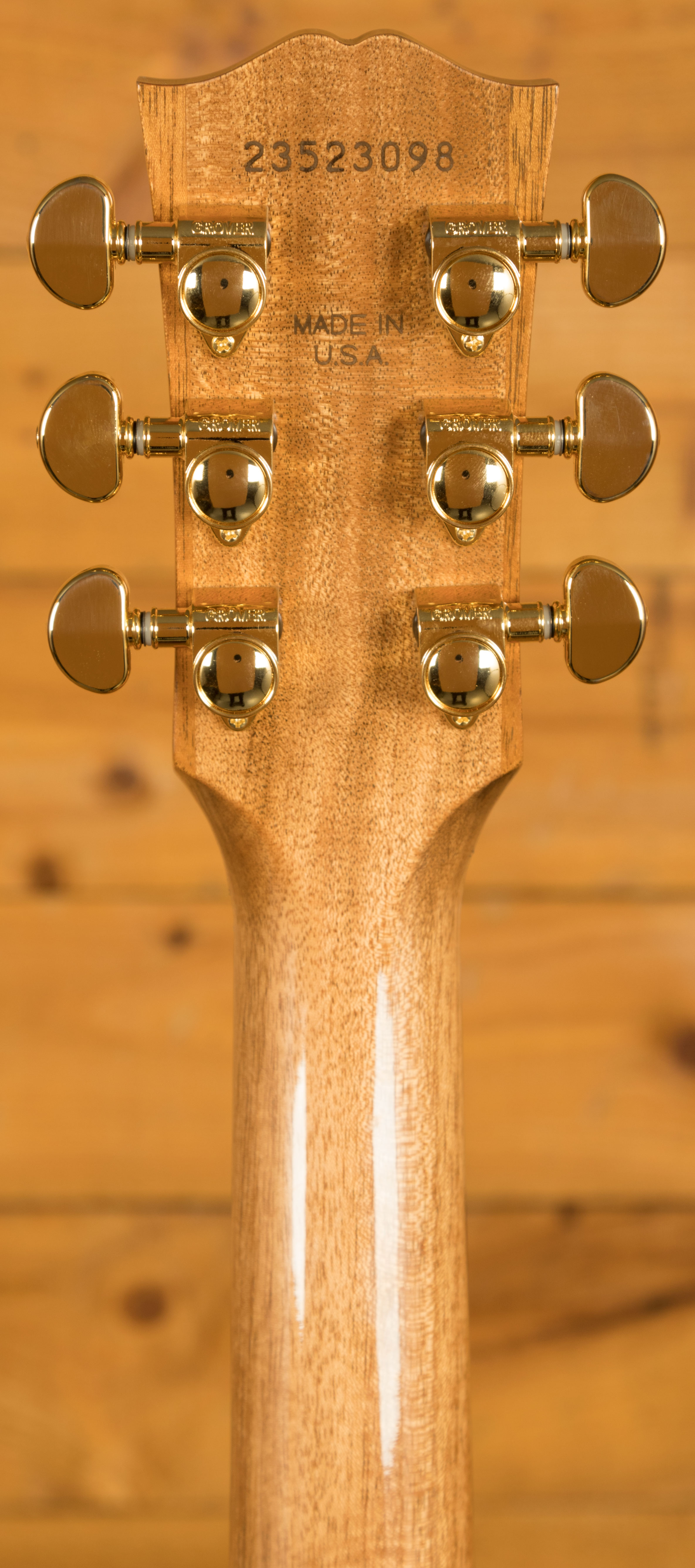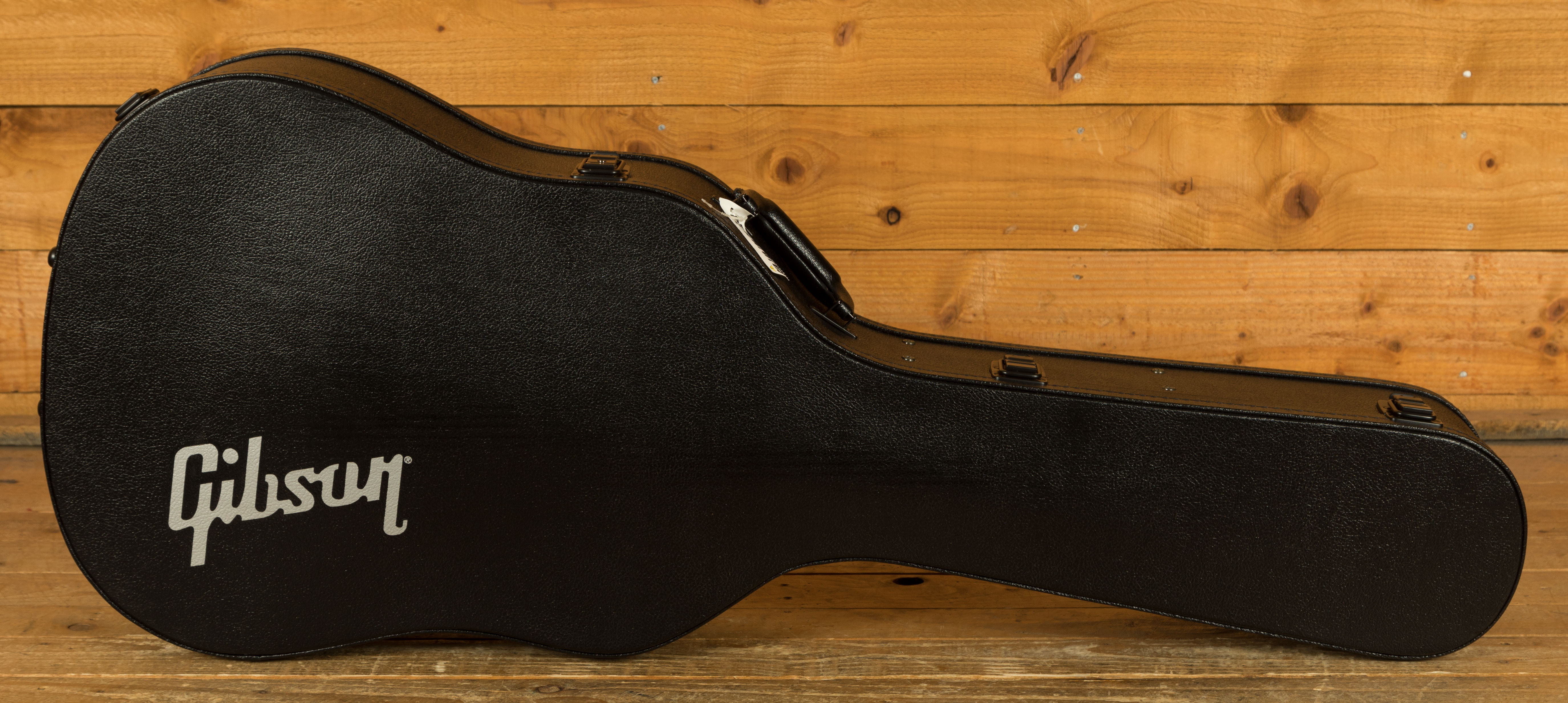 The guitar is finished with a gloss nitrocellulose lacquer, which protects the wood and allows it to breathe and age gracefully. It comes with a Gibson hardshell case for safe storage and transport. The guitar is strung with .012-.053 gauge strings. A tortoise teardrop pickguard complements the guitar's aesthetics. The truss rod is adjustable, allowing for fine-tuning of the neck relief. The guitar also features a 2-ply black bell truss rod cover and TUSQ bridge pins.