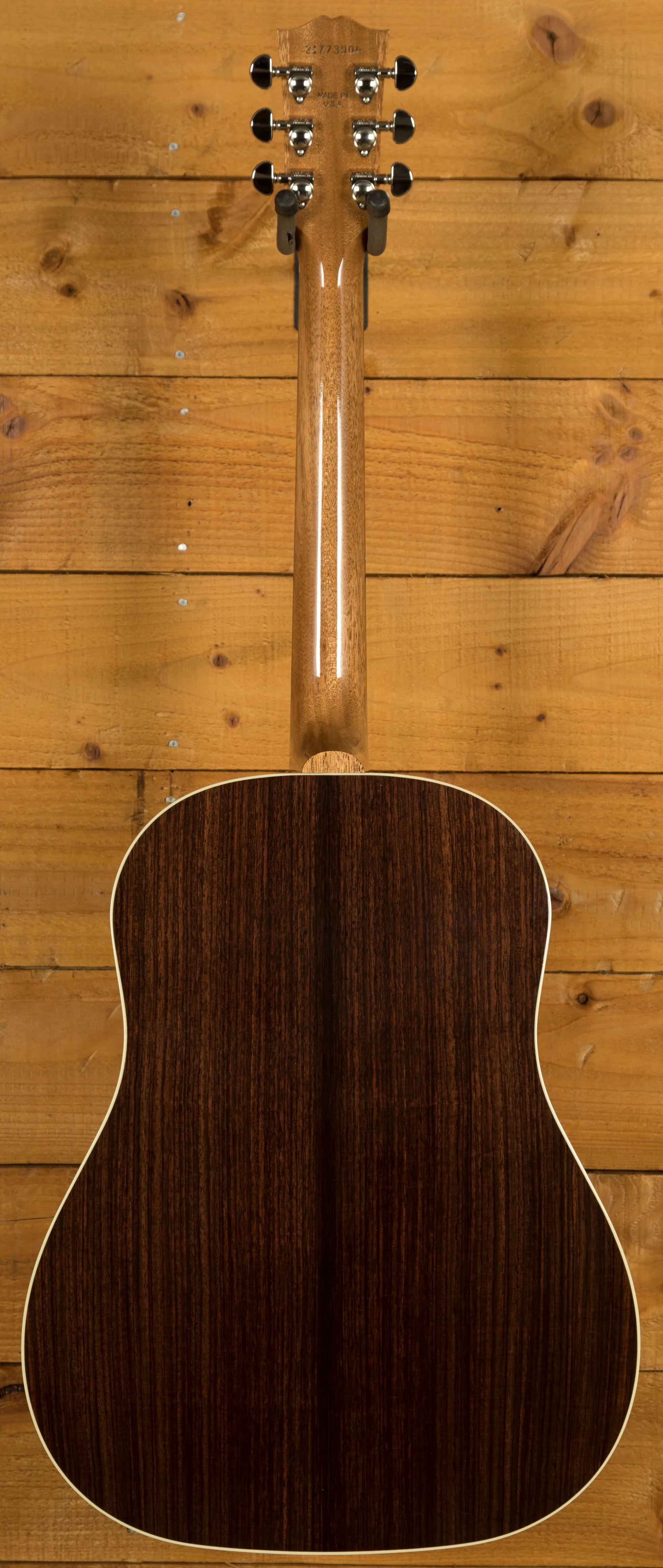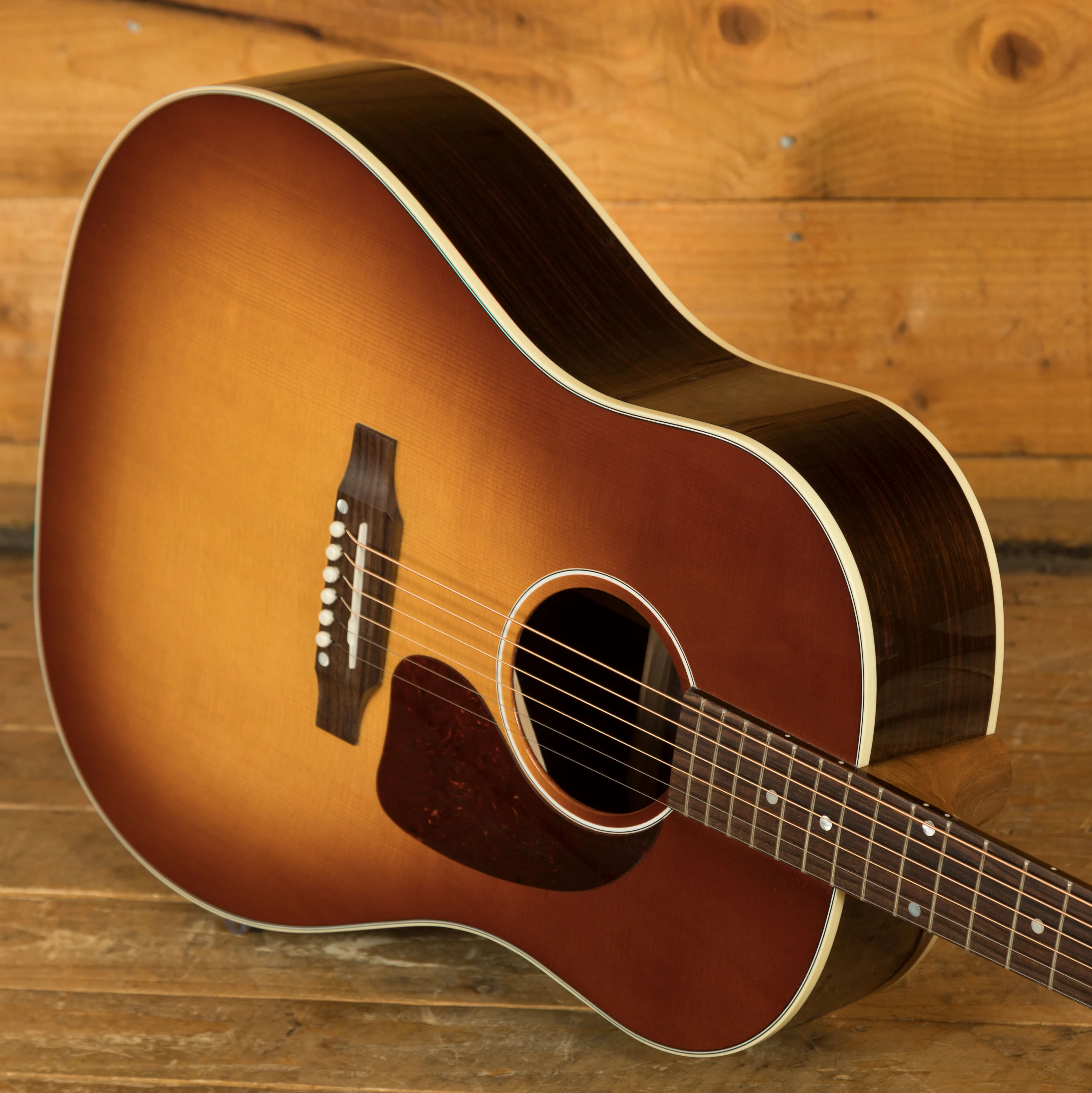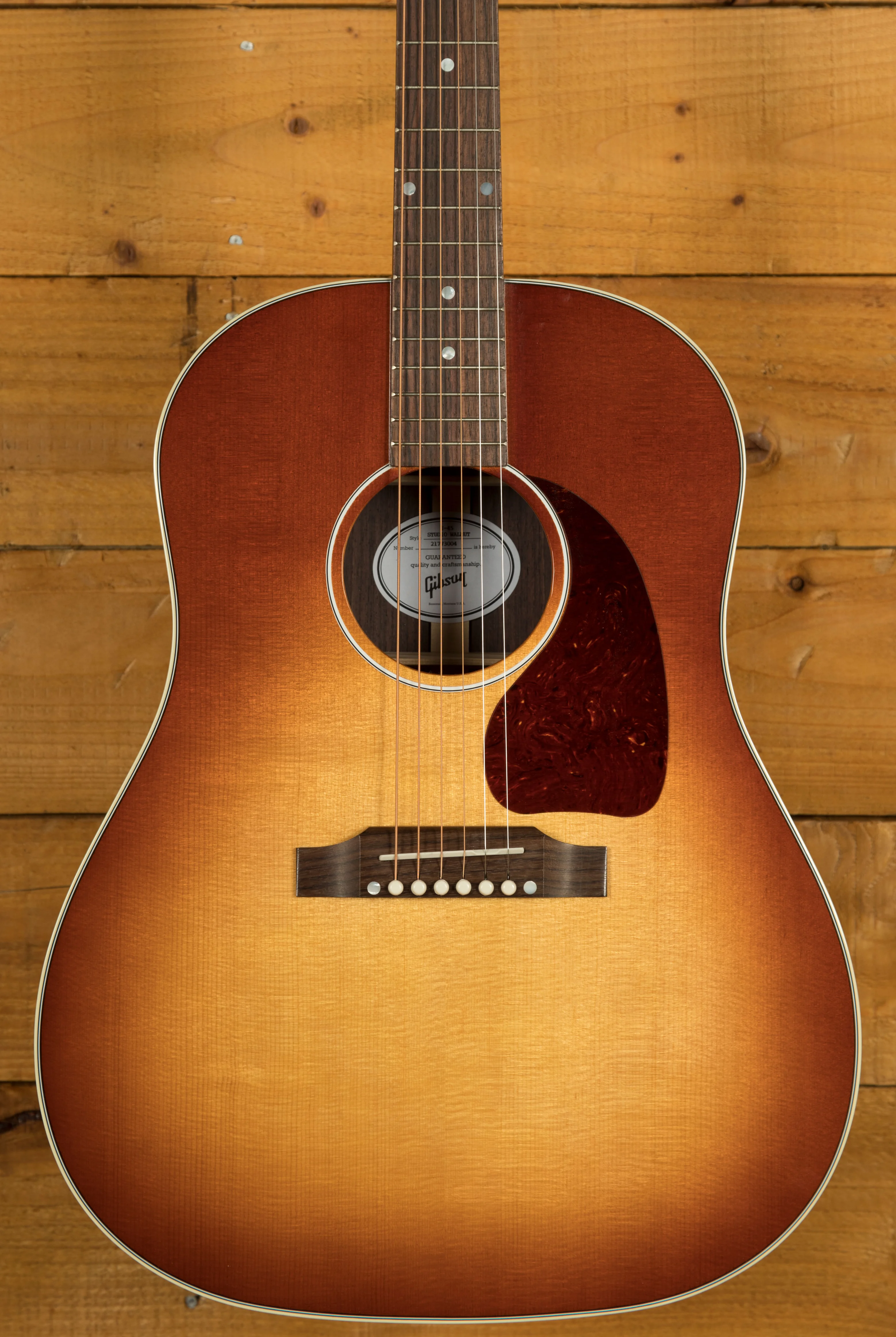 The J-45 Studio Rosewood Satin Rosewood Burst features traditional hand-scalloped X-bracing, which enhances the top's resonance and contributes to the guitar's overall projection. The body is bound with multi-ply binding on the top and single-ply binding on the back. The satin nitrocellulose lacquer finish provides a smooth feel and a subtle sheen. The guitar features a belly-up rosewood bridge with a Tusq saddle. Grover Rotomatic tuning machines ensure accurate and reliable tuning. A tear-drop tortoise pickguard protects the top from pick scratches.