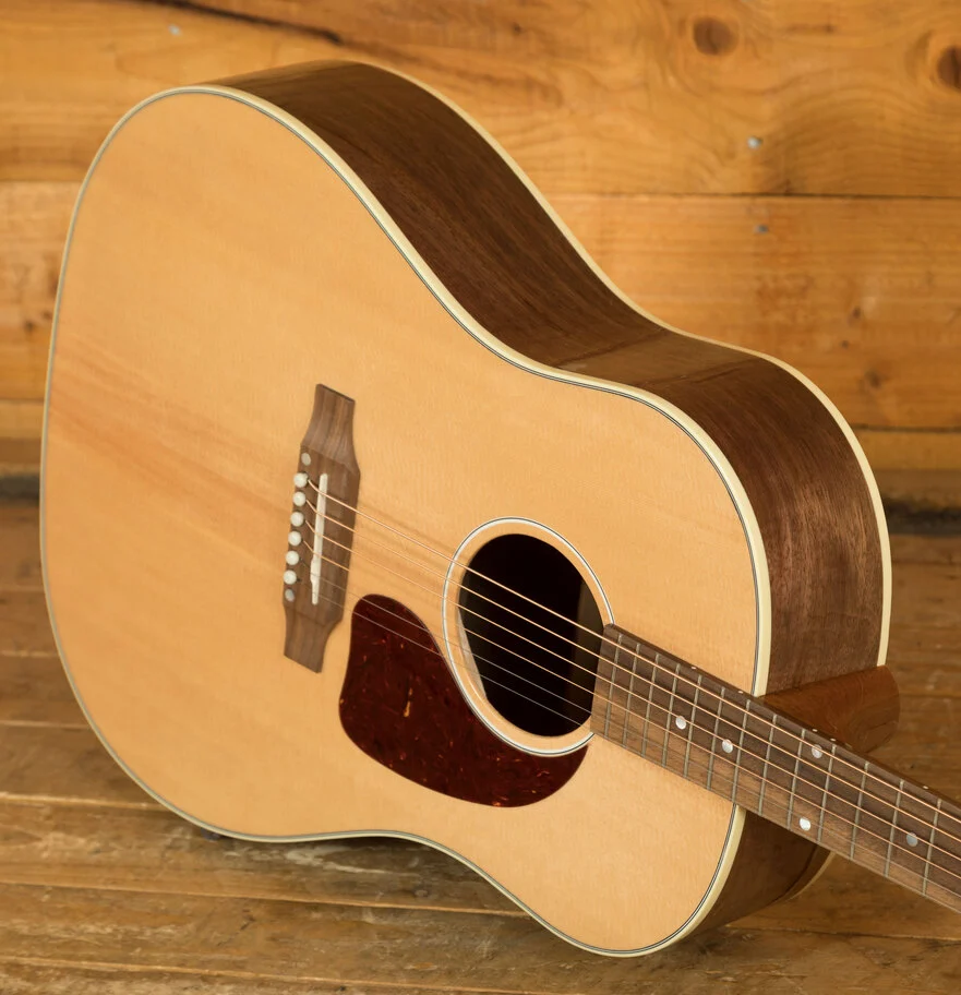 The guitar's body is finished with a satin nitrocellulose lacquer. A multi-ply binding adorns the top, while the back has single-ply binding. The bracing is traditional hand-scalloped X-bracing. The bridge is a belly-up style made of walnut, and the saddle is also made of Tusq. Grover Rotomatic tuning machines ensure stable tuning. The guitar features a tear-drop pickguard with a bevelled edge in tortoise. An adjustable truss rod allows for neck relief adjustments, and the truss rod cover is a black bell shape labelled "Studio". The bridge pins are Tusq. The guitar comes with a modern hardshell case for protection and transport.