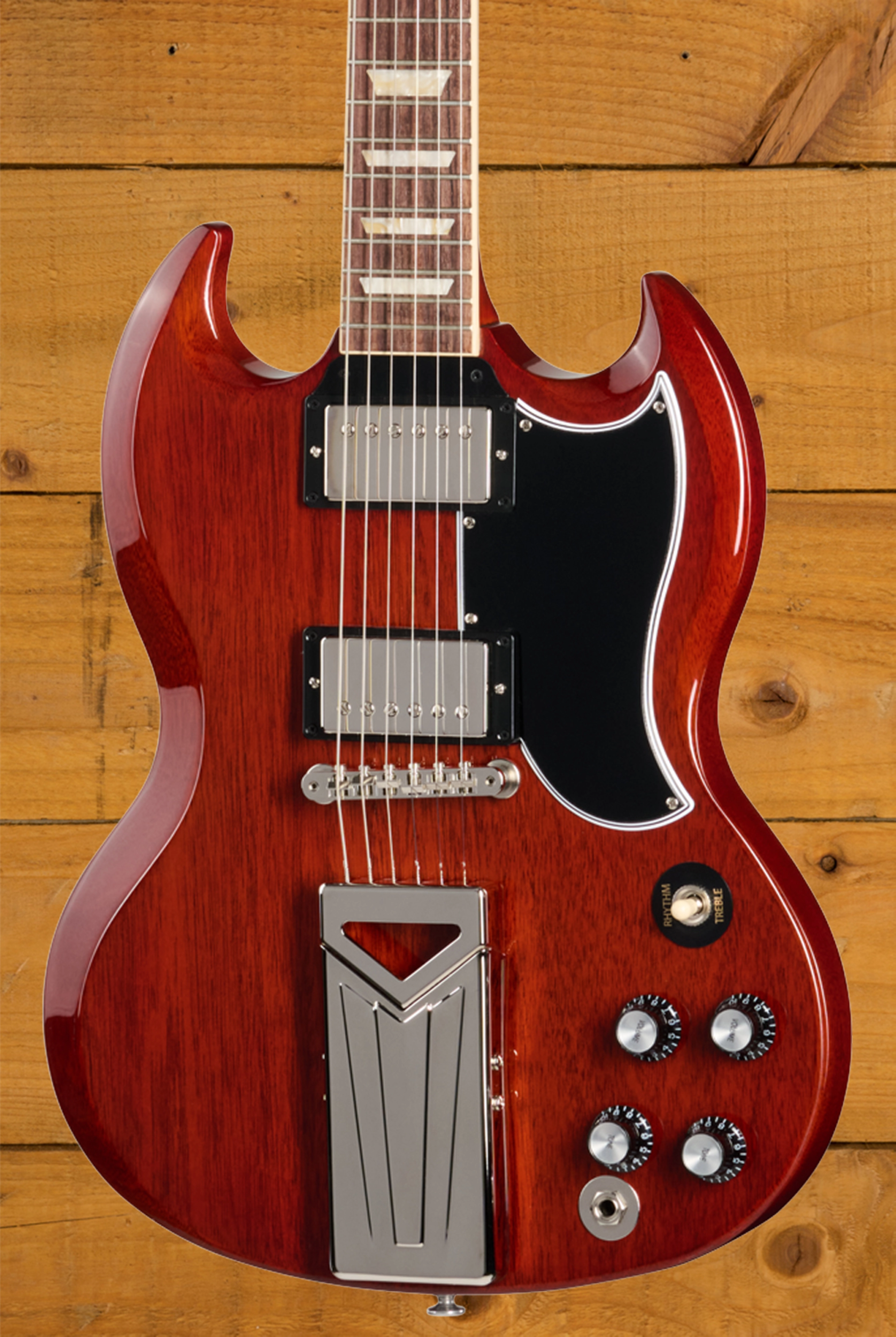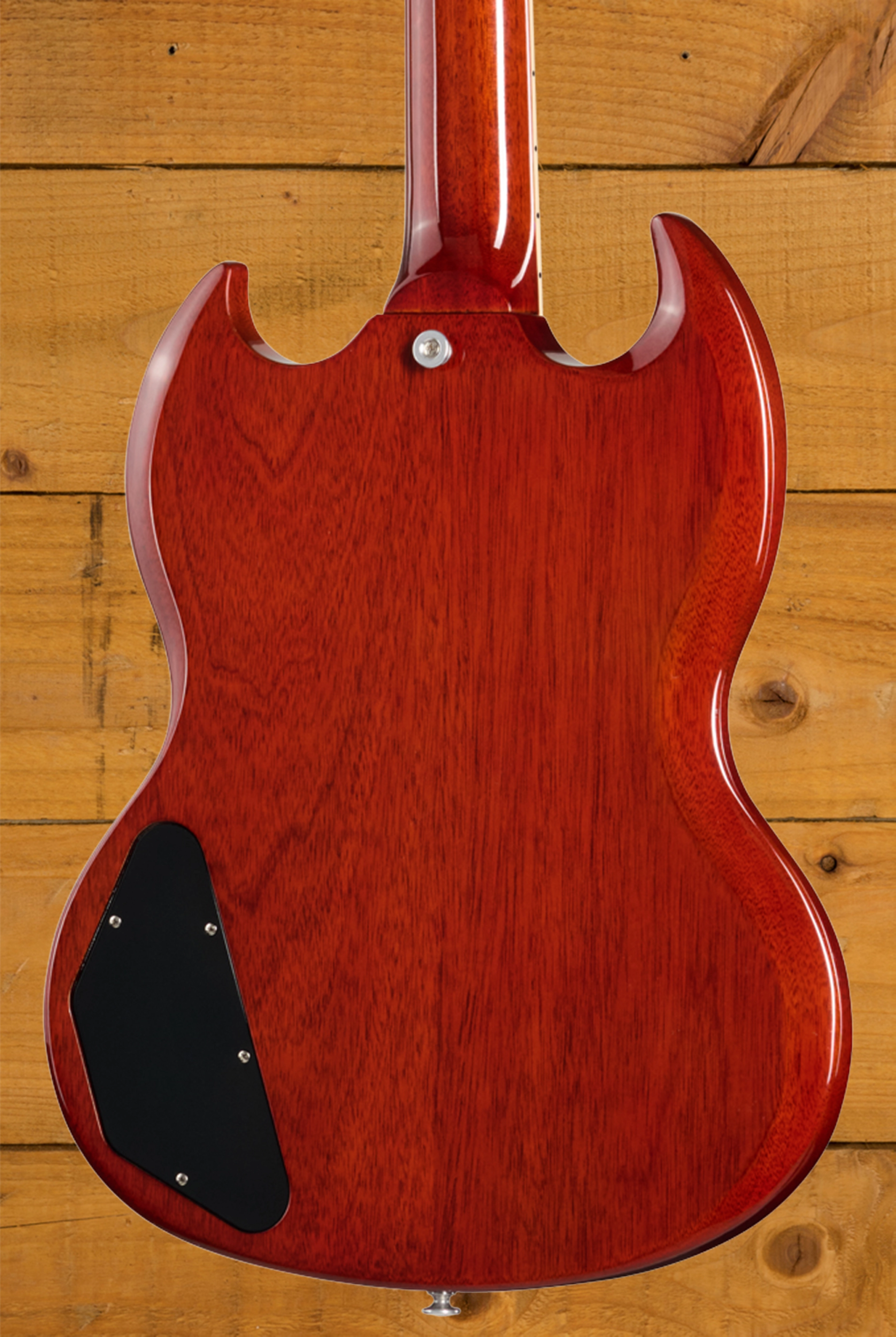 This SG begins with a traditional double cut SG body crafted from Mahogany. This body shape is so iconic and really does look incredible. The Faded Vintage Cherry nitrocellulose lacquer is a great feature and design choice. The nitrocellulose finish is really thin, which allows the body to resonate much more effectively when compared to other finish types. As the finish is thin, it will begin to wear overtime giving each guitar its own unique look and vibe.