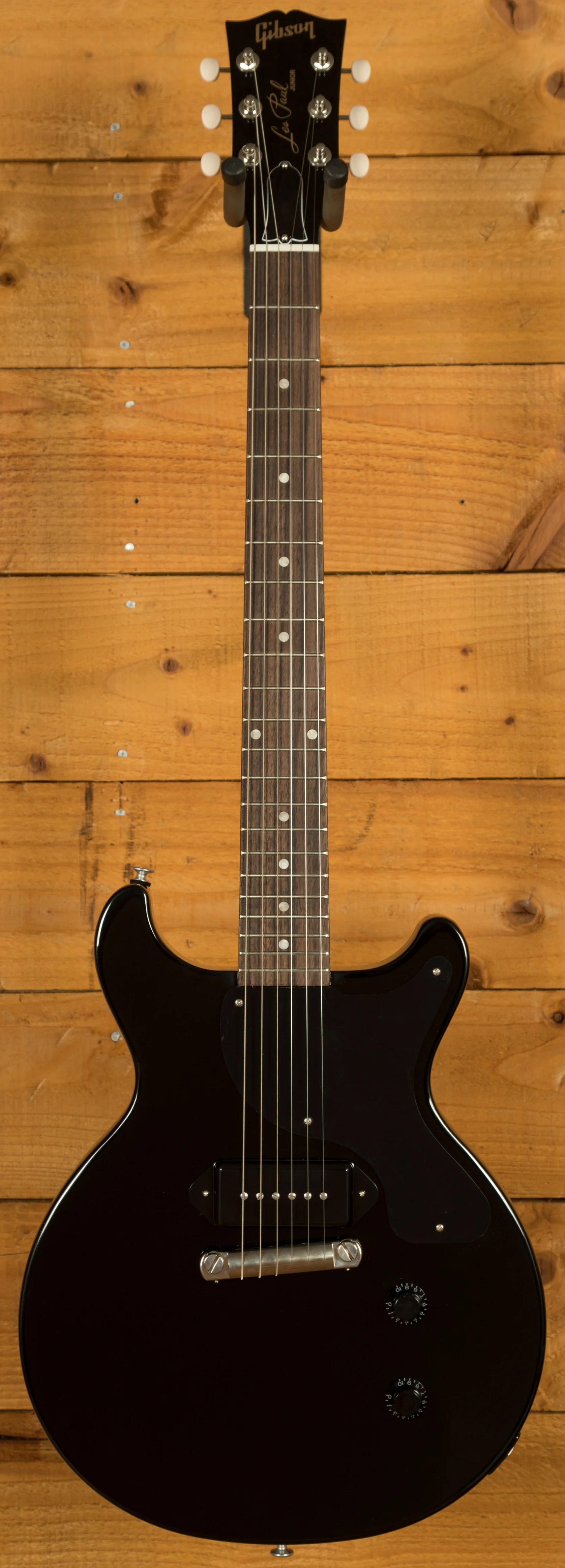 As the name suggests, the Gibson Les Paul Junior Double Cut features an all-mahogany body with twin cutaways. This design not only gives the guitar a distinctive look but also provides easier access to the upper frets, making it comfortable and practical for a wide range of playing styles. These guitars are really well weighted and well balanced, making them super comfortable to play both standing.