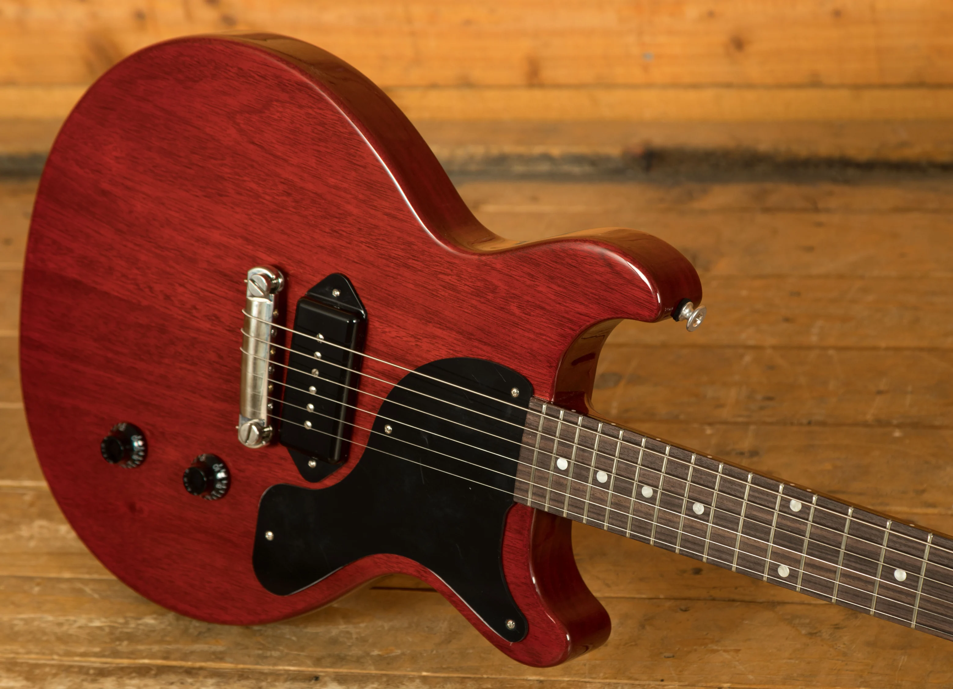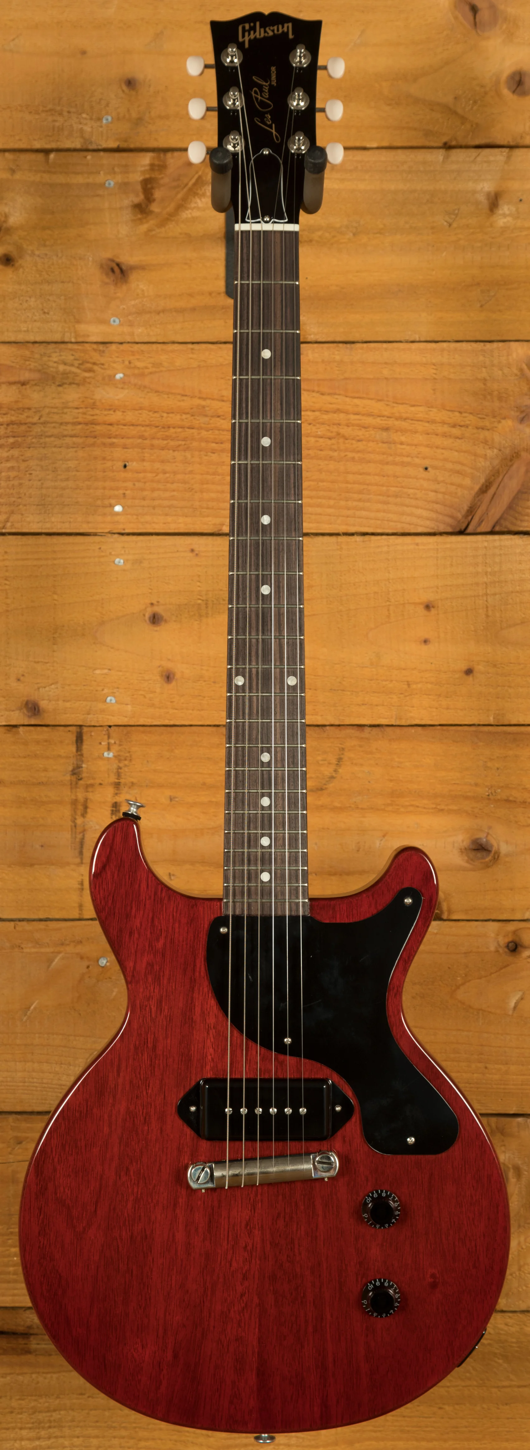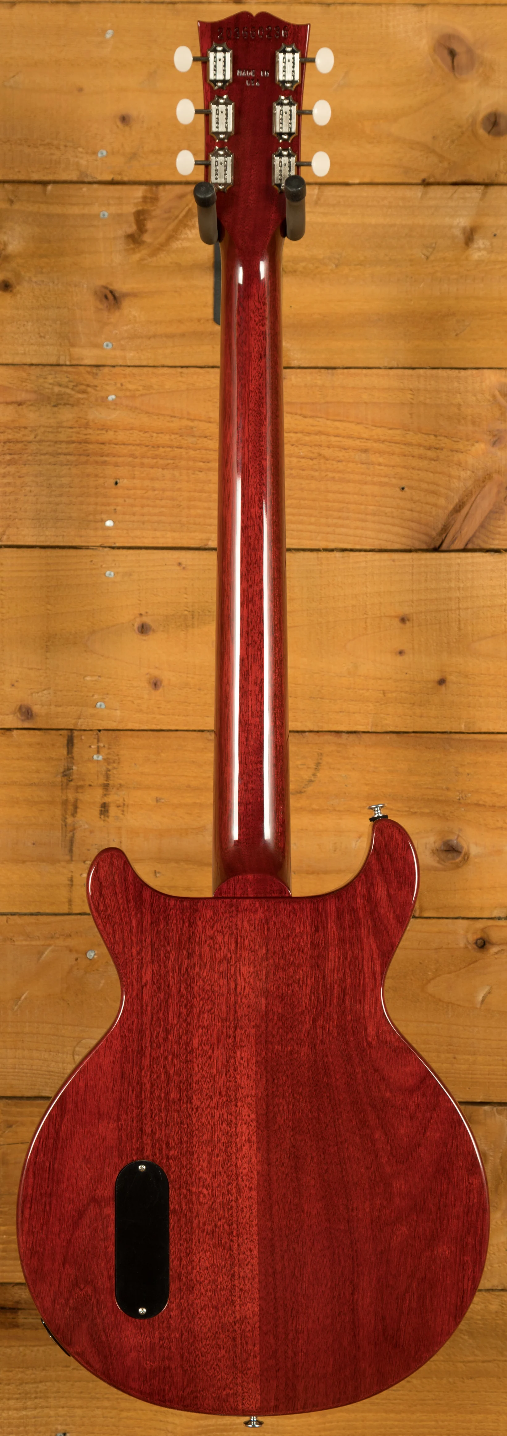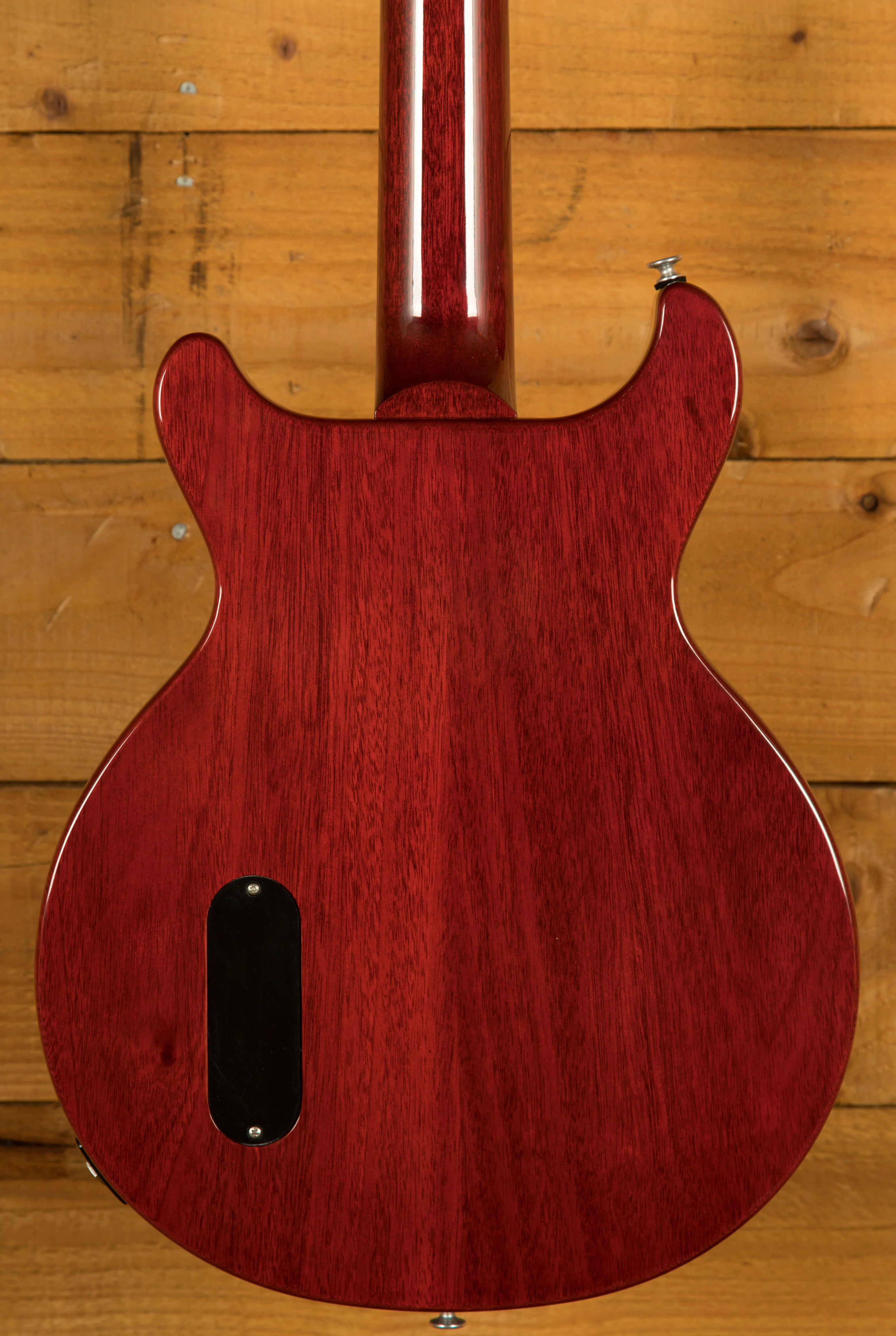 As the name suggests, the Gibson Les Paul Junior Double Cut features an all-mahogany body with twin cutaways. This design not only gives the guitar a distinctive look but also provides easier access to the upper frets, making it comfortable and practical for a wide range of playing styles. These guitars are really well weighted and well balanced, making them super comfortable to play both standing.