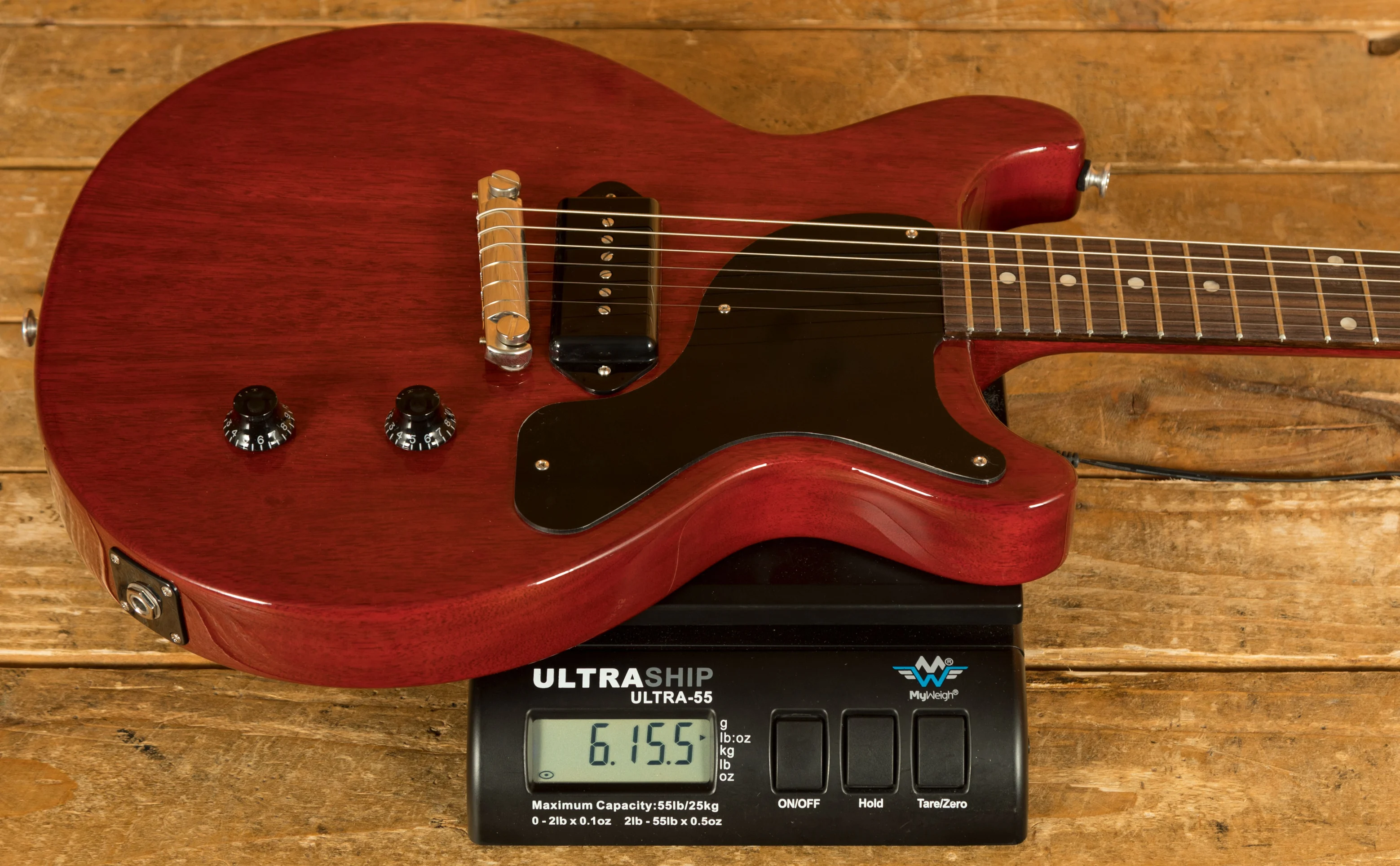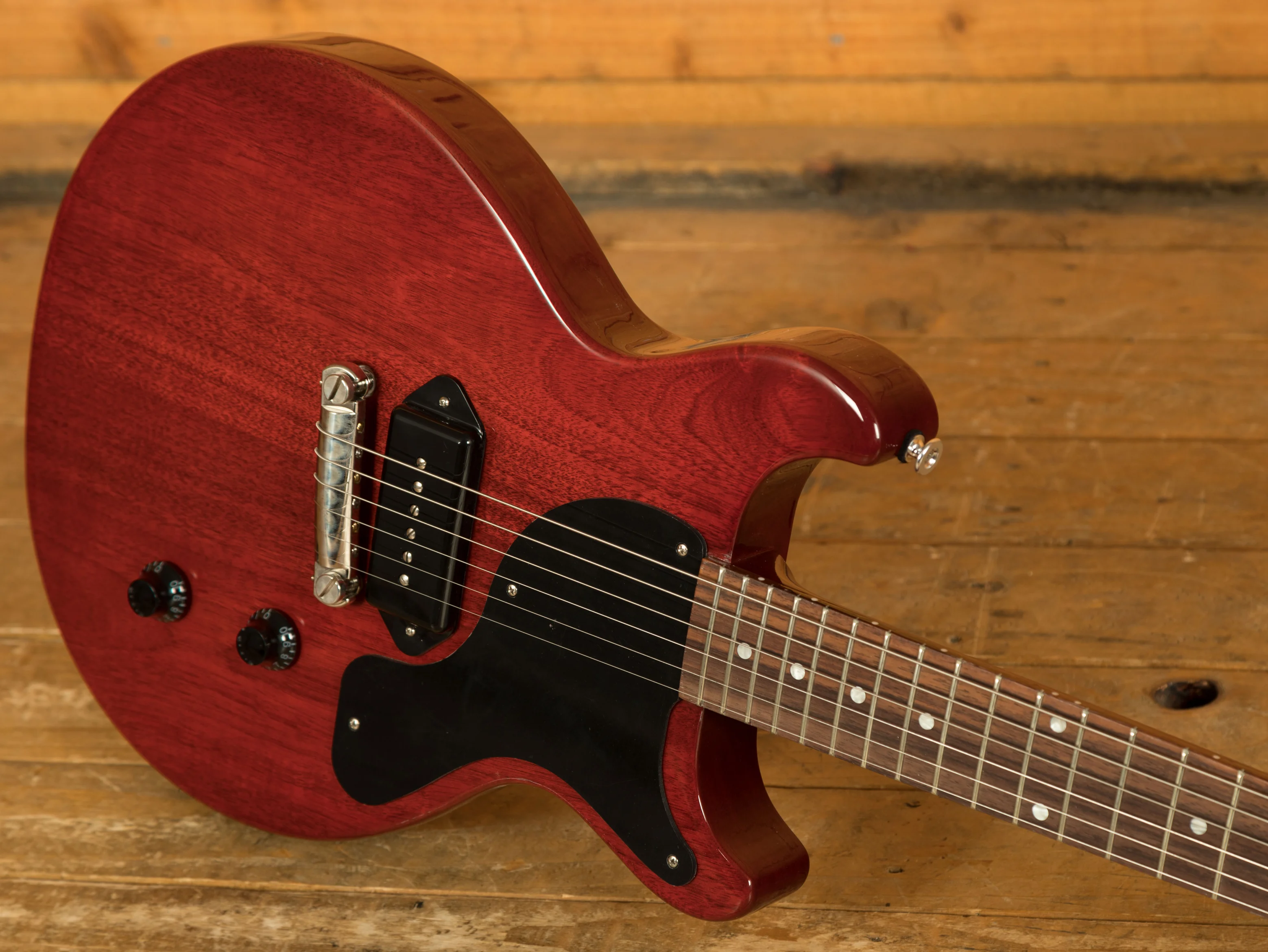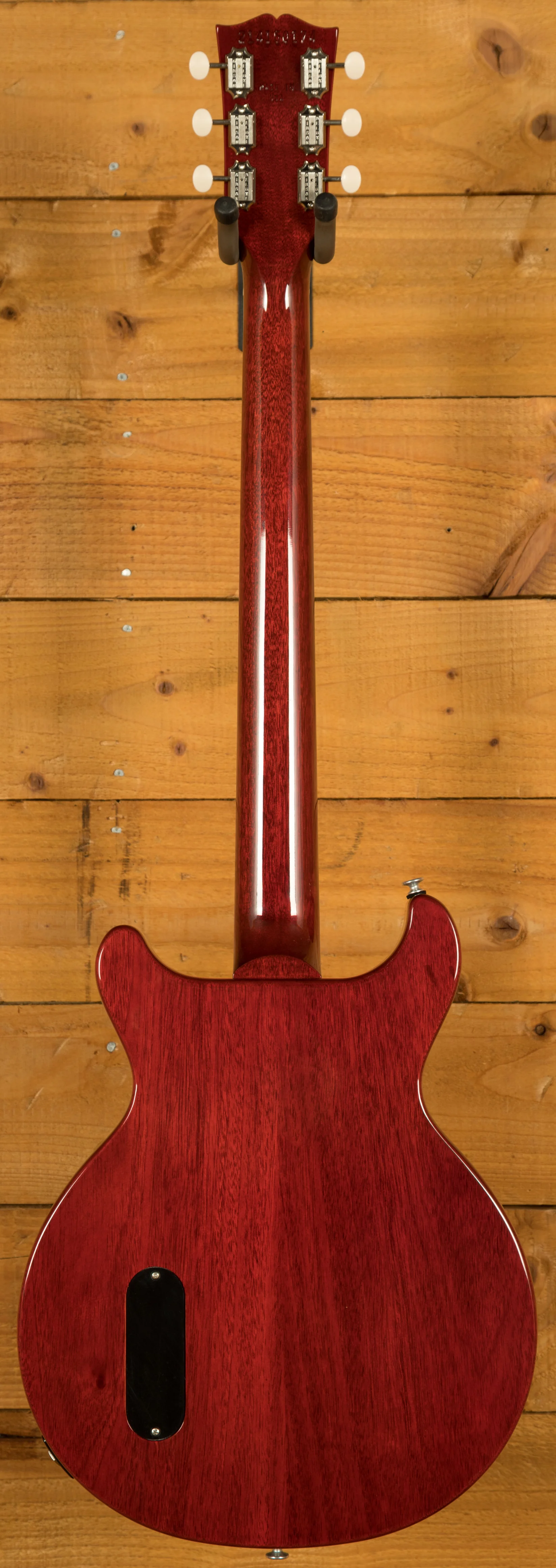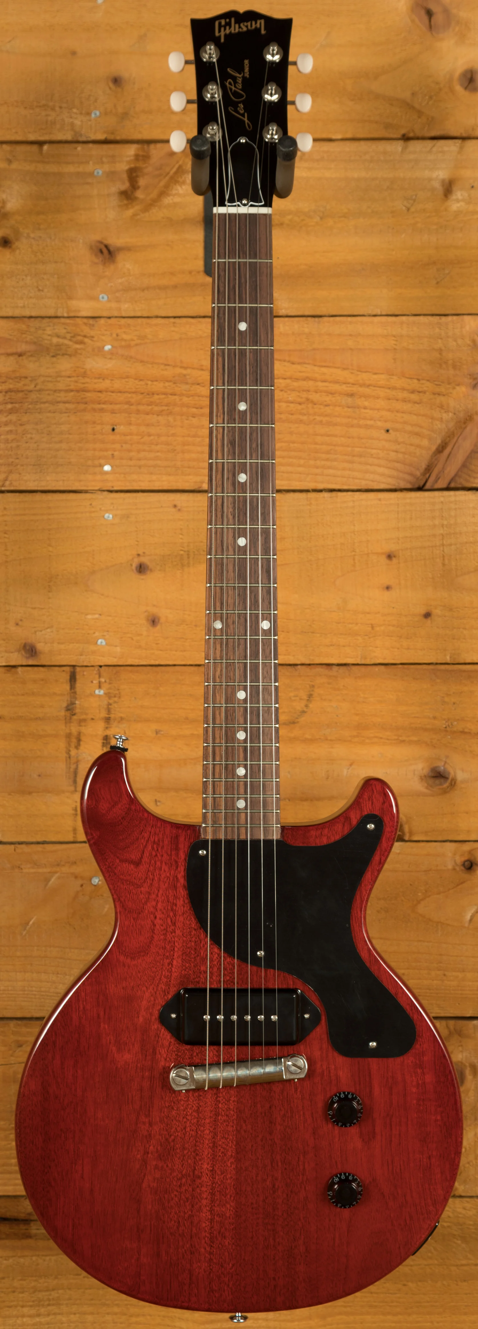 As the name suggests, the Gibson Les Paul Junior Double Cut features an all-mahogany body with twin cutaways. This design not only gives the guitar a distinctive look but also provides easier access to the upper frets, making it comfortable and practical for a wide range of playing styles. These guitars are really well weighted and well balanced, making them super comfortable to play both standing.