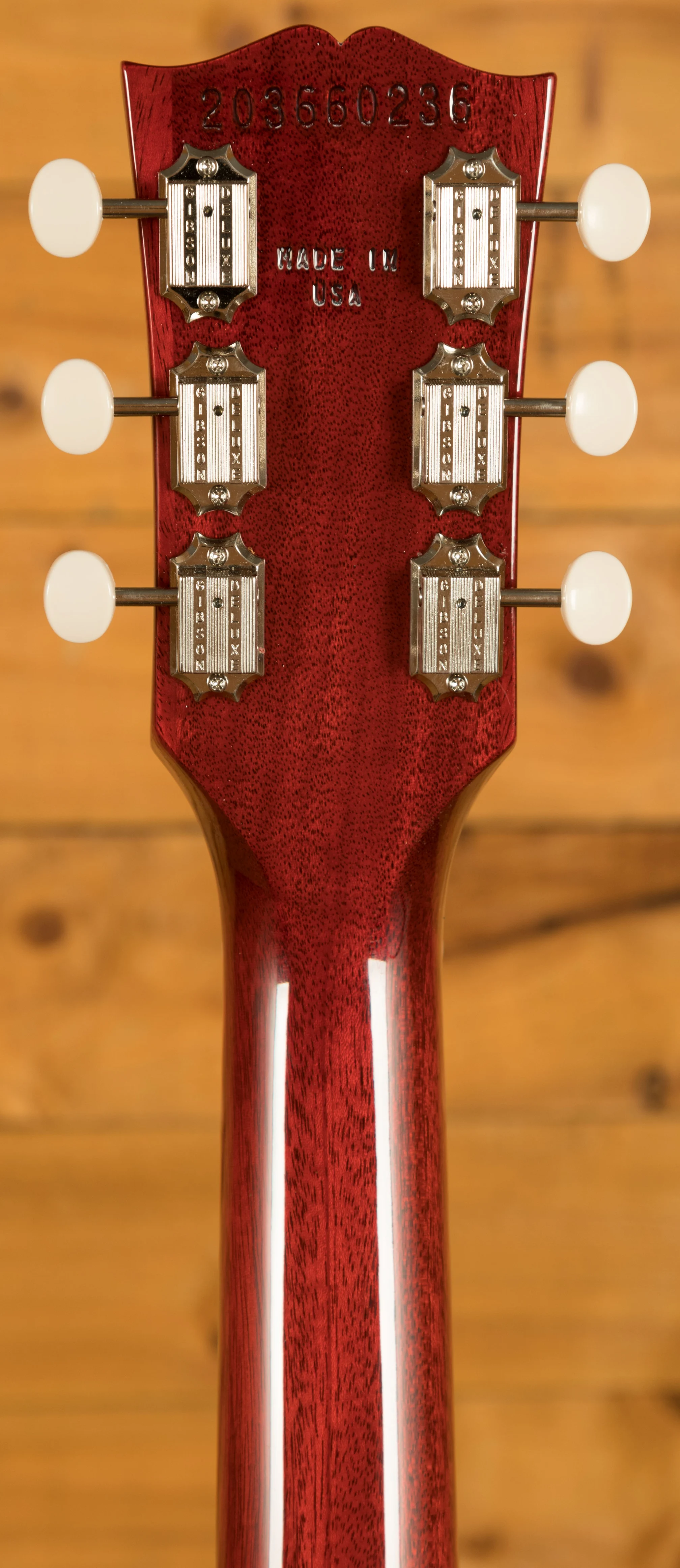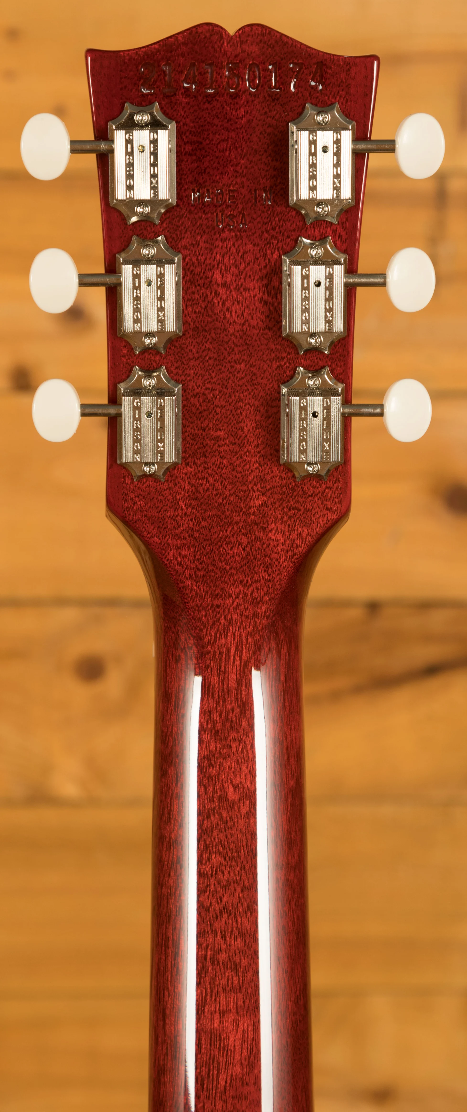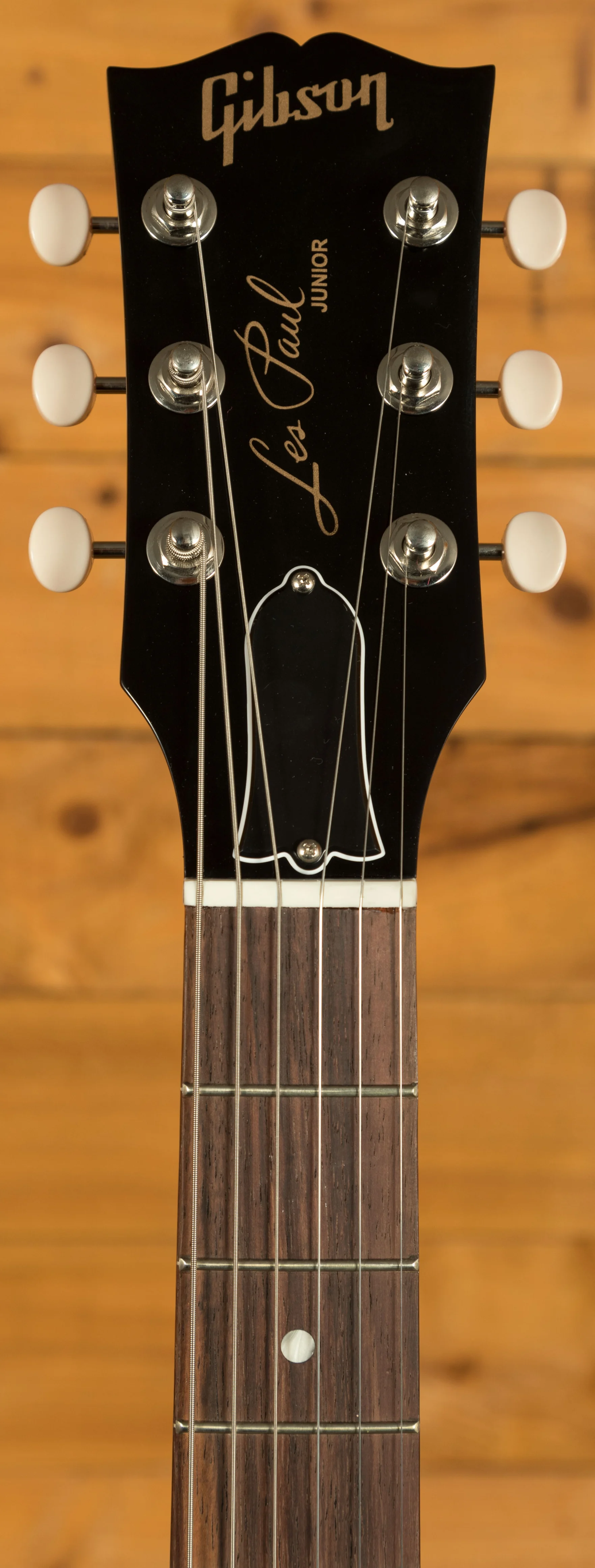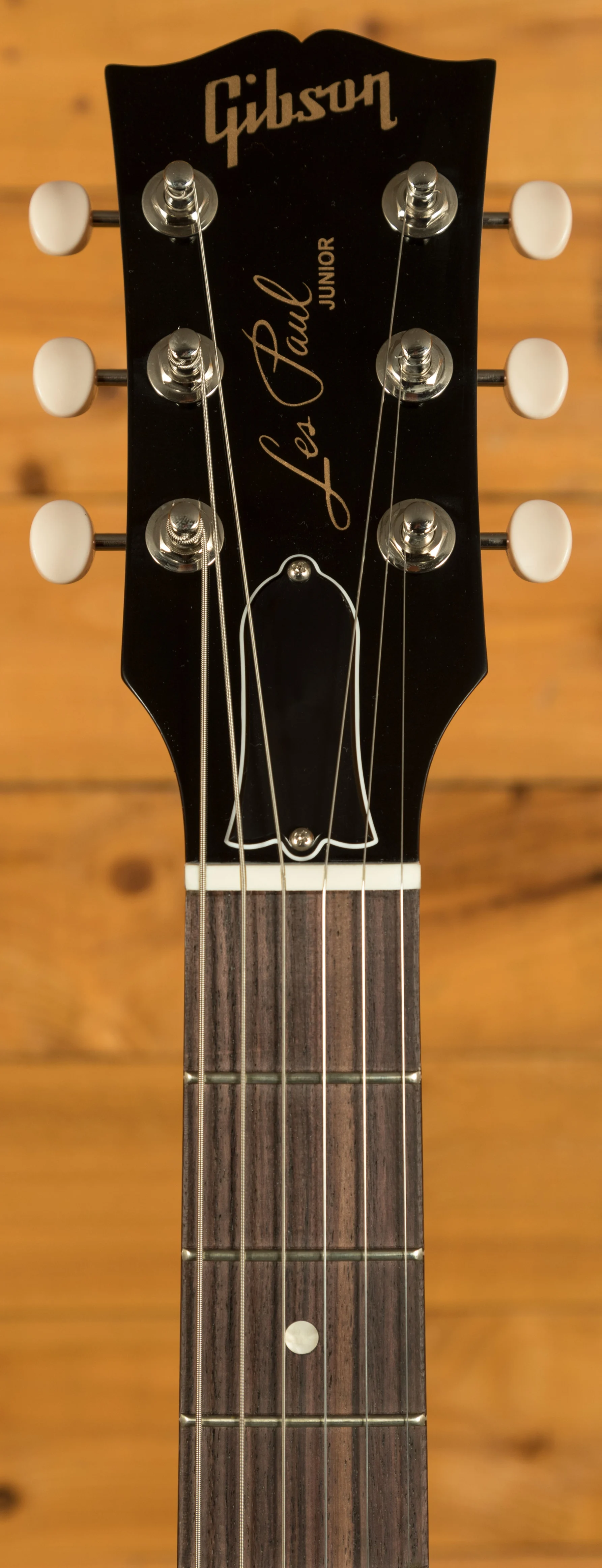 The Les Paul Junior Double Cut features a solid mahogany neck with the classic SlimTaper profile, a key part of what gives this model its fast, comfortable feel. It sits naturally in the hand and allows effortless movement across the fingerboard, whether you are playing rhythm or lead. The rosewood fingerboard has a 24.75 inch scale length, a 43 mm nut width, 22 frets and simple acrylic dot inlays for a traditional look. At the headstock, Gibson Vintage Deluxe tuners with white buttons work with a Graph Tech nut to ensure smooth and stable tuning. The wraparound bridge and tailpiece mount directly to the mahogany body, providing excellent resonance, sustain and the unmistakable tone that the Les Paul Junior Double Cut is celebrated for.