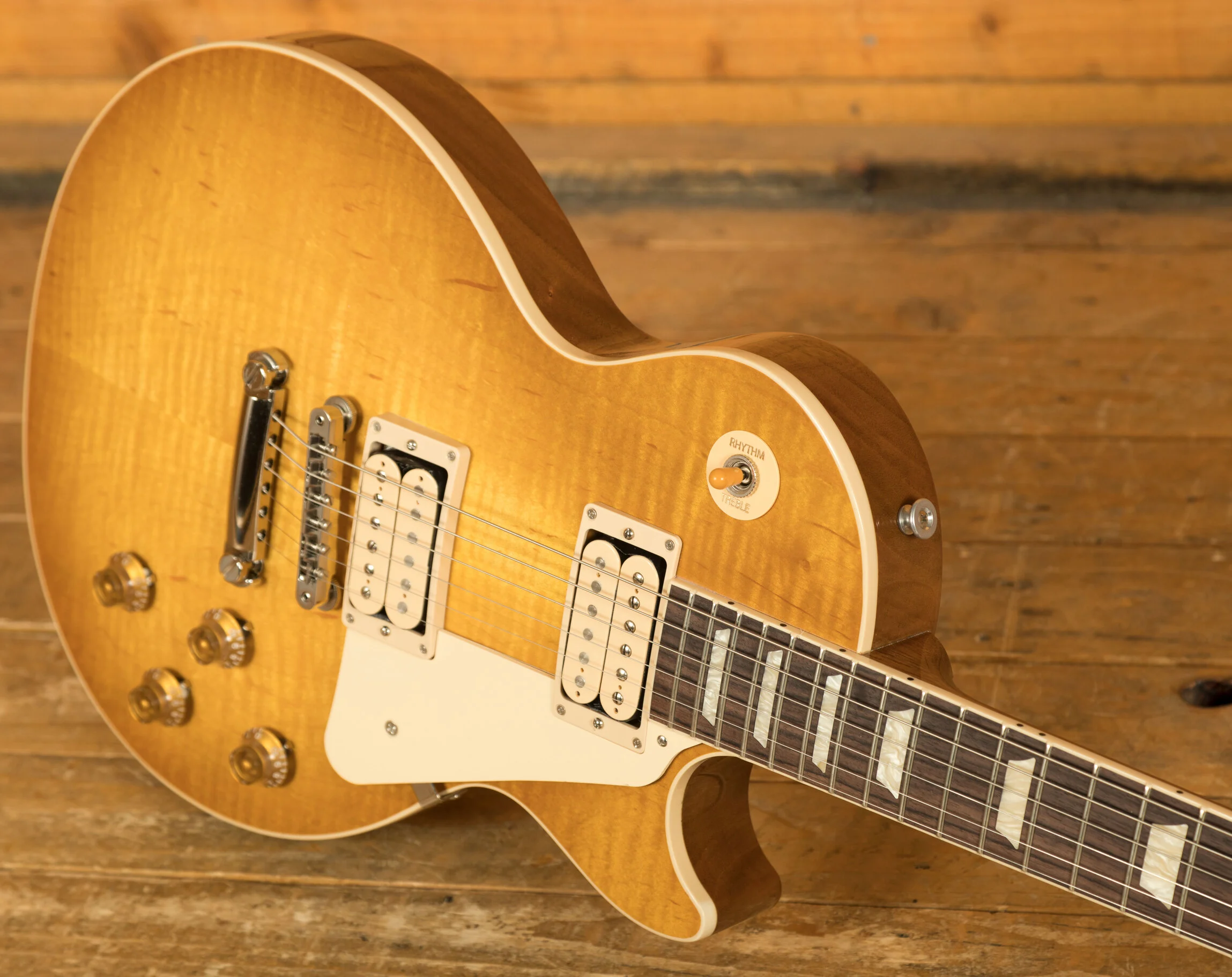 With a Mahogany body, this Les Paul benefits from a Maple top for the ultimate tonewood partnership. Rich and super resonant it offers premium tone and timeless aesthetics! One of the most exciting features of the Double Trouble Les Paul is the unique finish. This guitar features a “vintage” variation of Gibson’s iconic Honey Burst nitrocellulose finish, which is slightly more faded when compared to the standard version. As each burst pattern is sprayed by hand, you’ll see there is some great variation in each guitars colour.