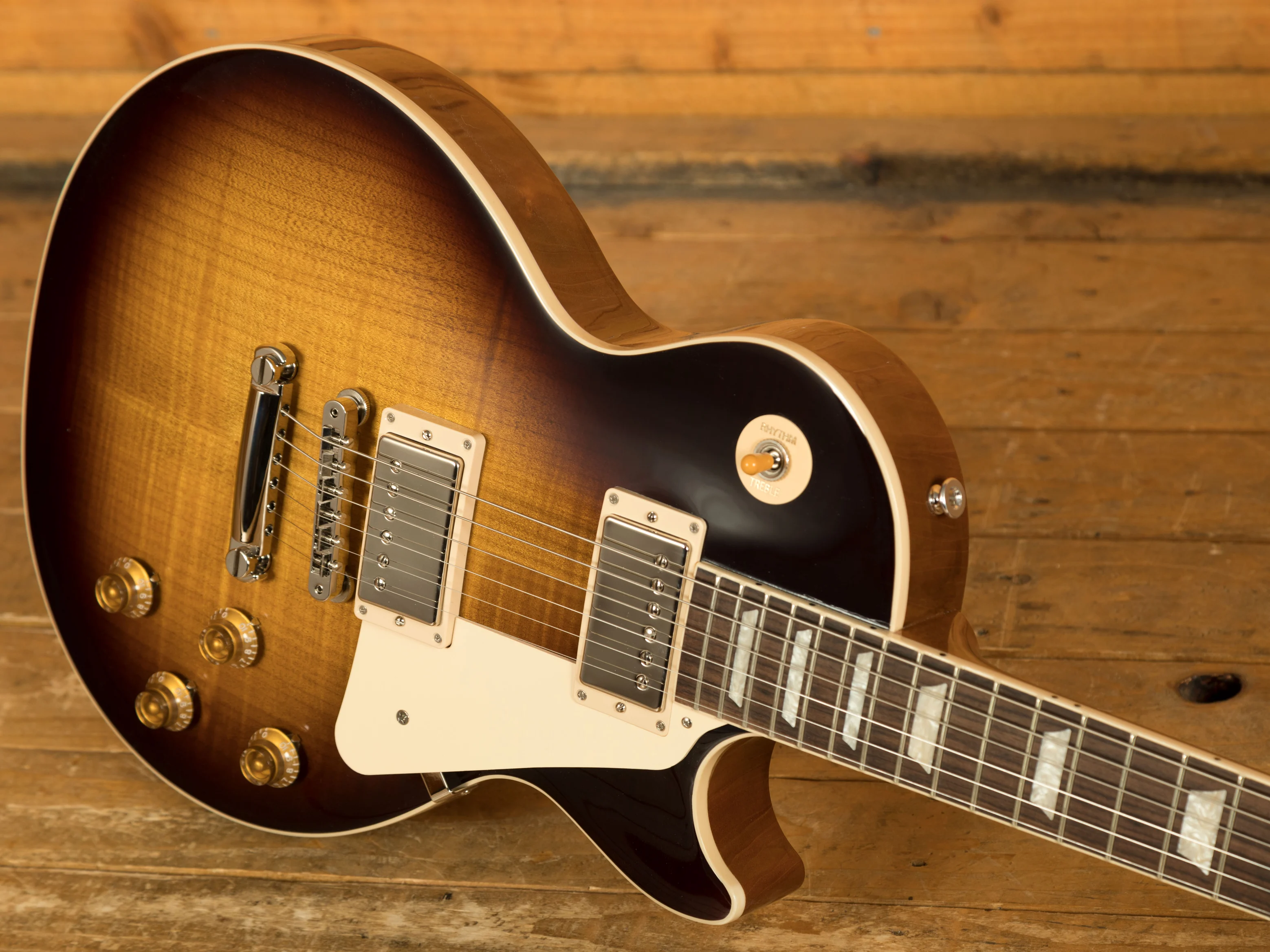 With a Mahogany body, this Les Paul benefits from a Maple top for the ultimate tonewood partnership. Rich and super resonant it offers premium tone and timeless aesthetics, while the Tobacco Burst finish looks a million dollars and really allows the wood to breathe and the natural tone to sing through.
