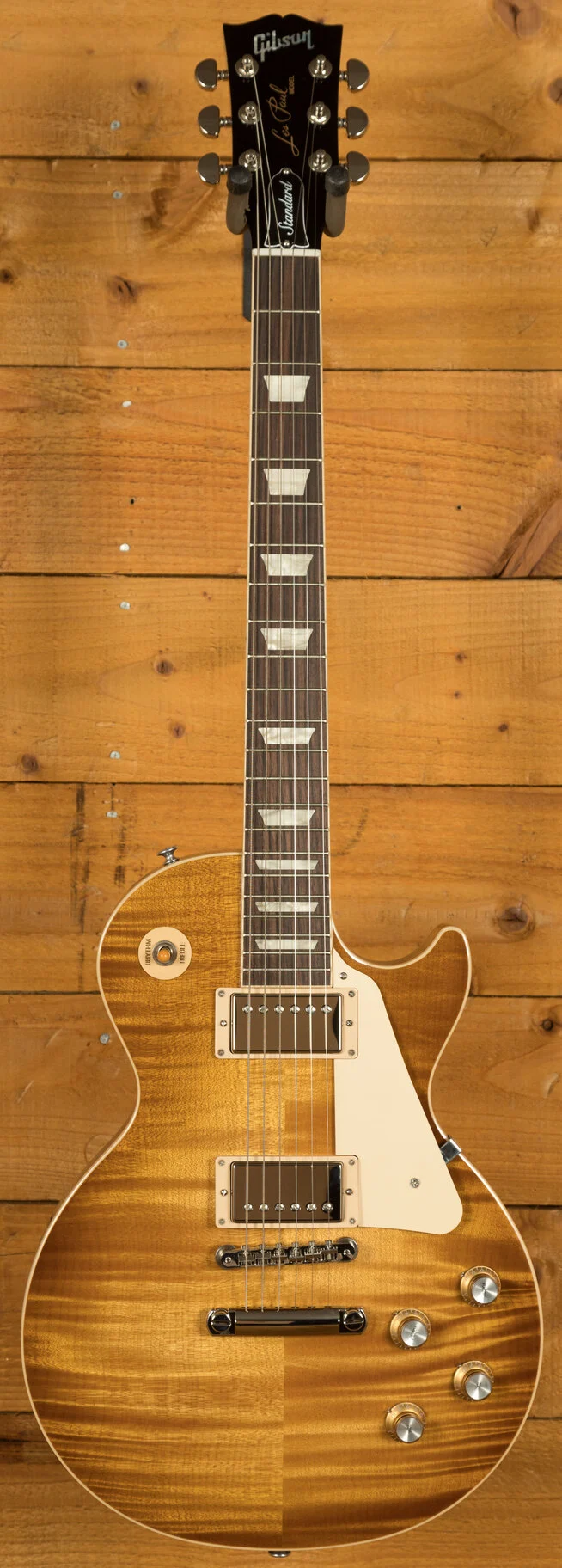 Built to meet your expectations, this guitar boasts a solid mahogany body and a SlimTaper 60s-style mahogany neck complemented by a rosewood fingerboard adorned with trapezoid inlays. Equipped with a classic ABR-1 Tune-O-Matic bridge, aluminium Stop Bar tailpiece, Grover Rotomatic "Kidney" tuners, and gold Top Hat knobs featuring silver reflectors, every detail exudes classic Les Paul craftsmanship.