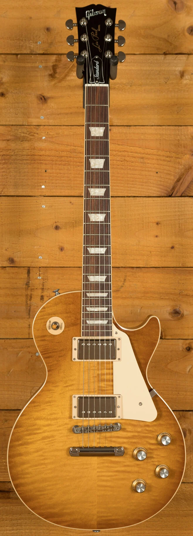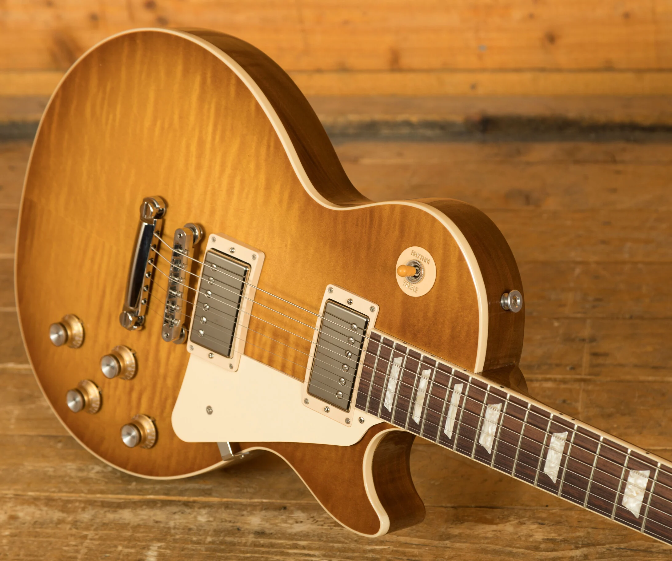 The Gibson USA Les Paul Standards 60s model is typically adorned with a AA figured top and available in classic finishes like Iced Tea, Bourbon Burst and Unburst. However, we present an exclusive offering featuring an exquisite AAA top and a selection of two distinctive colours not commonly found in this range: Dirty Lemon Burst and Fireburst, both meticulously finished in gloss nitrocellulose lacquer.