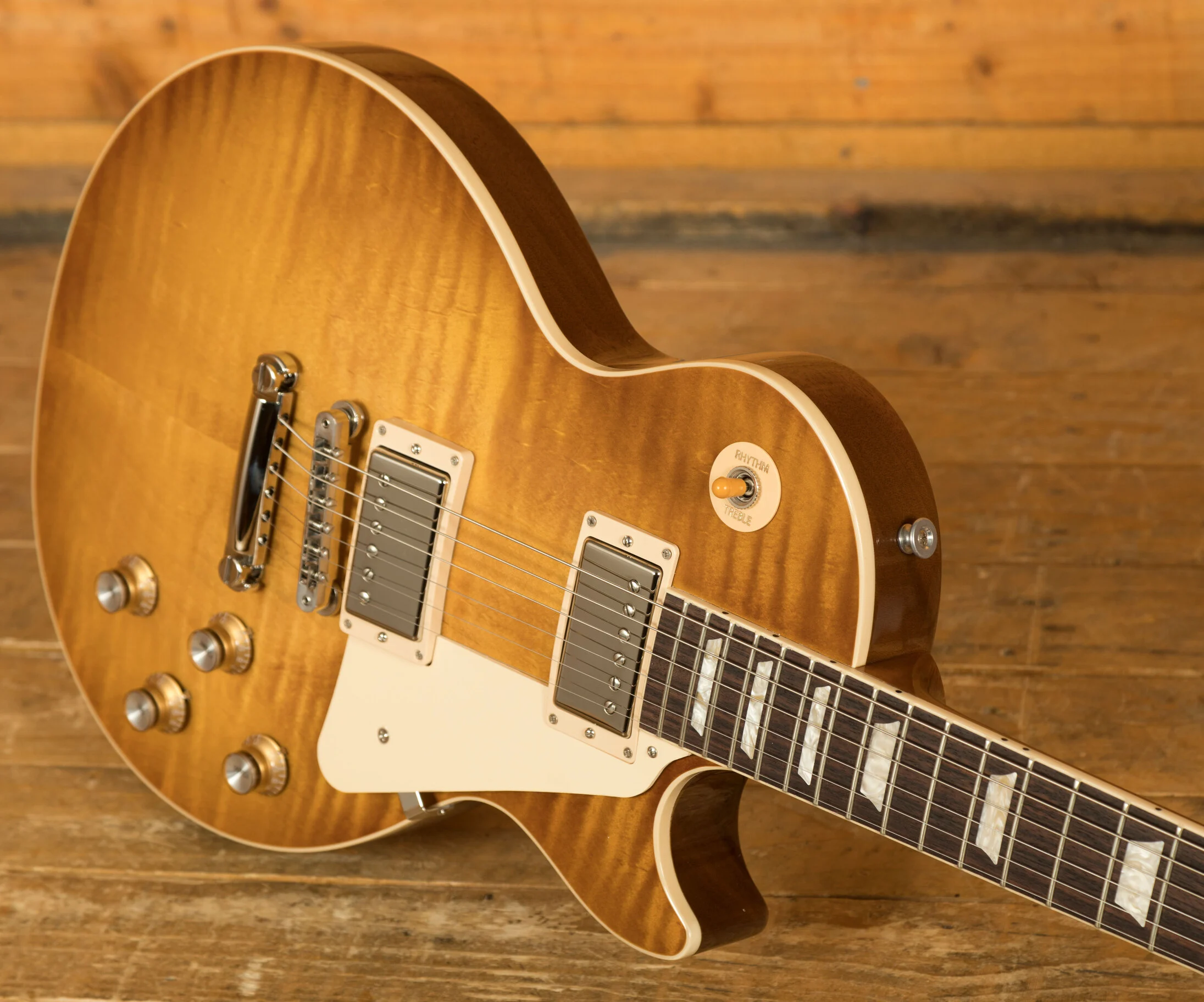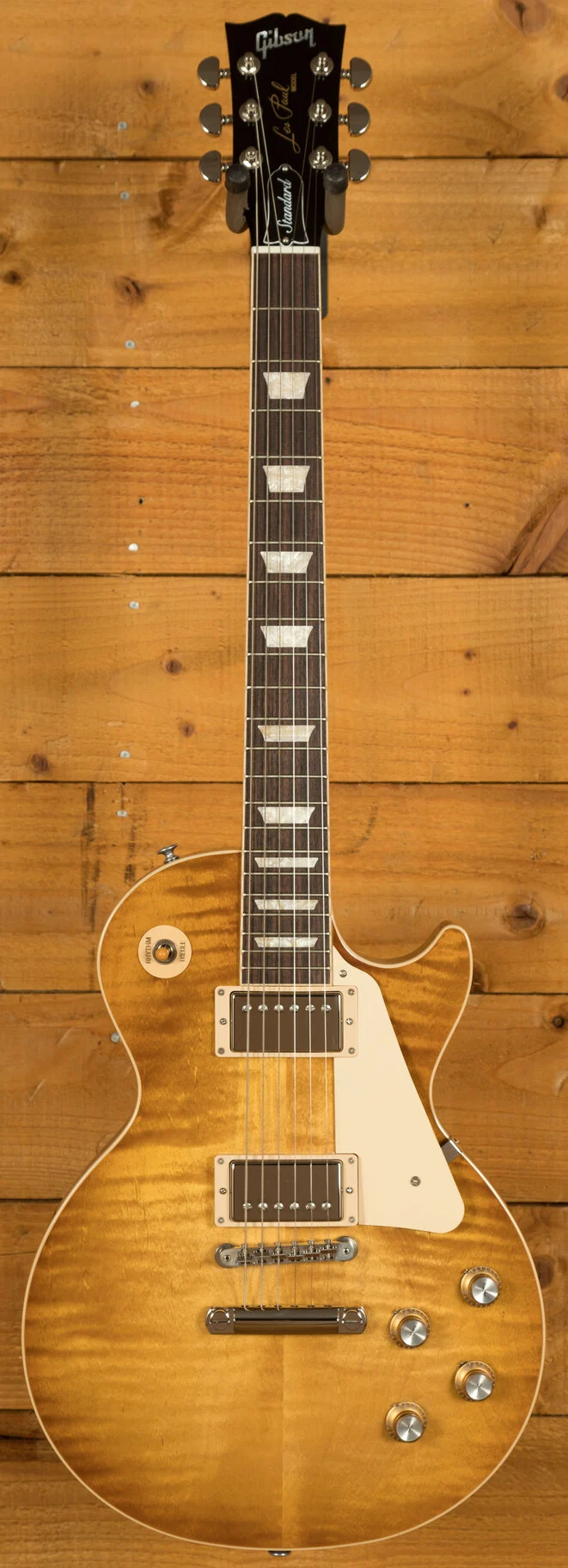 The Gibson USA Les Paul Standards 60s model is typically adorned with a AA figured top and available in classic finishes like Iced Tea, Bourbon Burst and Unburst. However, we present an exclusive offering featuring an exquisite AAA top and a selection of two distinctive colours not commonly found in this range: Dirty Lemon Burst and Fireburst, both meticulously finished in gloss nitrocellulose lacquer.