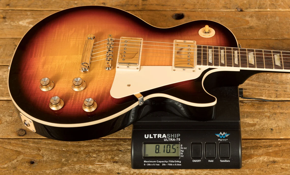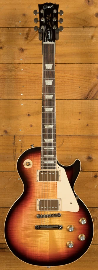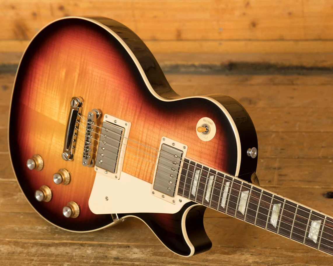 Built to meet your expectations, this guitar boasts a solid mahogany body and a SlimTaper 60s-style mahogany neck complemented by a rosewood fingerboard adorned with trapezoid inlays. Equipped with a classic ABR-1 Tune-O-Matic bridge, aluminium Stop Bar tailpiece, Grover Rotomatic "Kidney" tuners, and gold Top Hat knobs featuring silver reflectors, every detail exudes classic Les Paul craftsmanship.