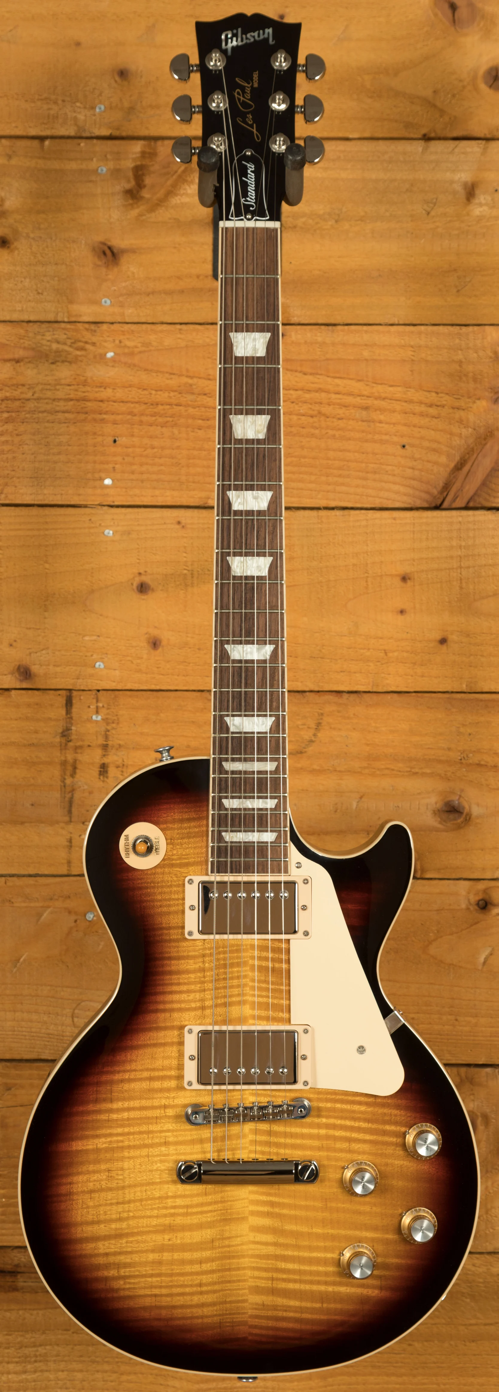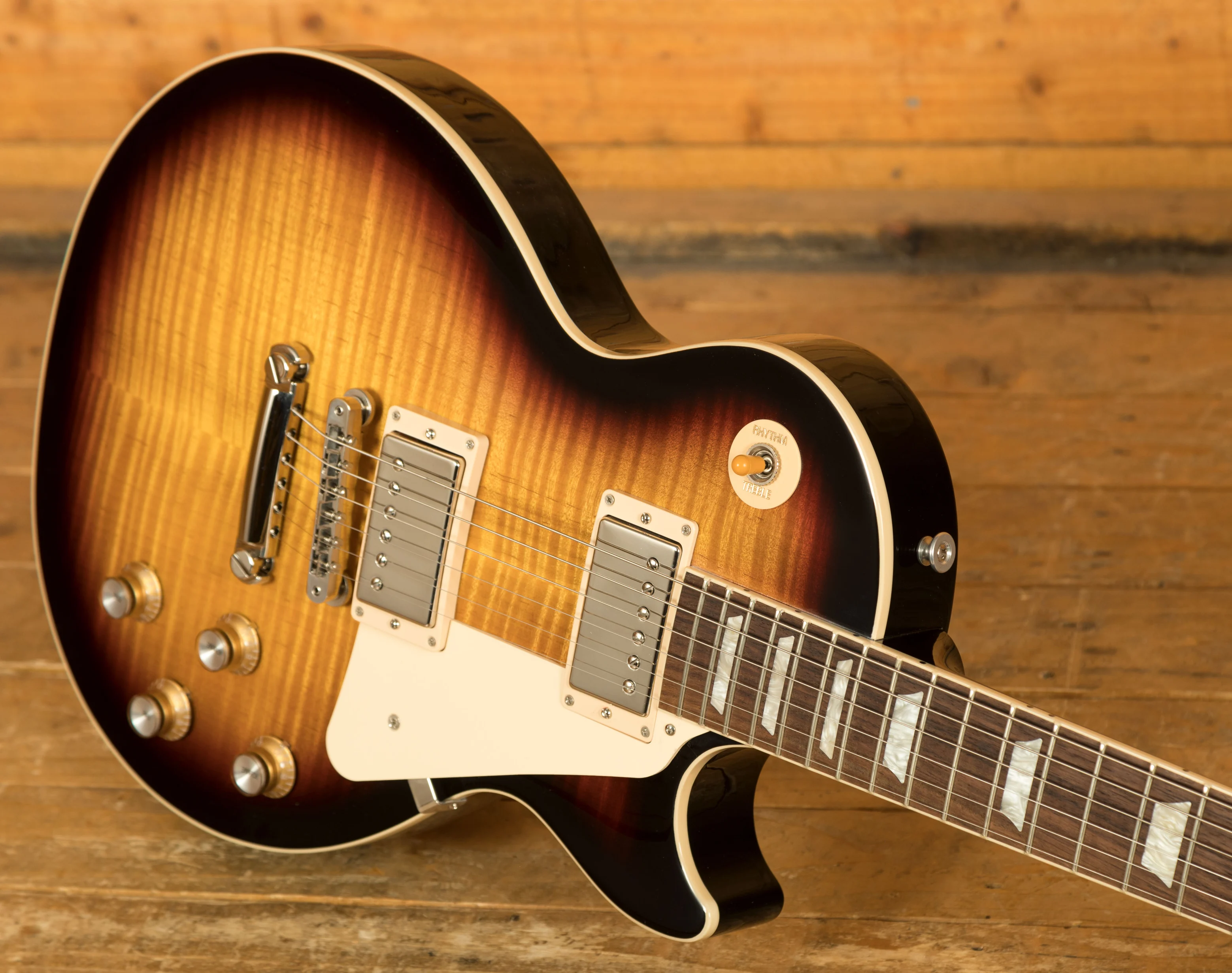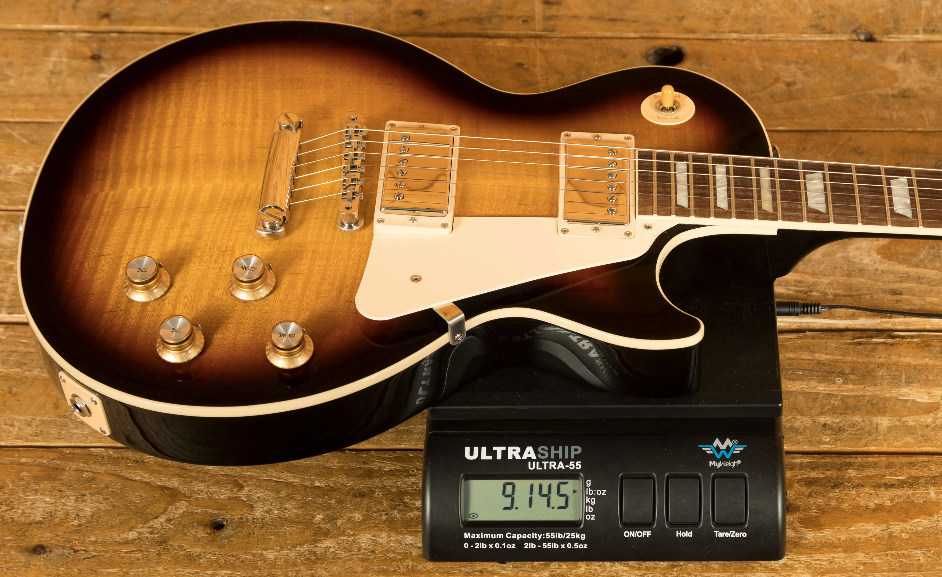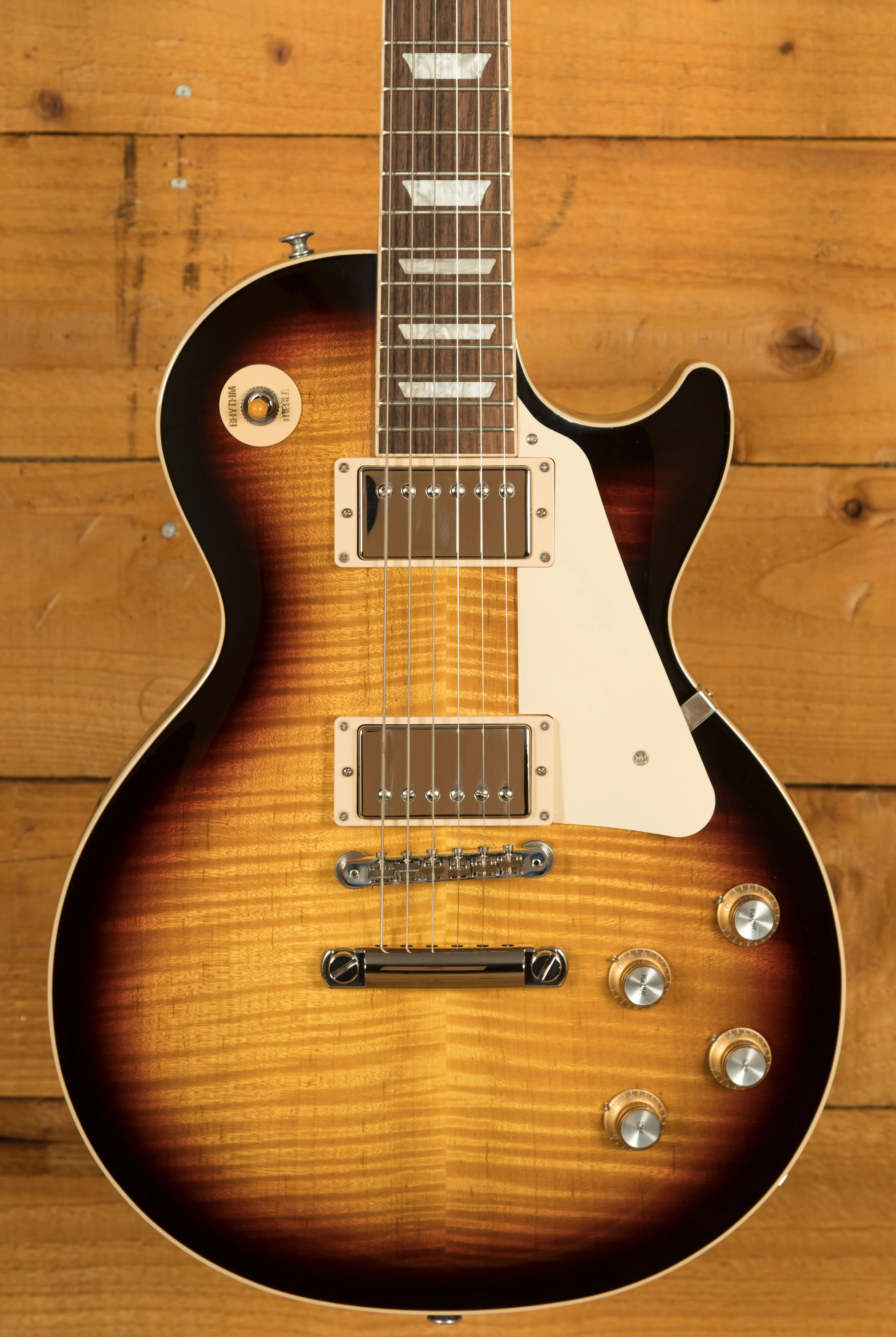Built to meet your expectations, this guitar boasts a solid mahogany body and a SlimTaper 60s-style mahogany neck complemented by a rosewood fingerboard adorned with trapezoid inlays. Equipped with a classic ABR-1 Tune-O-Matic bridge, aluminium Stop Bar tailpiece, Grover Rotomatic "Kidney" tuners, and gold Top Hat knobs featuring silver reflectors, every detail exudes classic Les Paul craftsmanship.
