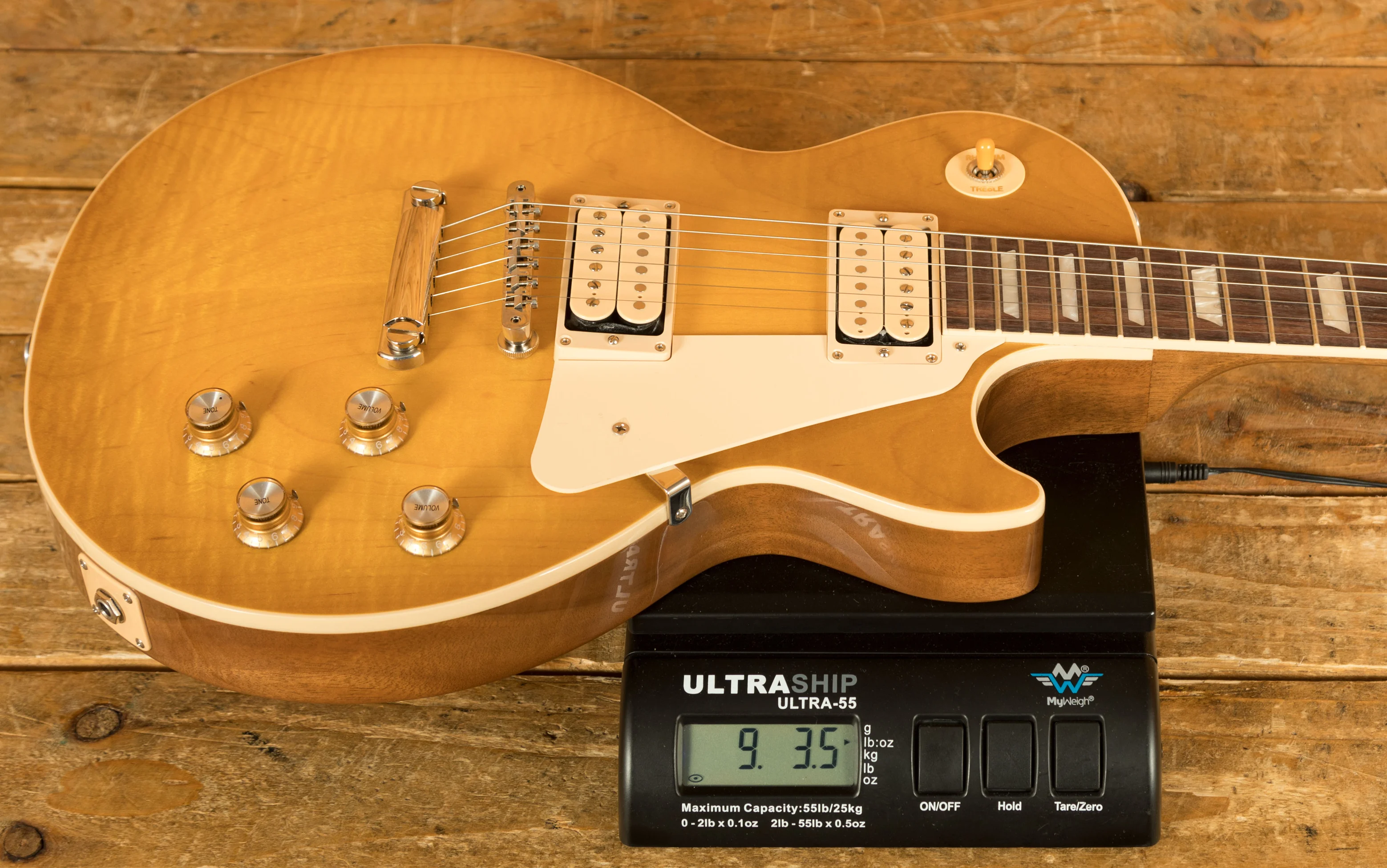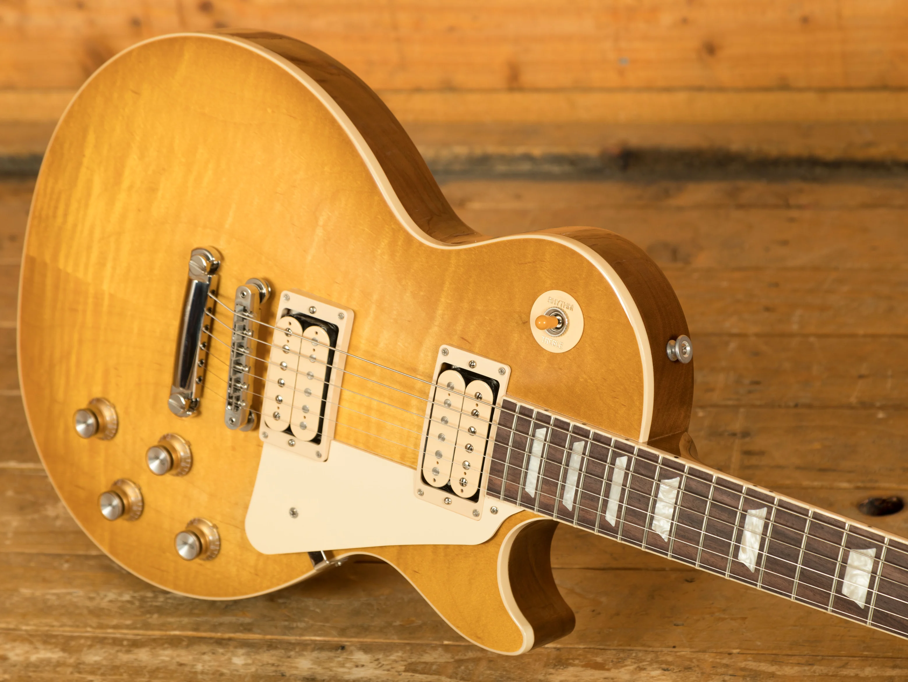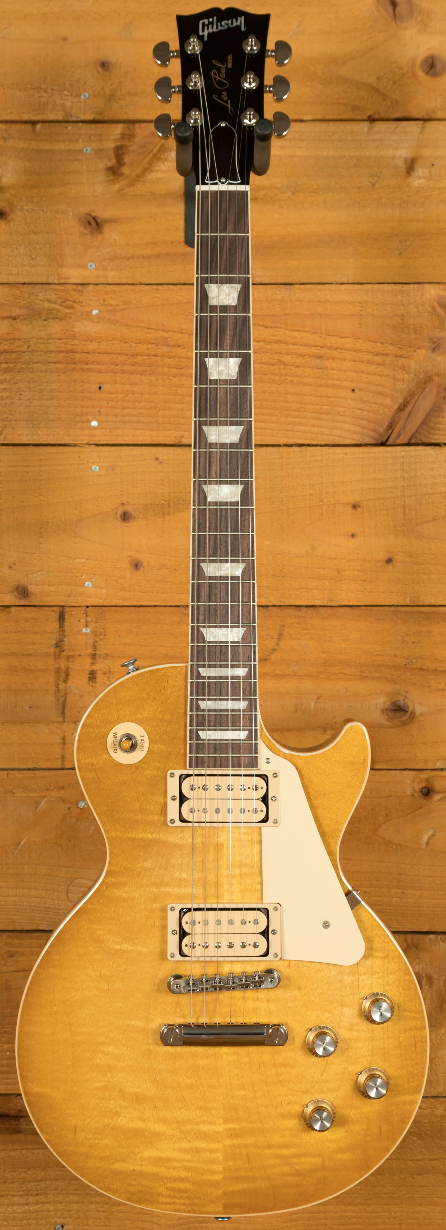 The Mahogany neck is topped with a crisp Rosewood fingerboard with classic Gibson Trapezoid inlays, this guitar looks every bit the real deal. With a 24.75" scale length and a SlimTaper profile, it retains that classic Les Paul feel. The ABR1 Tune-0-Matic bridge and light weight tailpiece offer an authentic vintage vibe.