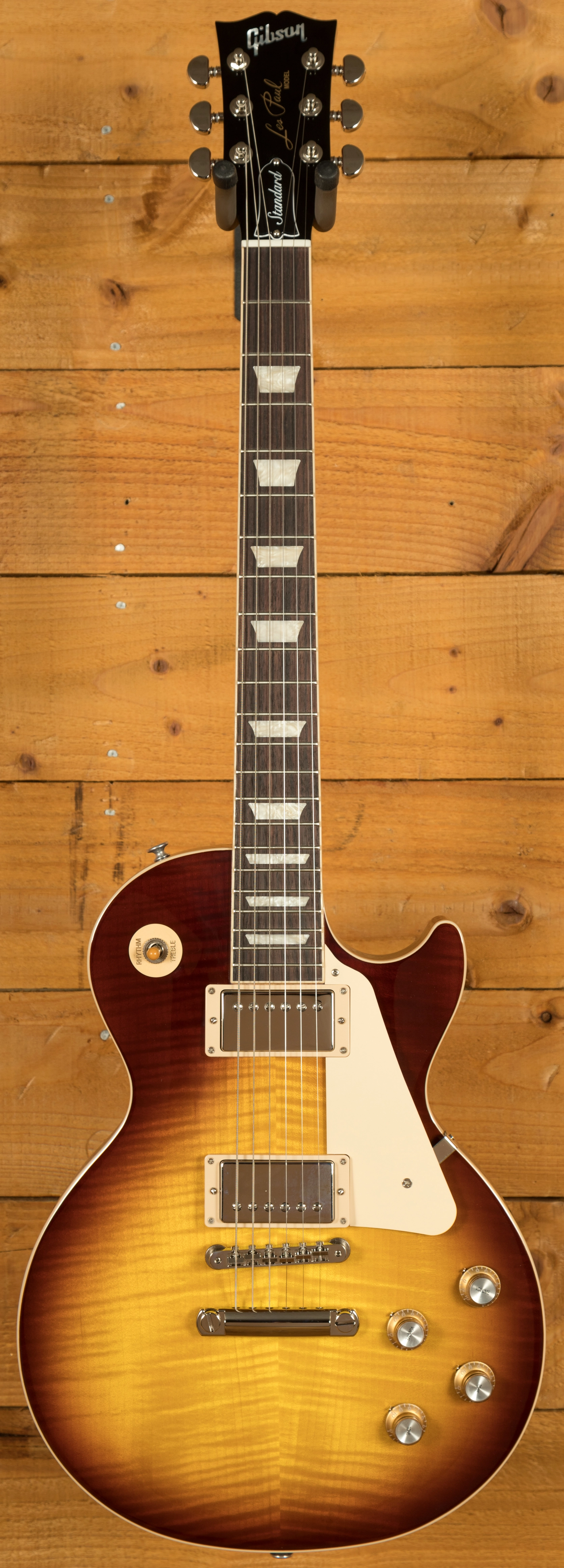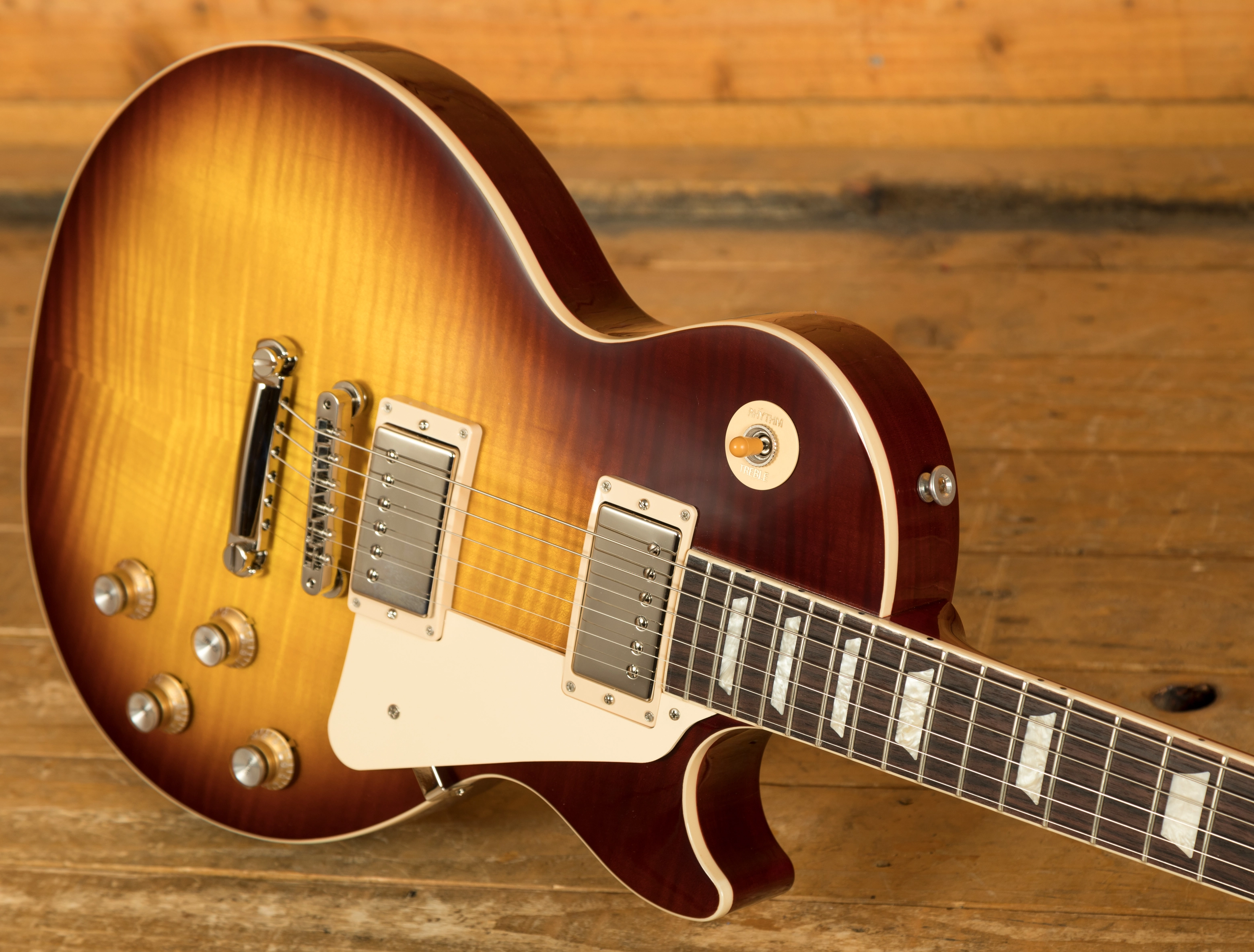 With a Mahogany body, this Les Paul benefits from a AA grade Maple top for the ultimate tonewood partnership. Rich and super resonant it offers premium tone and timeless aesthetics, while the Iced Tea finish looks a million dollars and really allows the wood to breathe and the natural tone to sing through.
