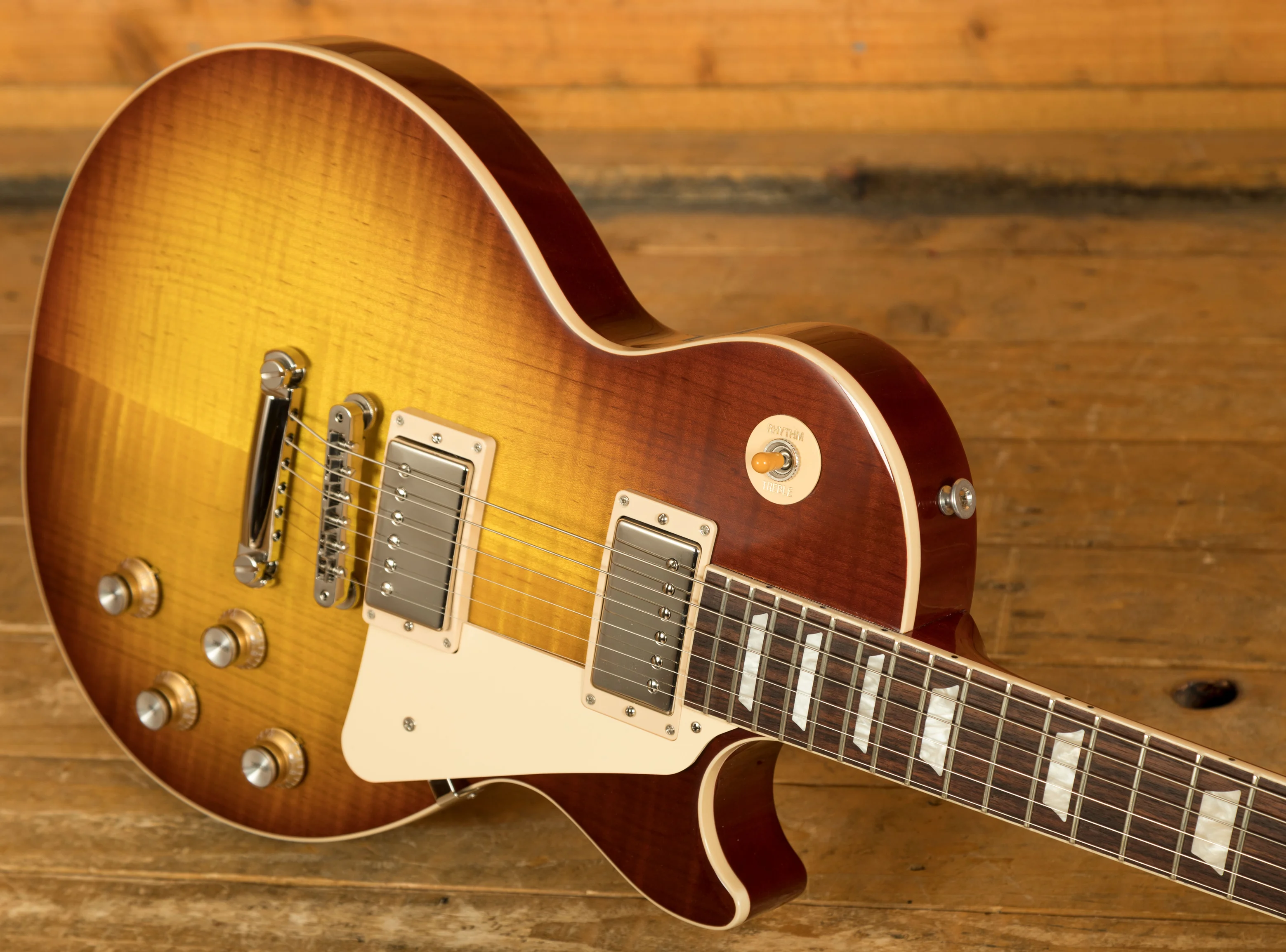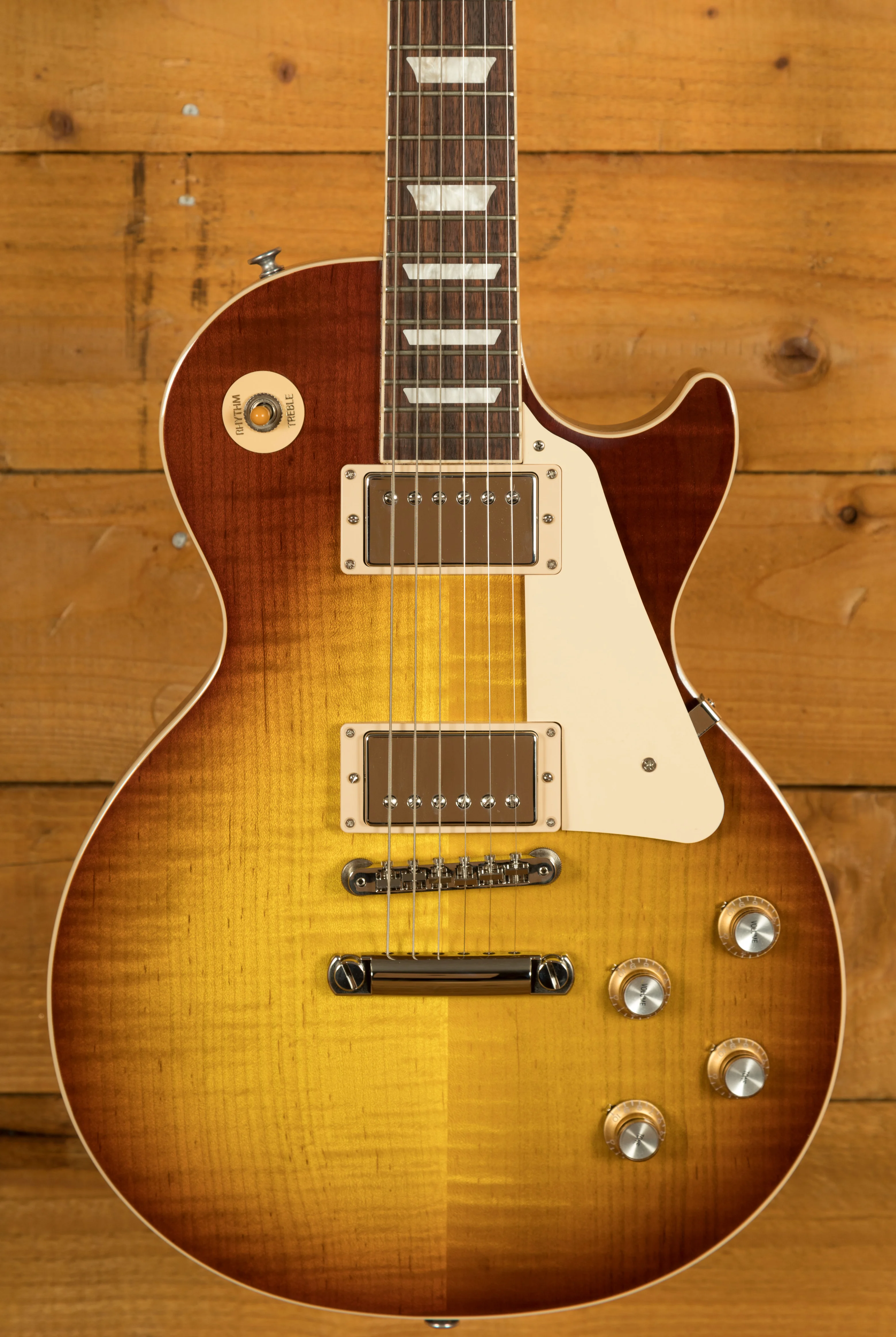 With a Mahogany body, this Les Paul benefits from a AA grade Maple top for the ultimate tonewood partnership. Rich and super resonant it offers premium tone and timeless aesthetics, while the Iced Tea finish looks a million dollars and really allows the wood to breathe and the natural tone to sing through.