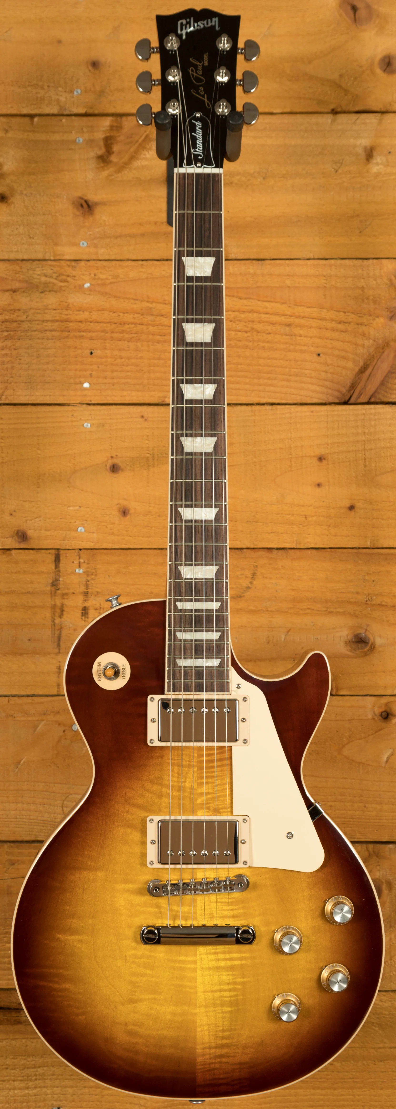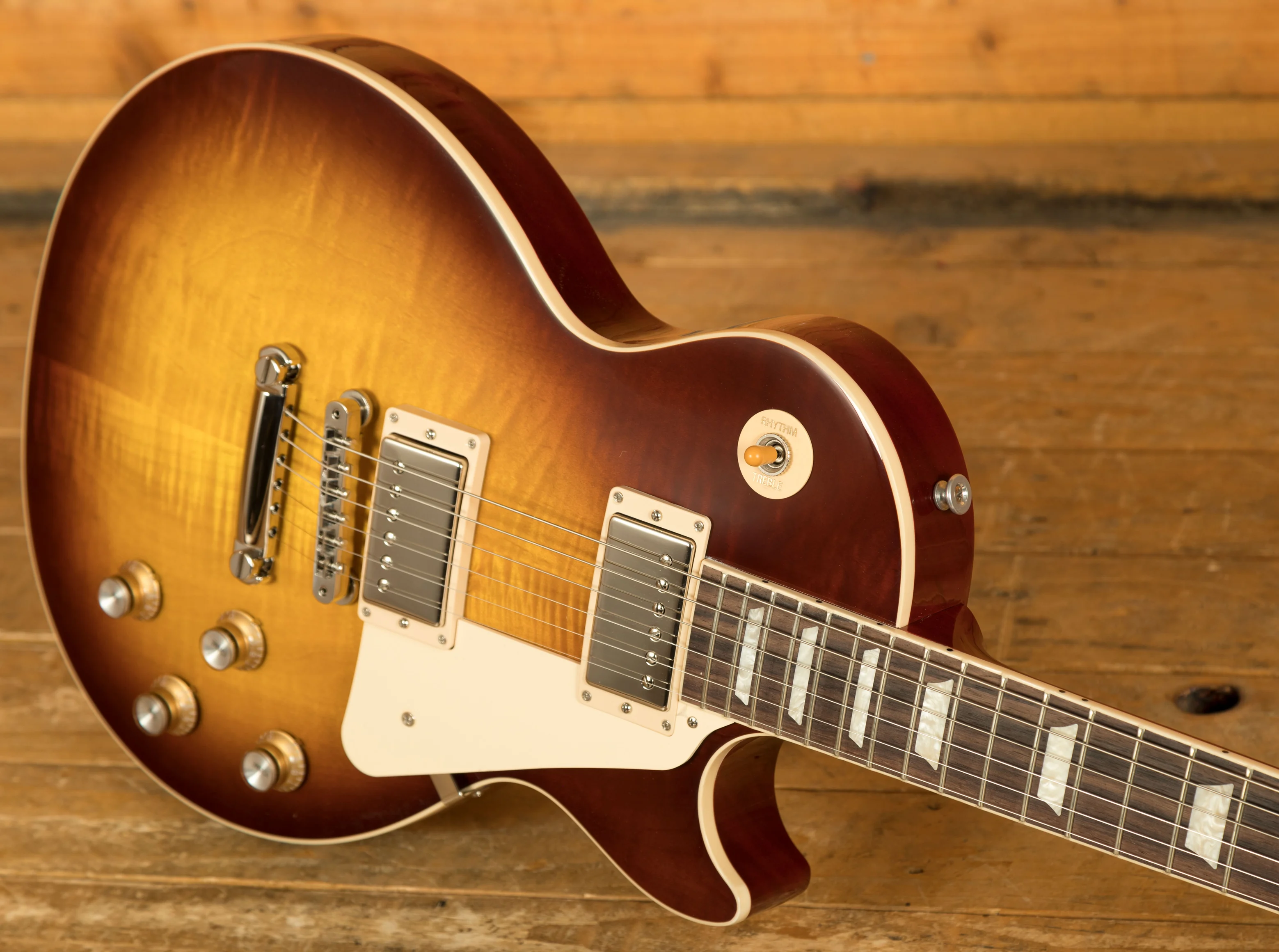 With a Mahogany body, this Les Paul benefits from a AA grade Maple top for the ultimate tonewood partnership. Rich and super resonant it offers premium tone and timeless aesthetics, while the Iced Tea finish looks a million dollars and really allows the wood to breathe and the natural tone to sing through.