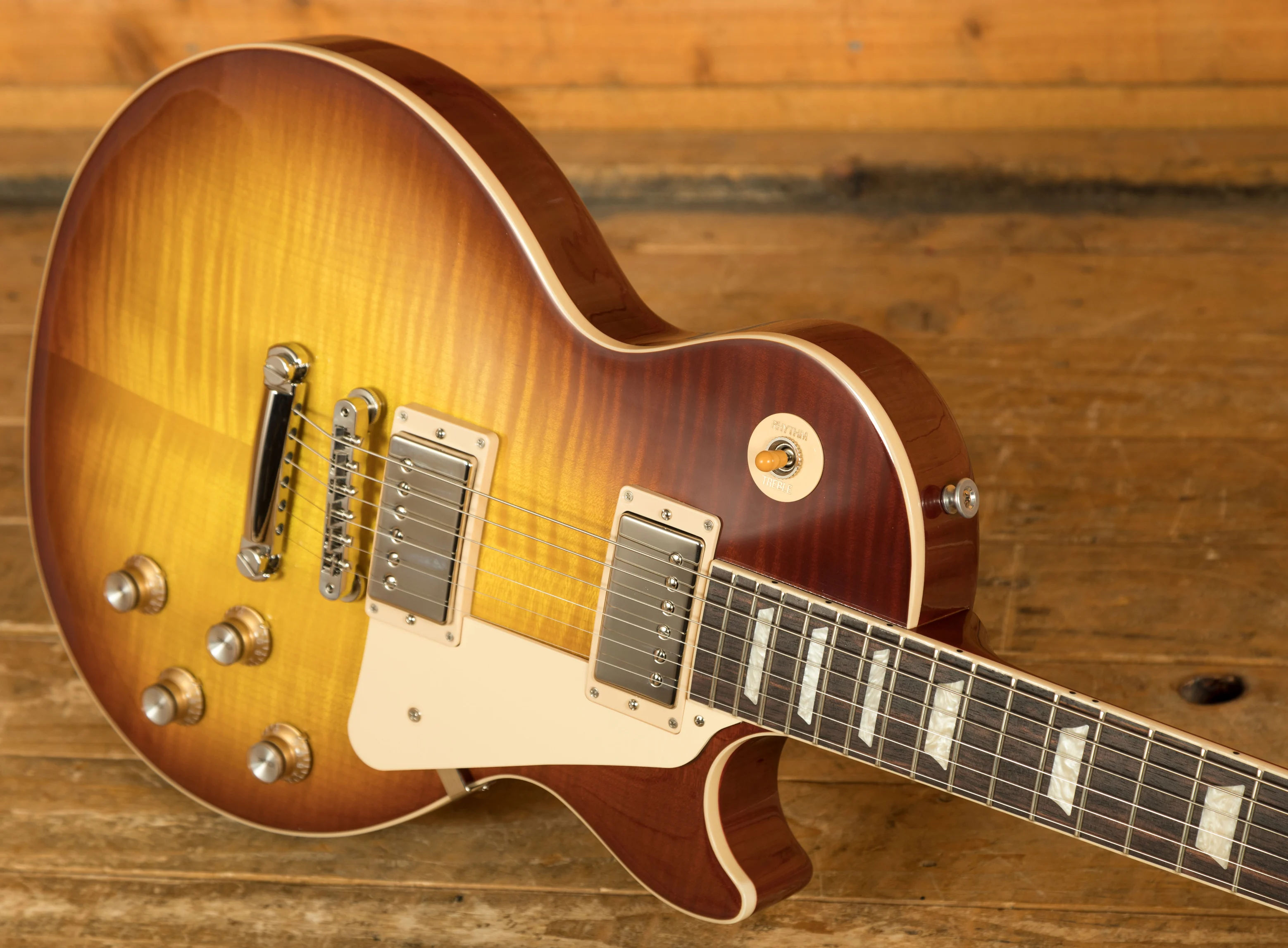With a Mahogany body, this Les Paul benefits from a AA grade Maple top for the ultimate tonewood partnership. Rich and super resonant it offers premium tone and timeless aesthetics, while the Iced Tea finish looks a million dollars and really allows the wood to breathe and the natural tone to sing through.