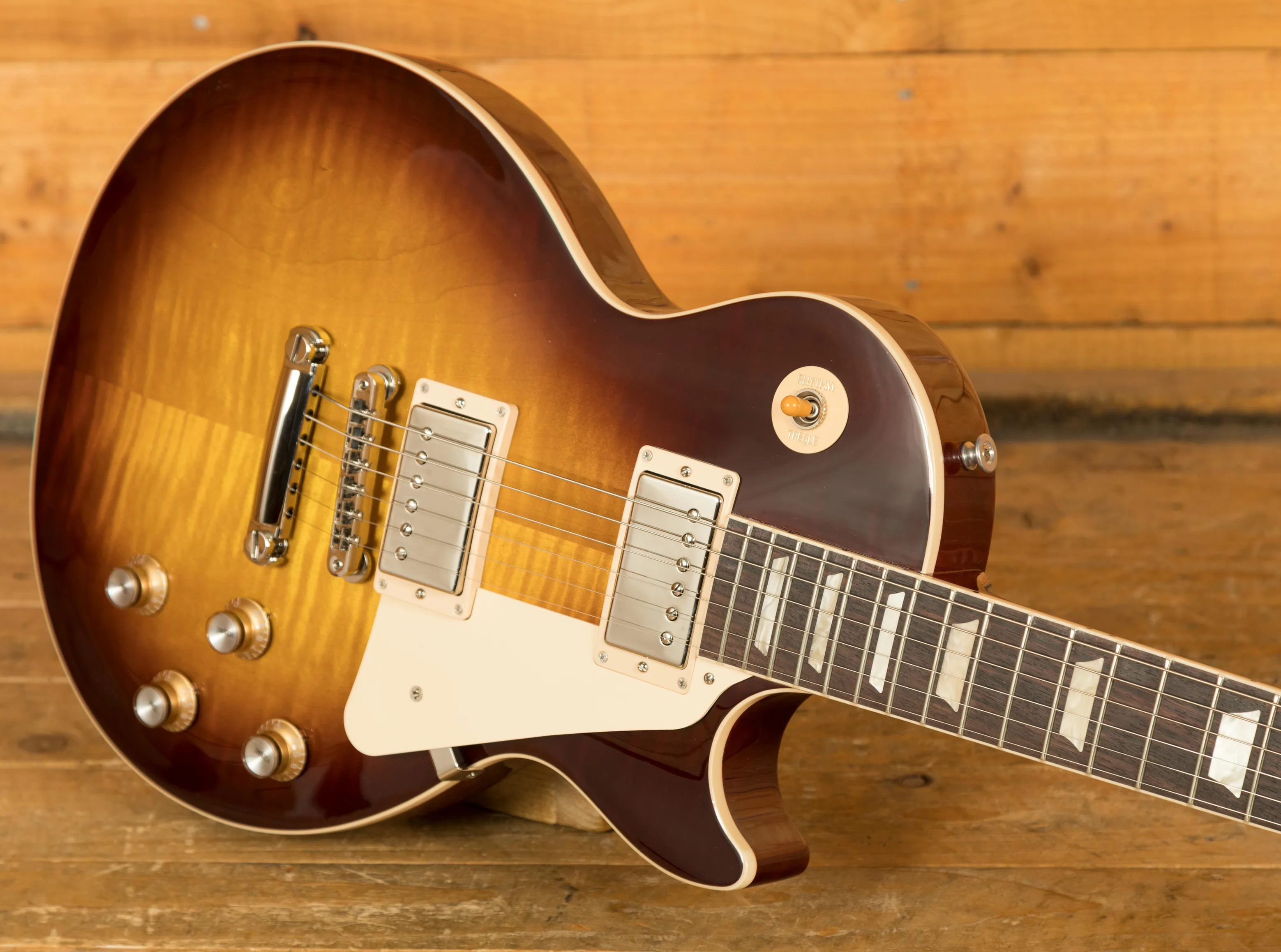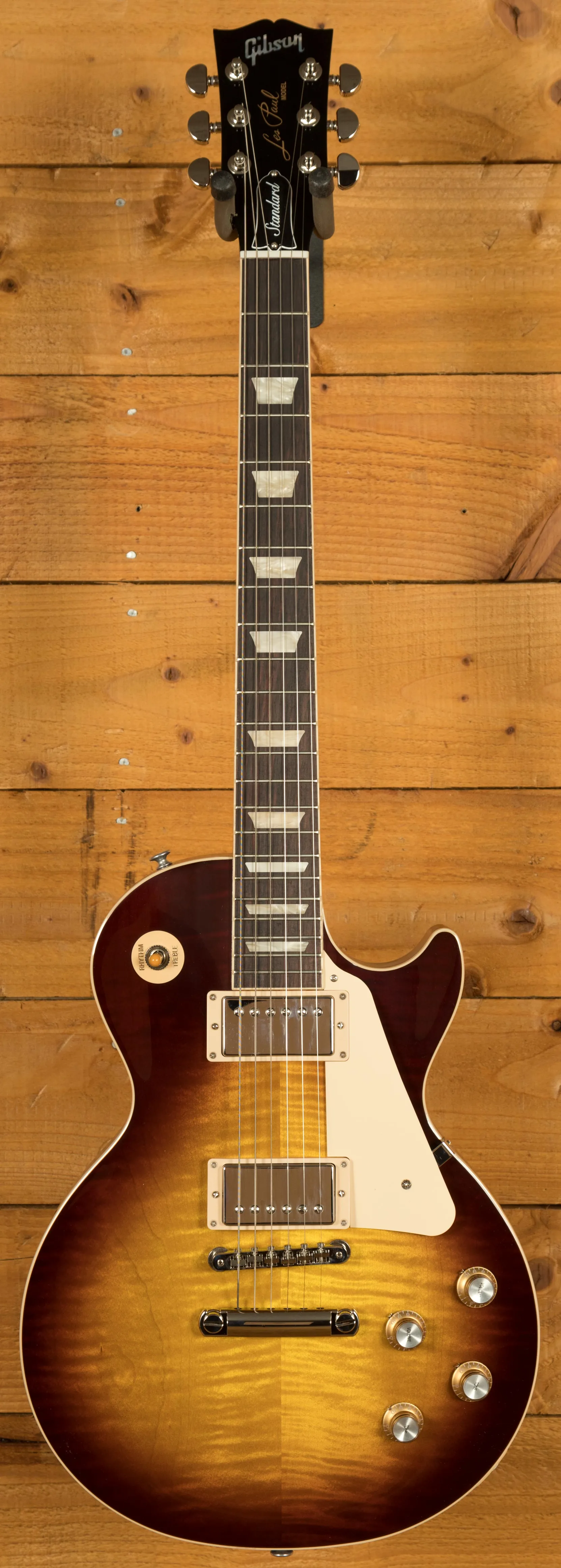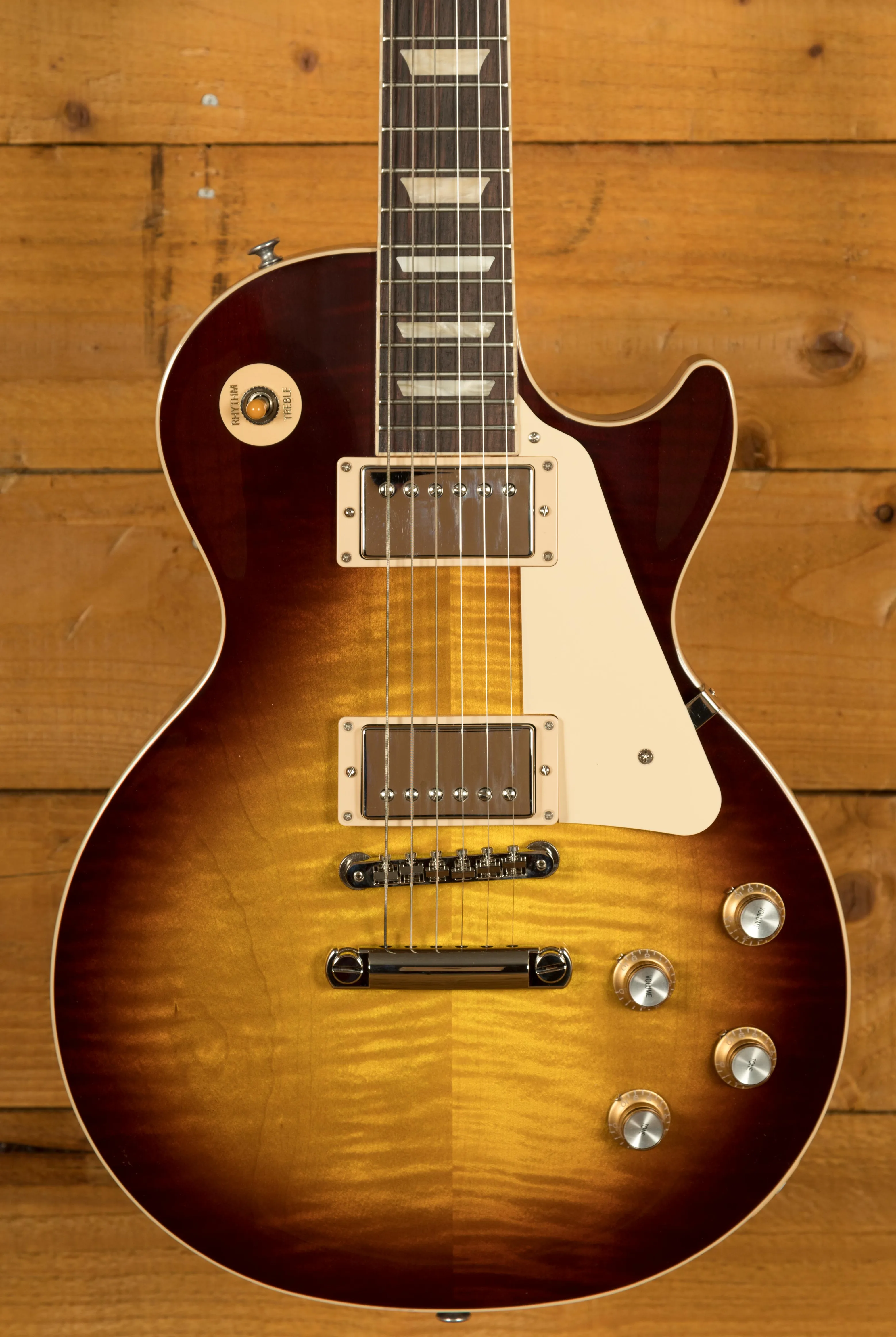 With a Mahogany body, this Les Paul benefits from a AA grade Maple top for the ultimate tonewood partnership. Rich and super resonant it offers premium tone and timeless aesthetics, while the Iced Tea finish looks a million dollars and really allows the wood to breathe and the natural tone to sing through.