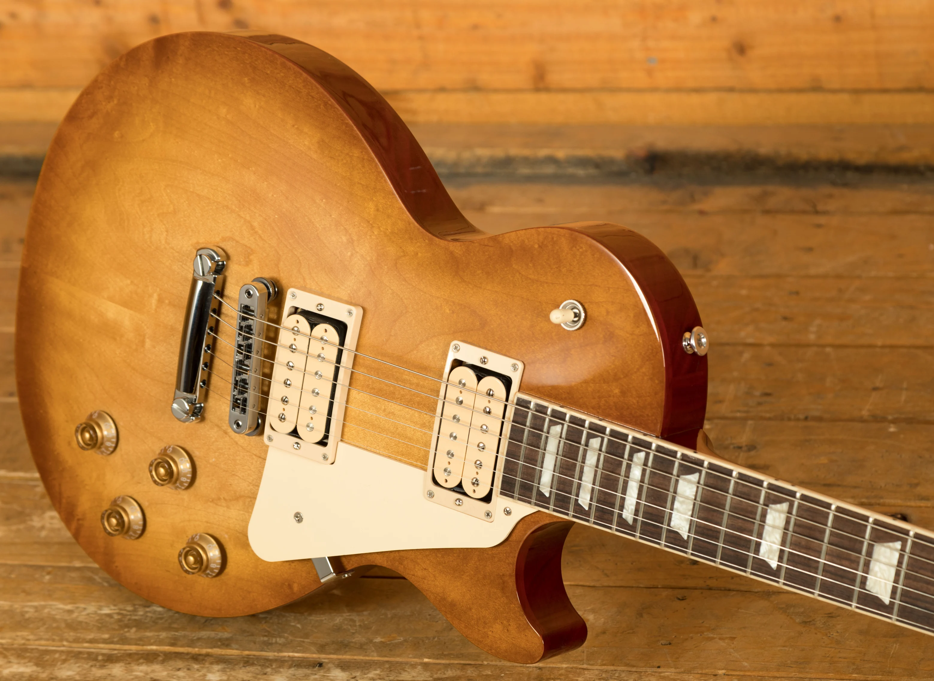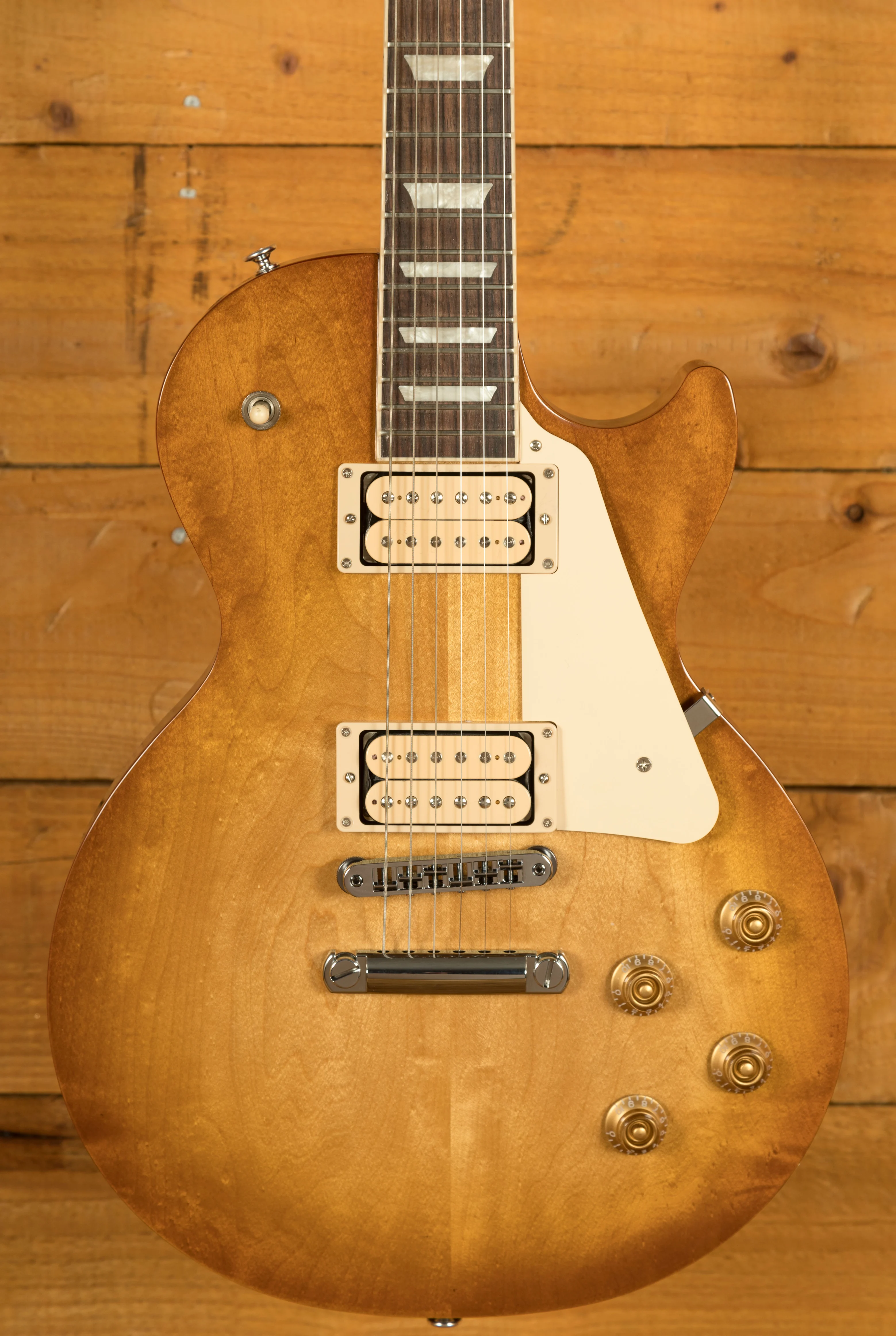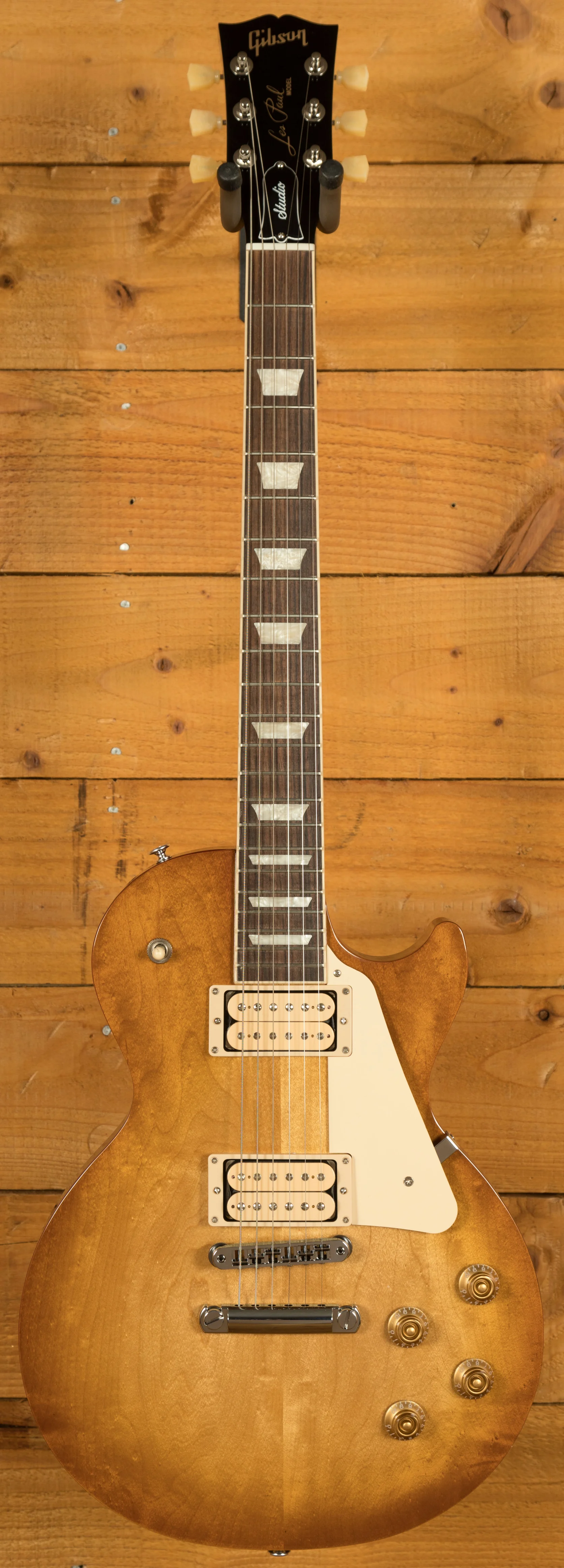 Loaded with a set of Open Coil Gibson Burstbucker Pro pickups with Double Classic White Bobbins, the Studio delivers authentic Gibson tones with added visual flare right out of the box! The Push/Pull Volume controls also allow for coil tapping, further enhancing the sonic potential! Vintage Deluxe tuners, alongside a Nashville Tune-O-Matic bridge allow for excellent tuning stability no matter the setting.
