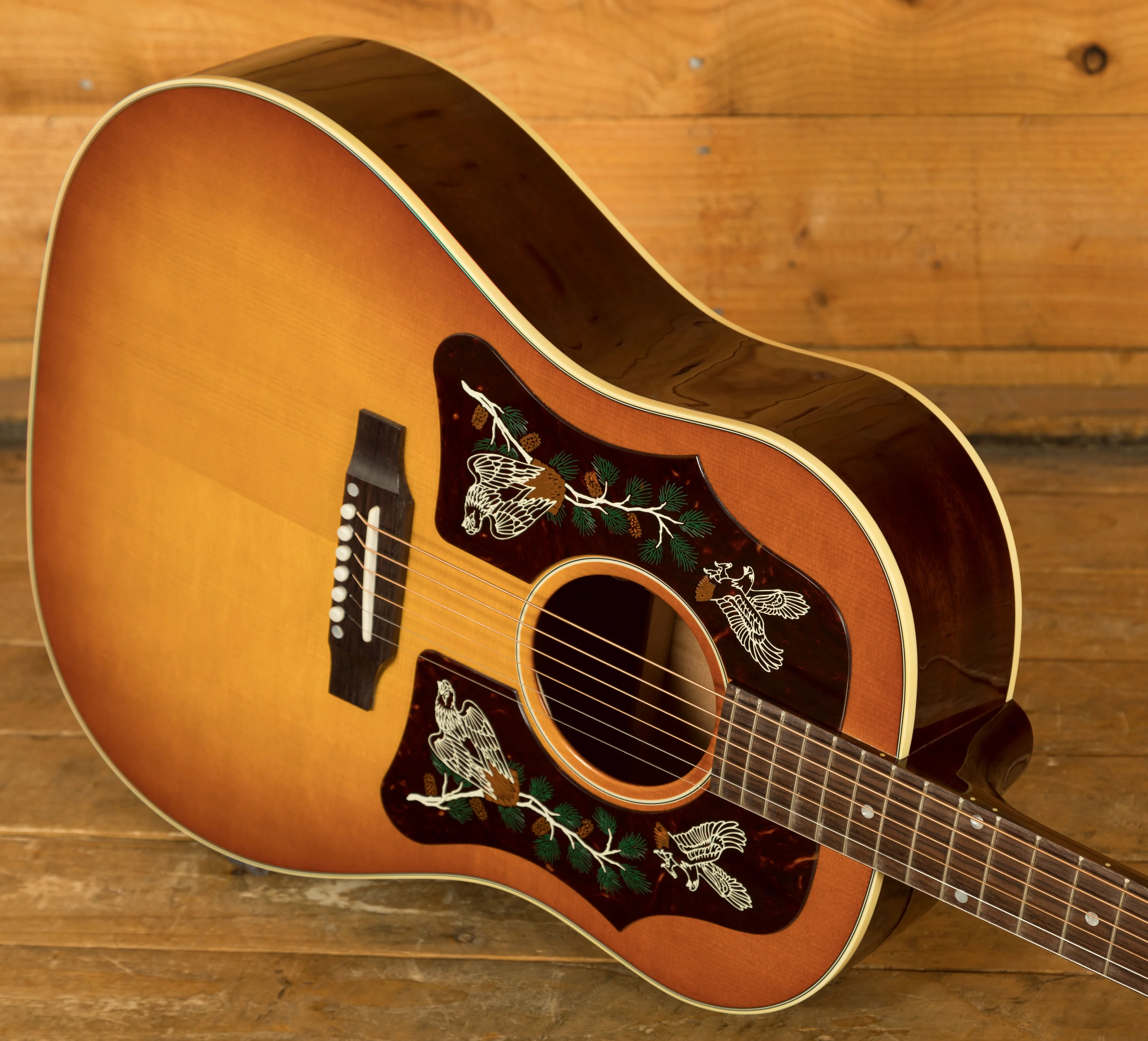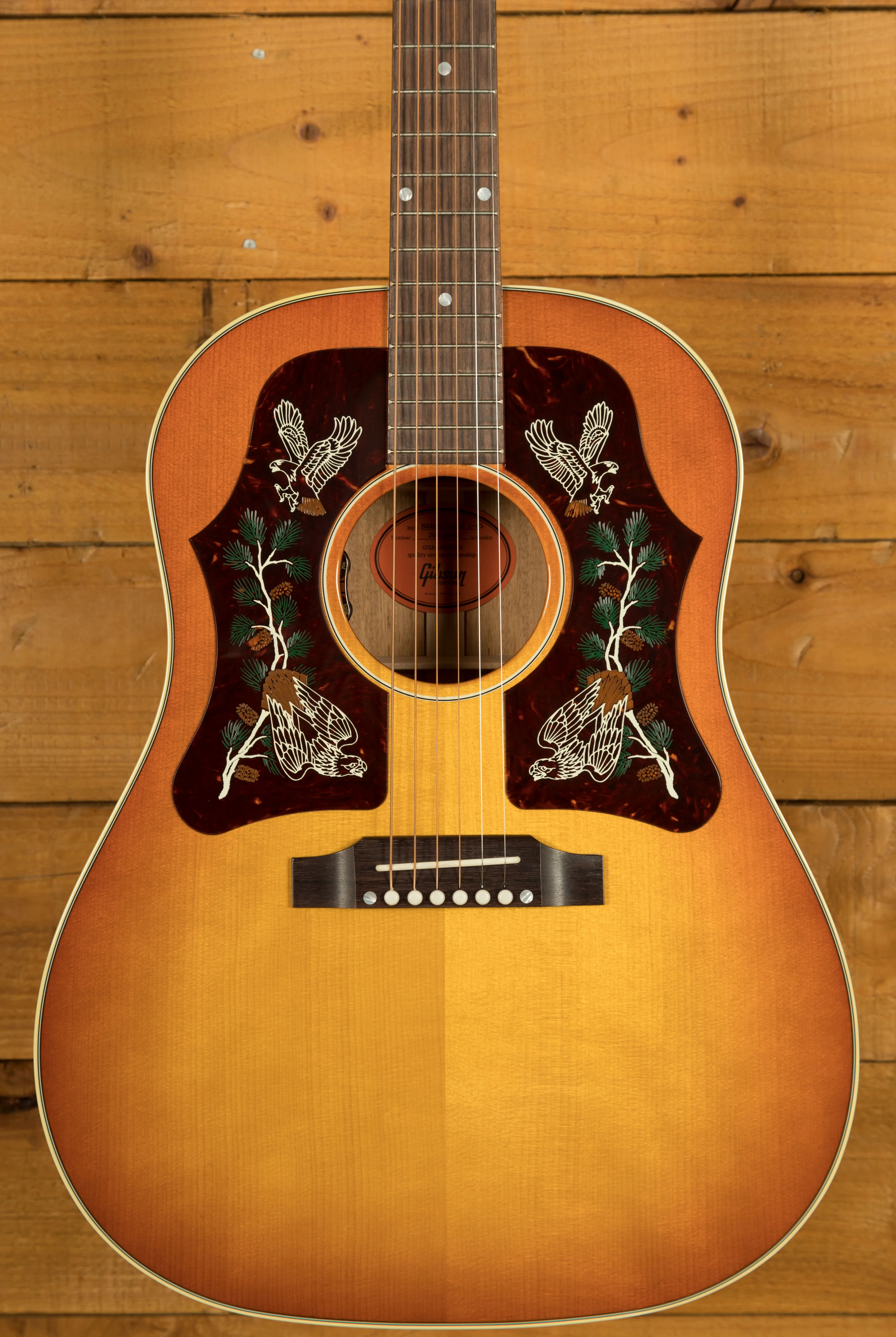 This special J-45 features a few unique visual touches that make it standout when compared to other acoustic guitars. The nitrocellulose Heritage Cherry Sunburst finish is super rich and vibrant. The colour is just incredible and really does look great. One of this guitars most unique features are the double 50s style pickguards, which both feature a unique, custom designed red-tail hawk graphic.