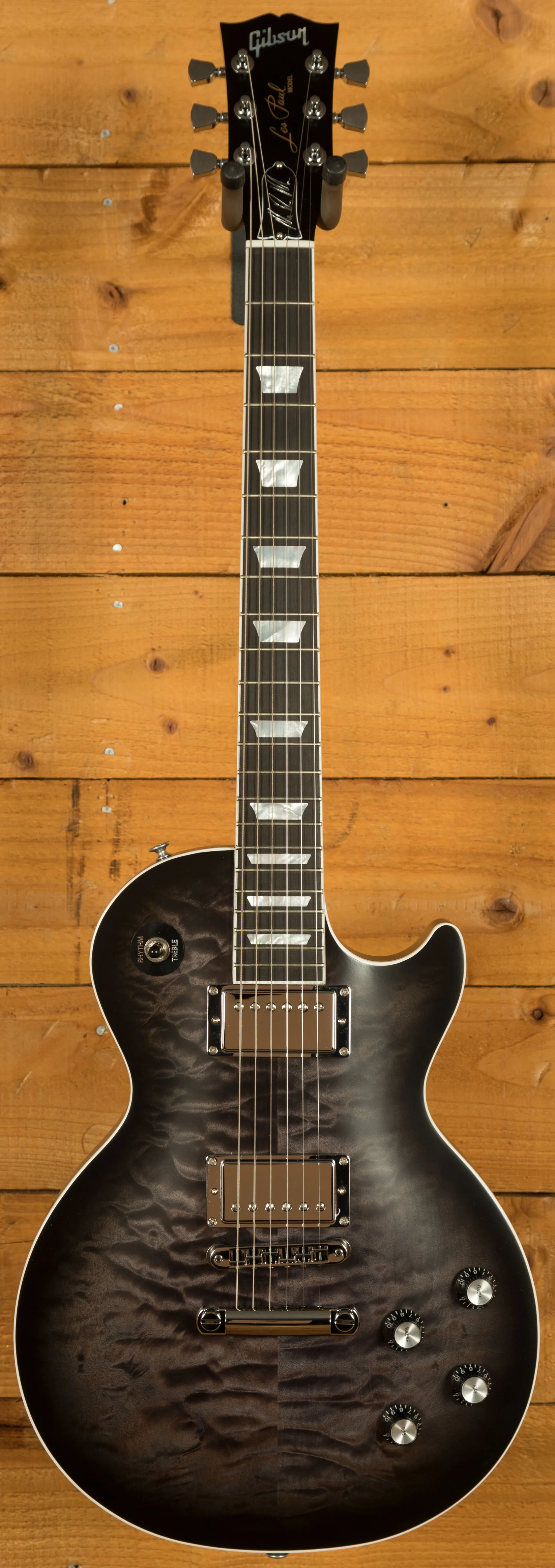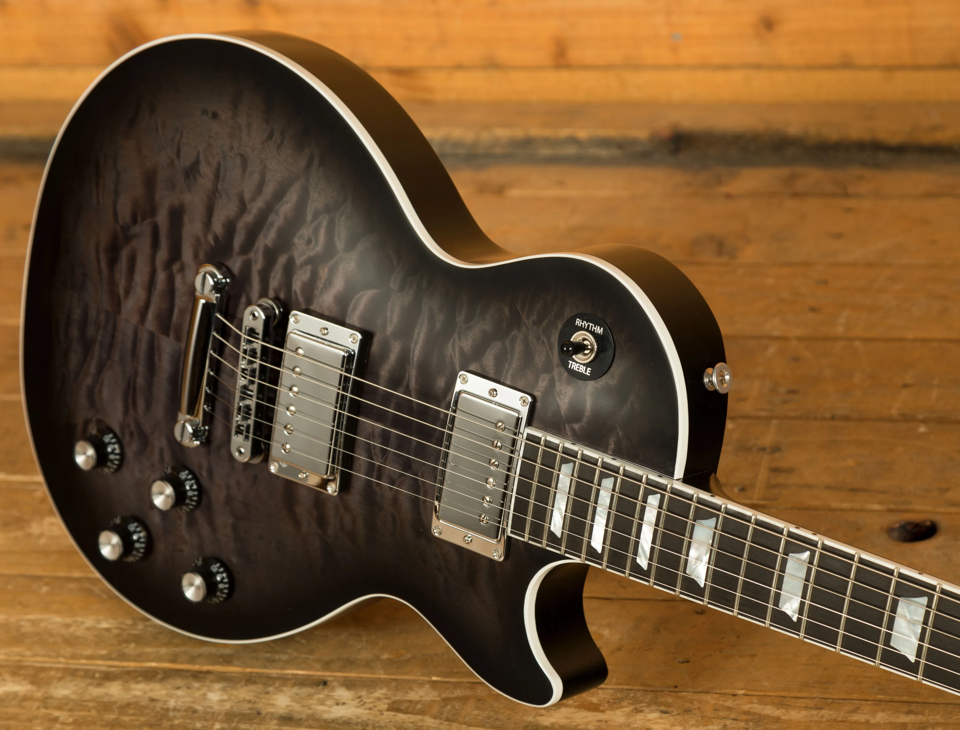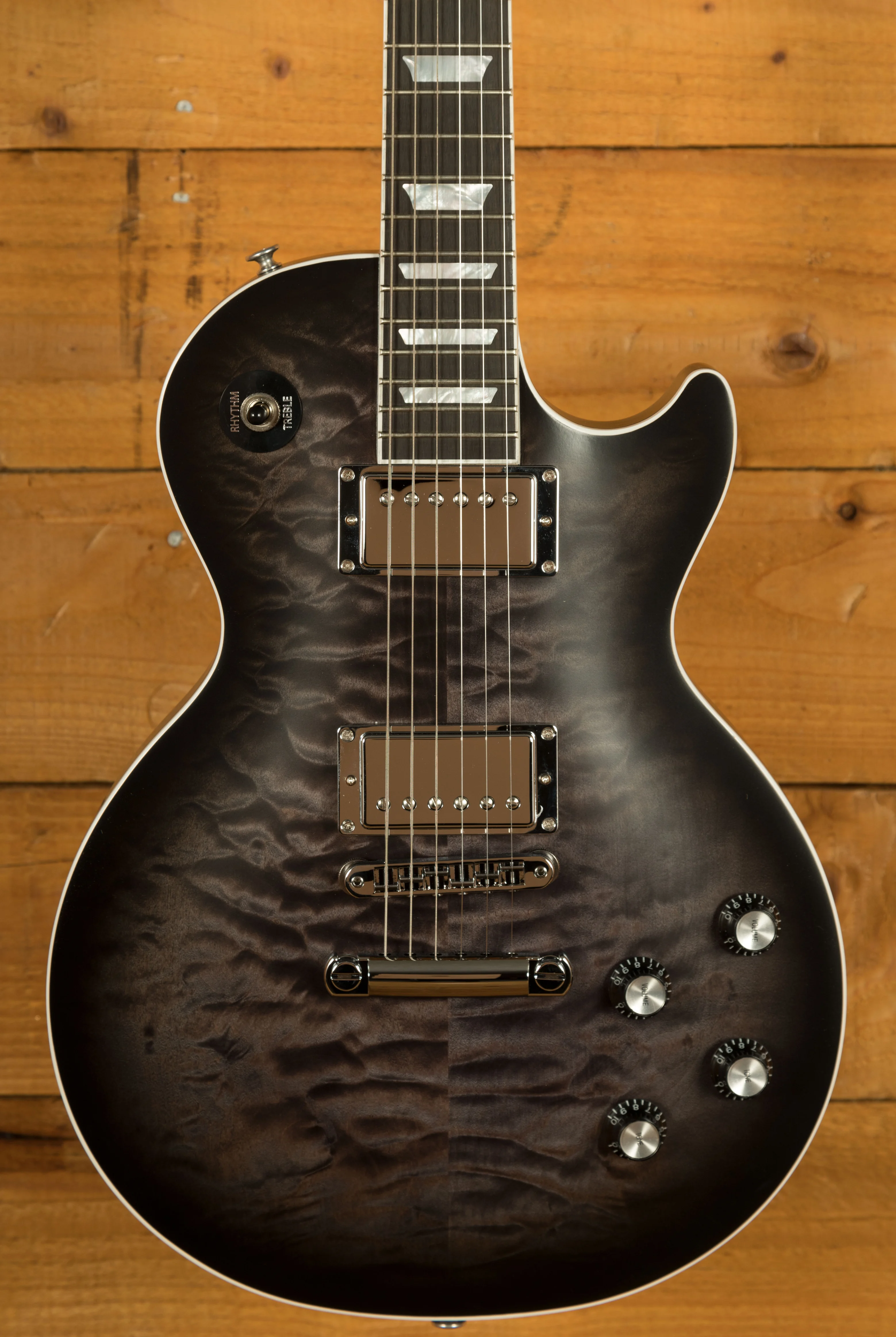 This signature model begins with a classic Les Paul body crafted from Mahogany and 3A Quilted Maple. The Mahogany body features Gibson’s ultra modern weight relief, making it exceptionally comfortable to play during long performances. The depth of figuring within the Quilted Maple top is just astonishing, they look awesome and give each serial number a unique identity. The Translucent Ebony Burst Satin finish looks super premium and does a great job helping the Quilted Maple pop.