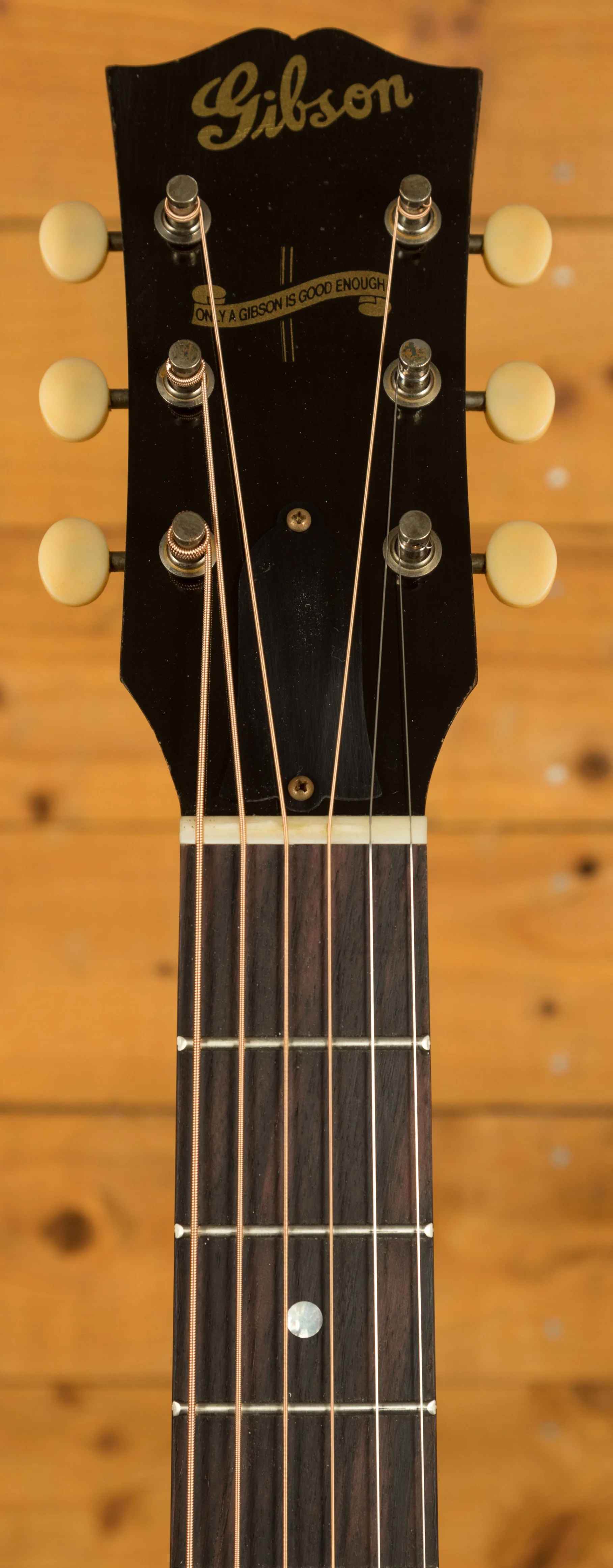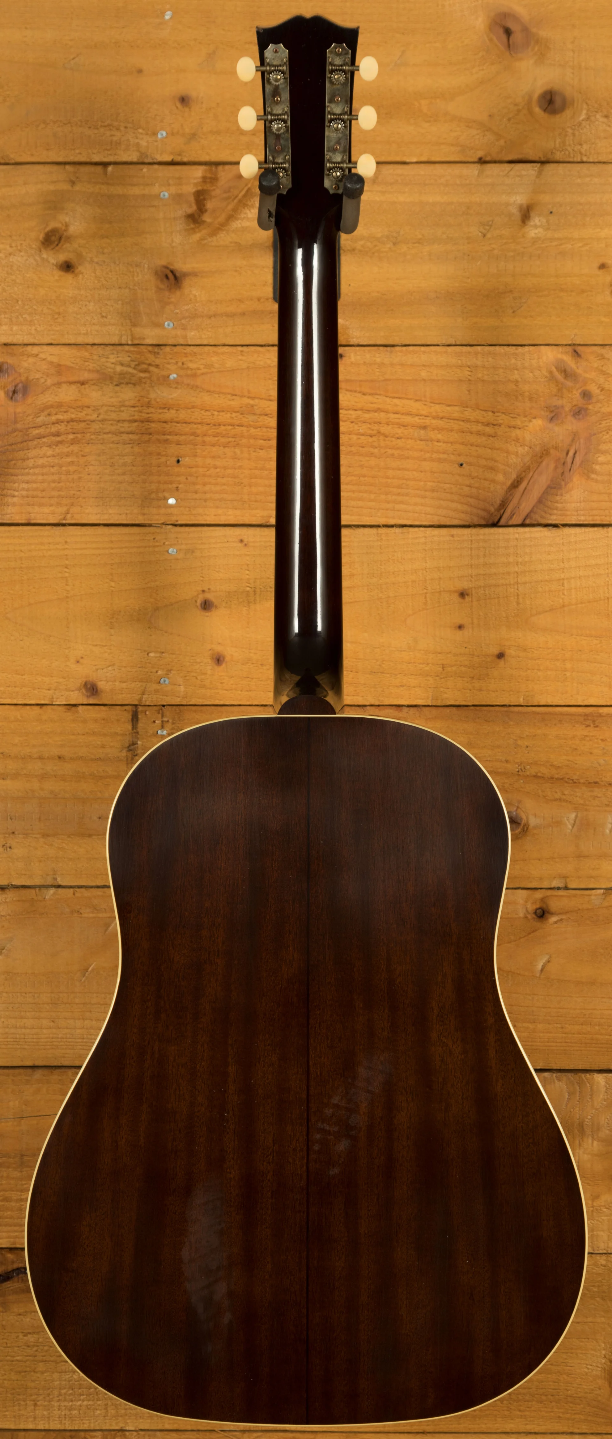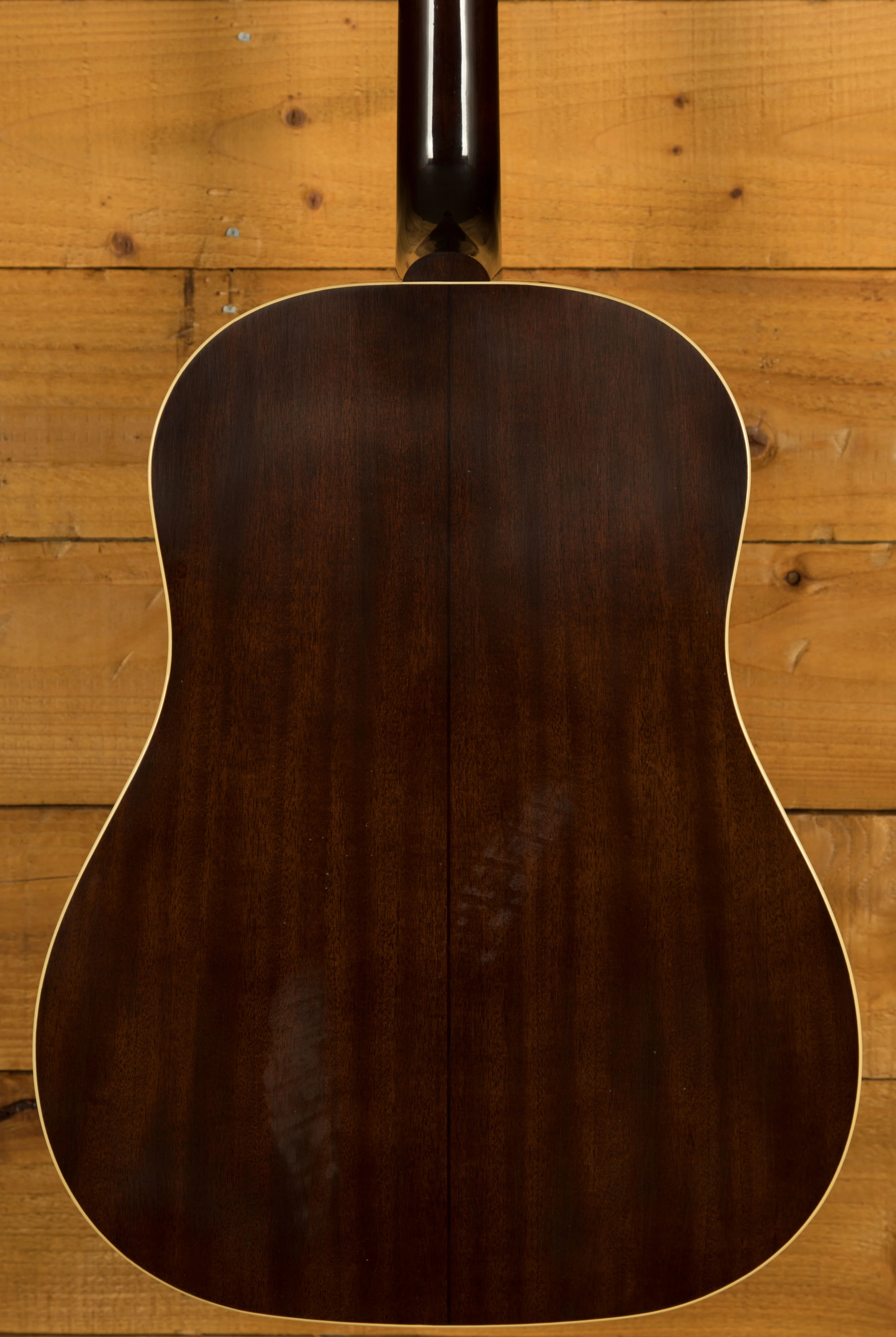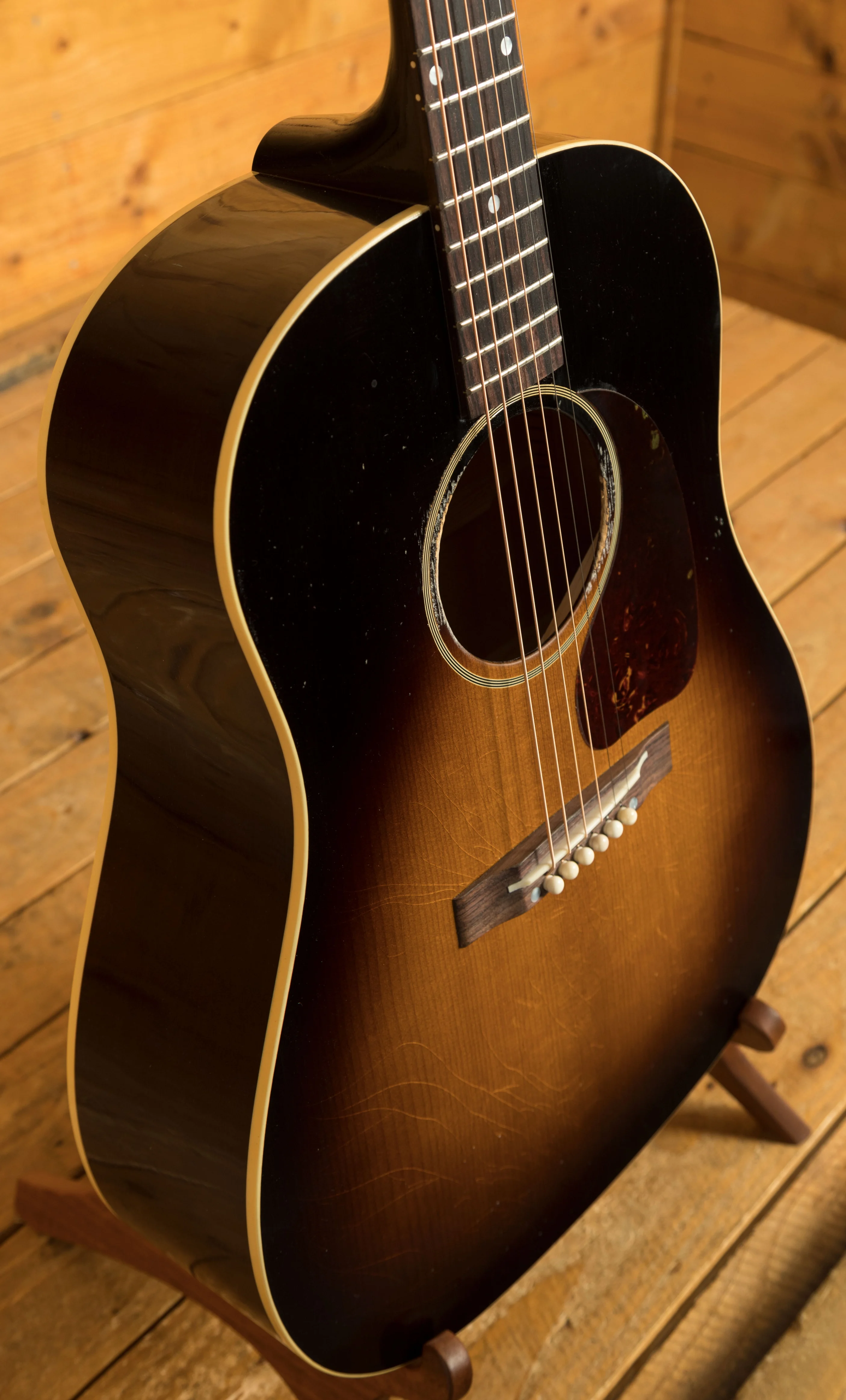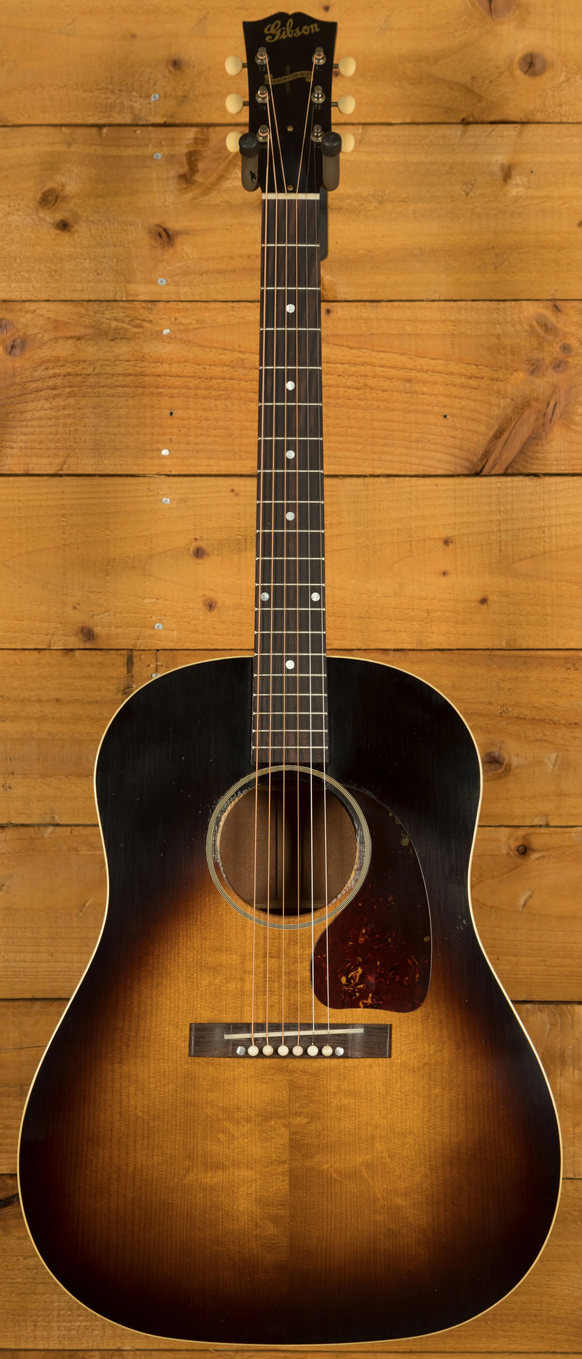 The Gibson 1942 Banner J-45 Light Aged Vintage Sunburst is a meticulously crafted acoustic guitar inspired by the highly sought-after vintage J-45 models of the 1940s. This guitar is built with a focus on replicating the structure and components of those classic instruments. The body of the J-45 is constructed from mahogany for the back and sides, contributing to its warm and resonant tone. The top is made from Thermally Aged Adirondack red spruce, which is hand-sprayed with a historic-style sunburst finish. This ageing process simulates the natural wear and tonal characteristics of a vintage instrument.