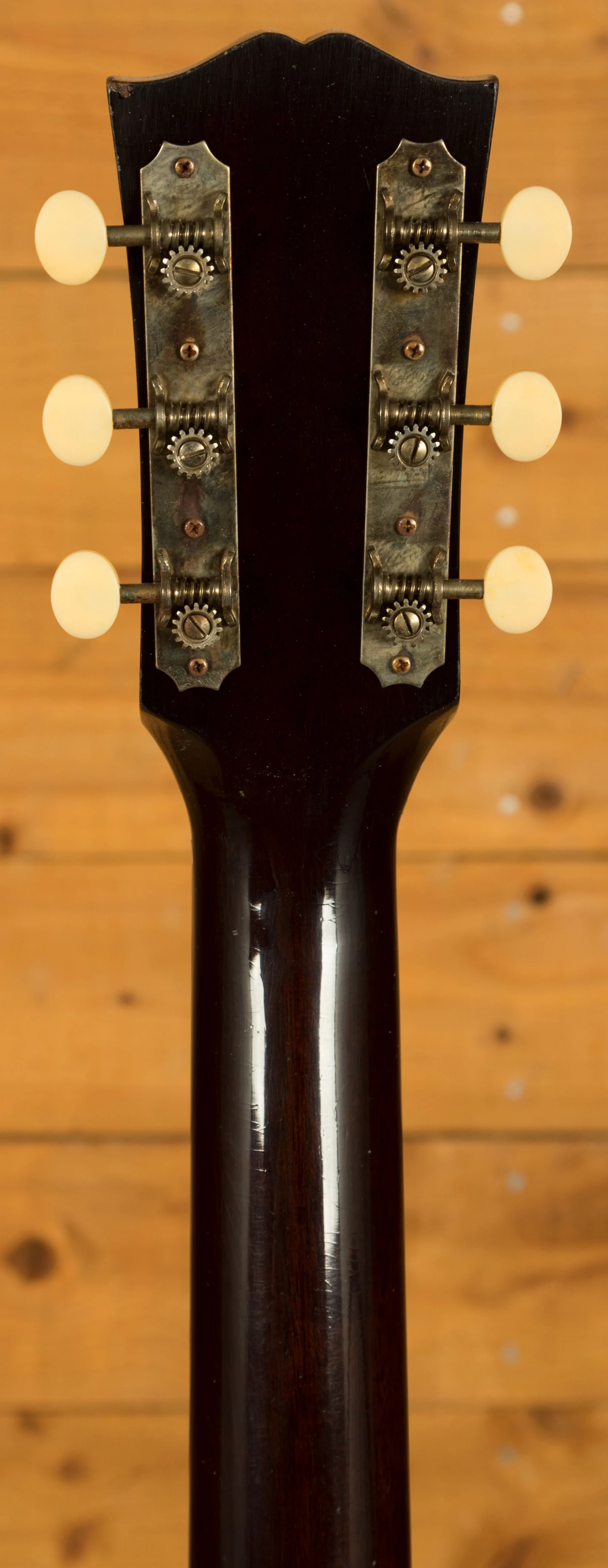 A key element in the construction of the 1942 Banner J-45 is the use of hot hide glue for the top bracing. This traditional method, combined with the hand-scalloped X-bracing pattern using red spruce braces, is intended to enhance the guitar's tonal response and projection. The neck, also mahogany, features a historic profile and a 24.75-inch scale length. The rosewood fingerboard has a 12-inch radius and is adorned with mother-of-pearl dot inlays. The guitar has 19 frets using Legend Wire.