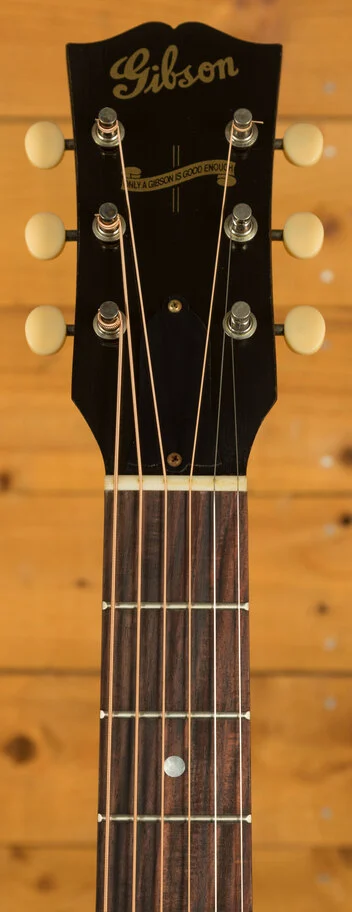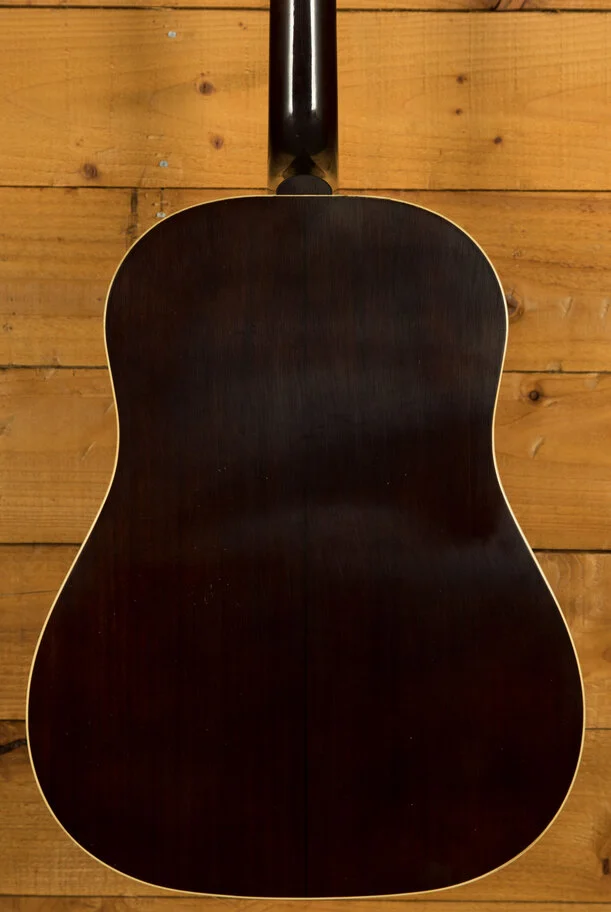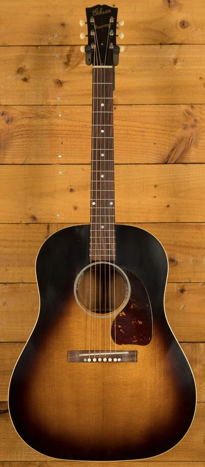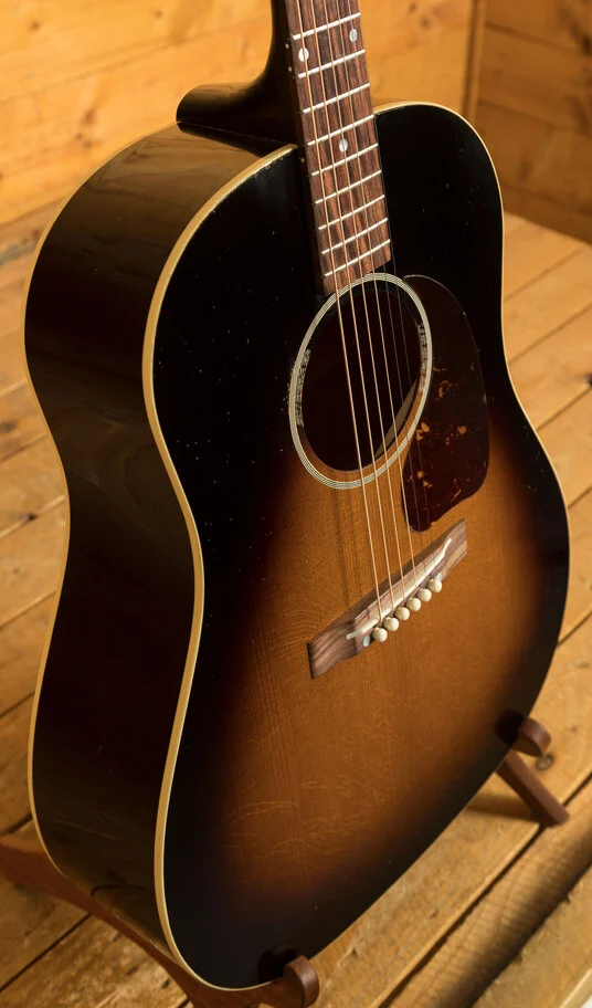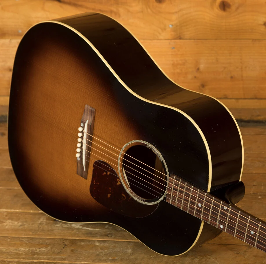 The Gibson 1942 Banner J-45 Light Aged Vintage Sunburst is a meticulously crafted acoustic guitar inspired by the highly sought-after vintage J-45 models of the 1940s. This guitar is built with a focus on replicating the structure and components of those classic instruments. The body of the J-45 is constructed from mahogany for the back and sides, contributing to its warm and resonant tone. The top is made from Thermally Aged Adirondack red spruce, which is hand-sprayed with a historic-style sunburst finish. This ageing process simulates the natural wear and tonal characteristics of a vintage instrument.