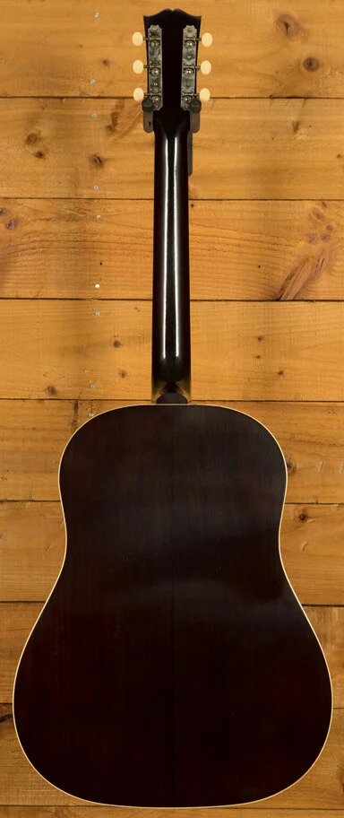 A key element in the construction of the 1942 Banner J-45 is the use of hot hide glue for the top bracing. This traditional method, combined with the hand-scalloped X-bracing pattern using red spruce braces, is intended to enhance the guitar's tonal response and projection. The neck, also mahogany, features a historic profile and a 24.75-inch scale length. The rosewood fingerboard has a 12-inch radius and is adorned with mother-of-pearl dot inlays. The guitar has 19 frets using Legend Wire.
