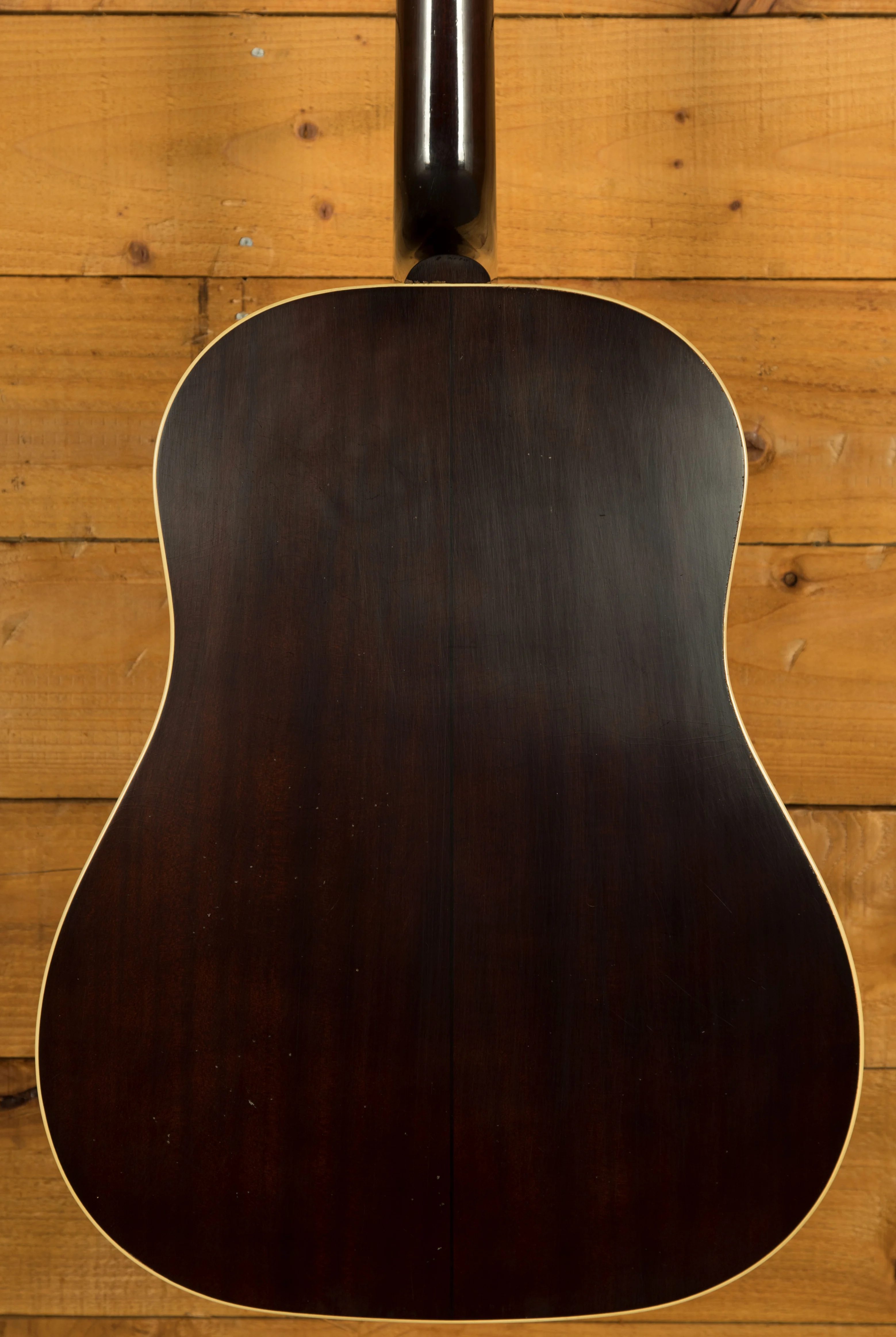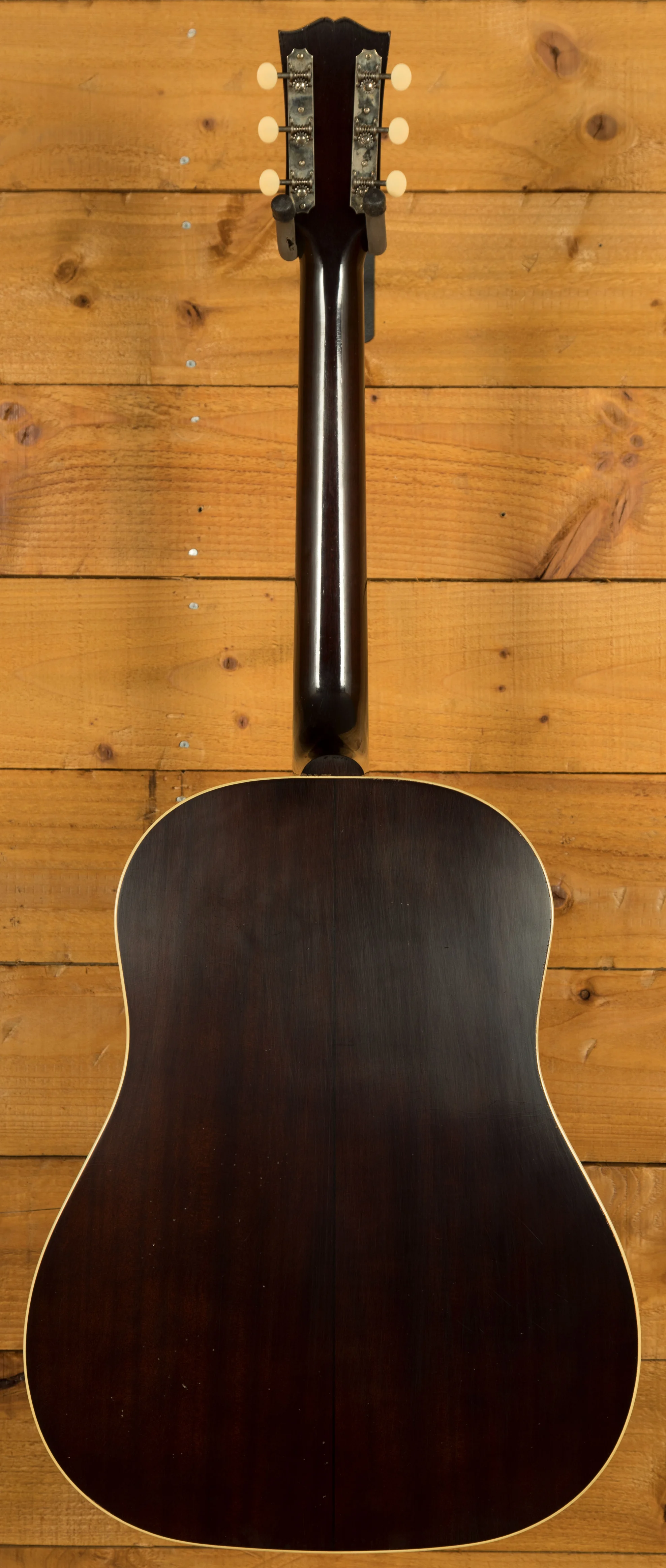 A key element in the construction of the 1942 Banner J-45 is the use of hot hide glue for the top bracing.  This traditional method, combined with the hand-scalloped X-bracing pattern using red spruce braces, is intended to enhance the guitar's tonal response and projection.  The neck, also mahogany, features a historic profile and a 24.75-inch scale length. The rosewood fingerboard has a 12-inch radius and is adorned with mother-of-pearl dot inlays.  The guitar has 19 frets using Legend Wire.