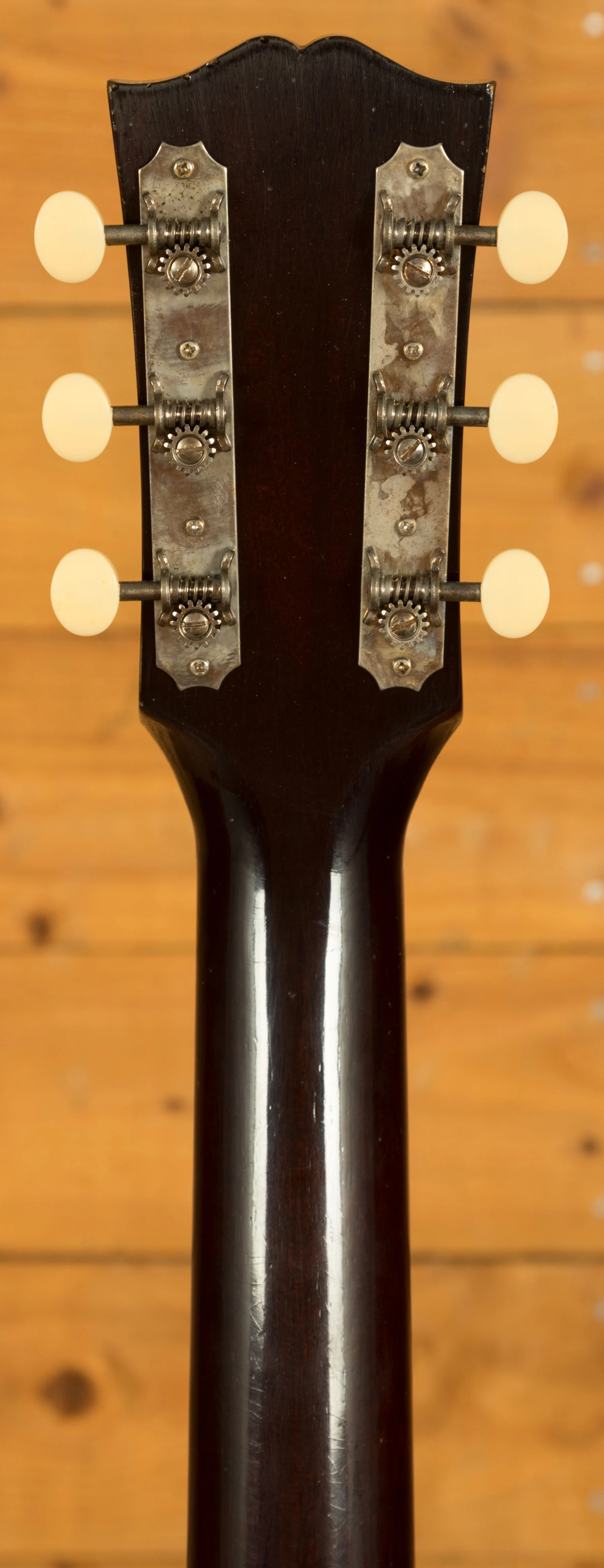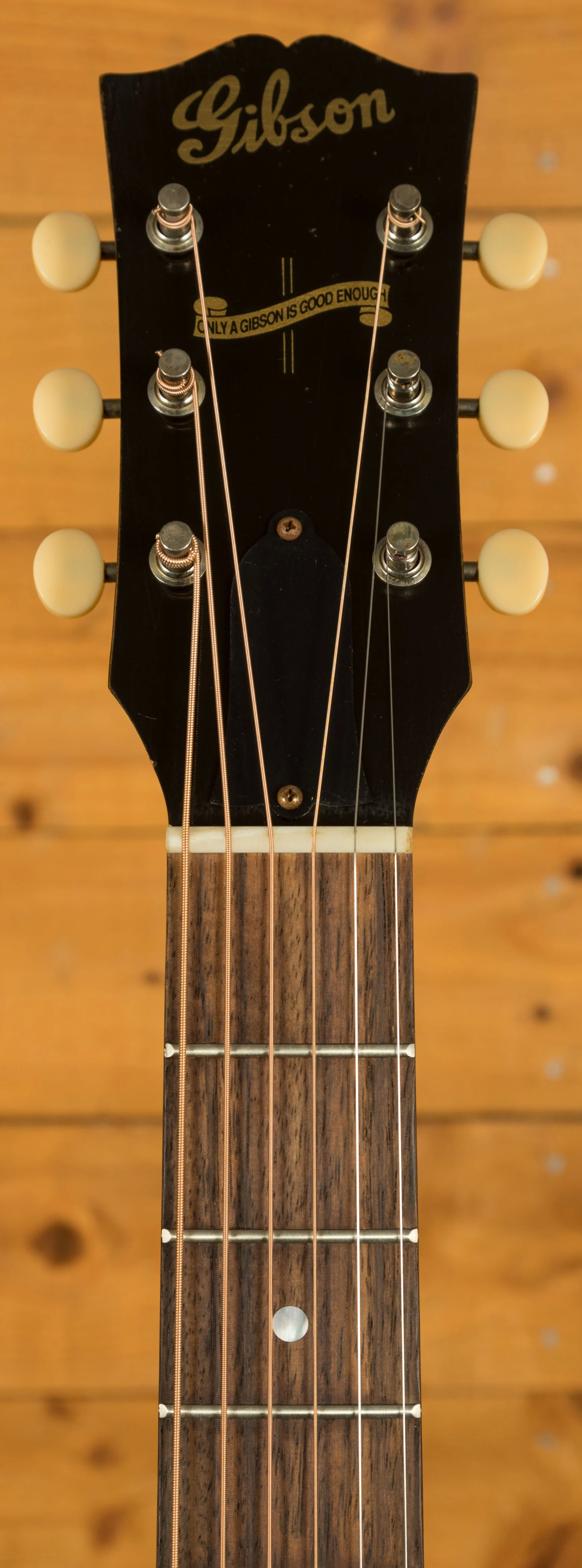 The nut and saddle are both made from bone, which is a traditional material known for its contribution to clear and sustained tone. The nut width is 1.724 inches.  The bridge is made of rosewood with a rectangular open slot design.  The tuning machines are strap-style open-back with aged cream buttons.  The guitar also features a tear drop tortoise pickguard with an aged appearance.  The finish is a Murphy Lab Light Aged nitrocellulose lacquer, applied by the skilled artisans at the Murphy Lab. This ageing process simulates decades of light play wear and gives the guitar the look and feel of a well-preserved vintage instrument. The hardware is also lightly aged to complement the finish.