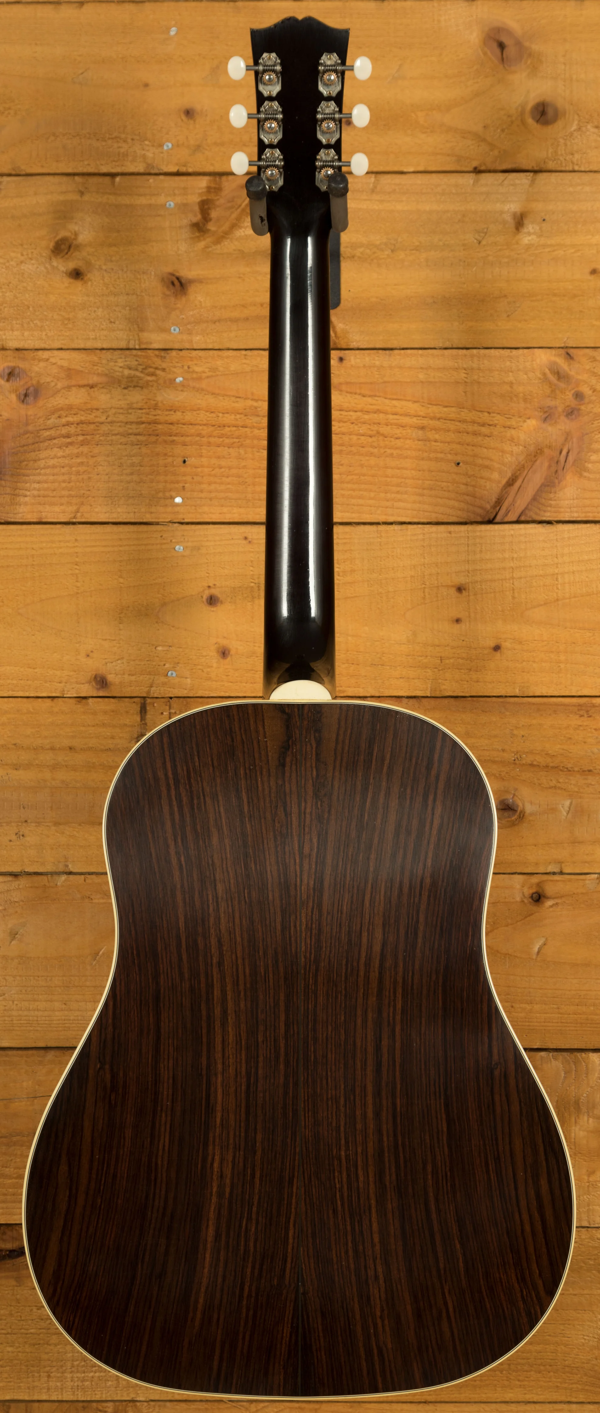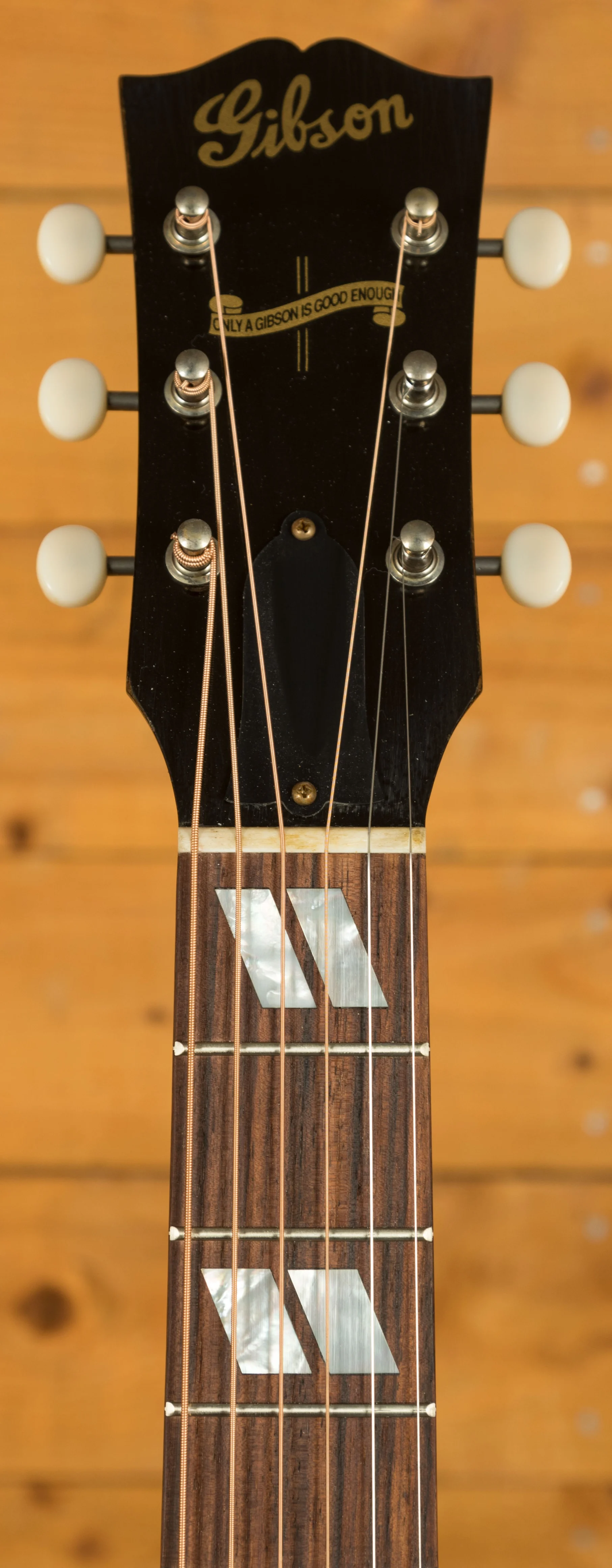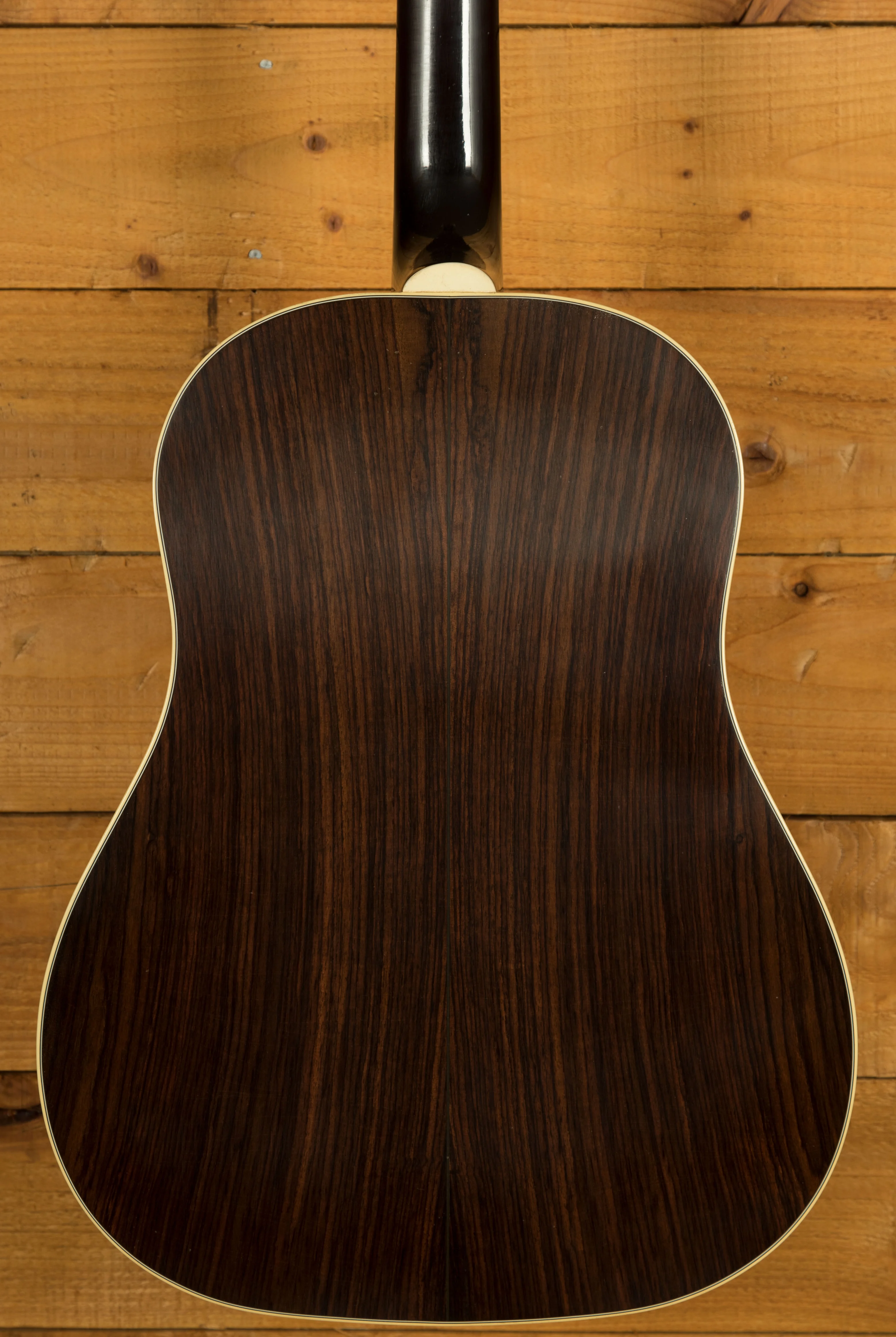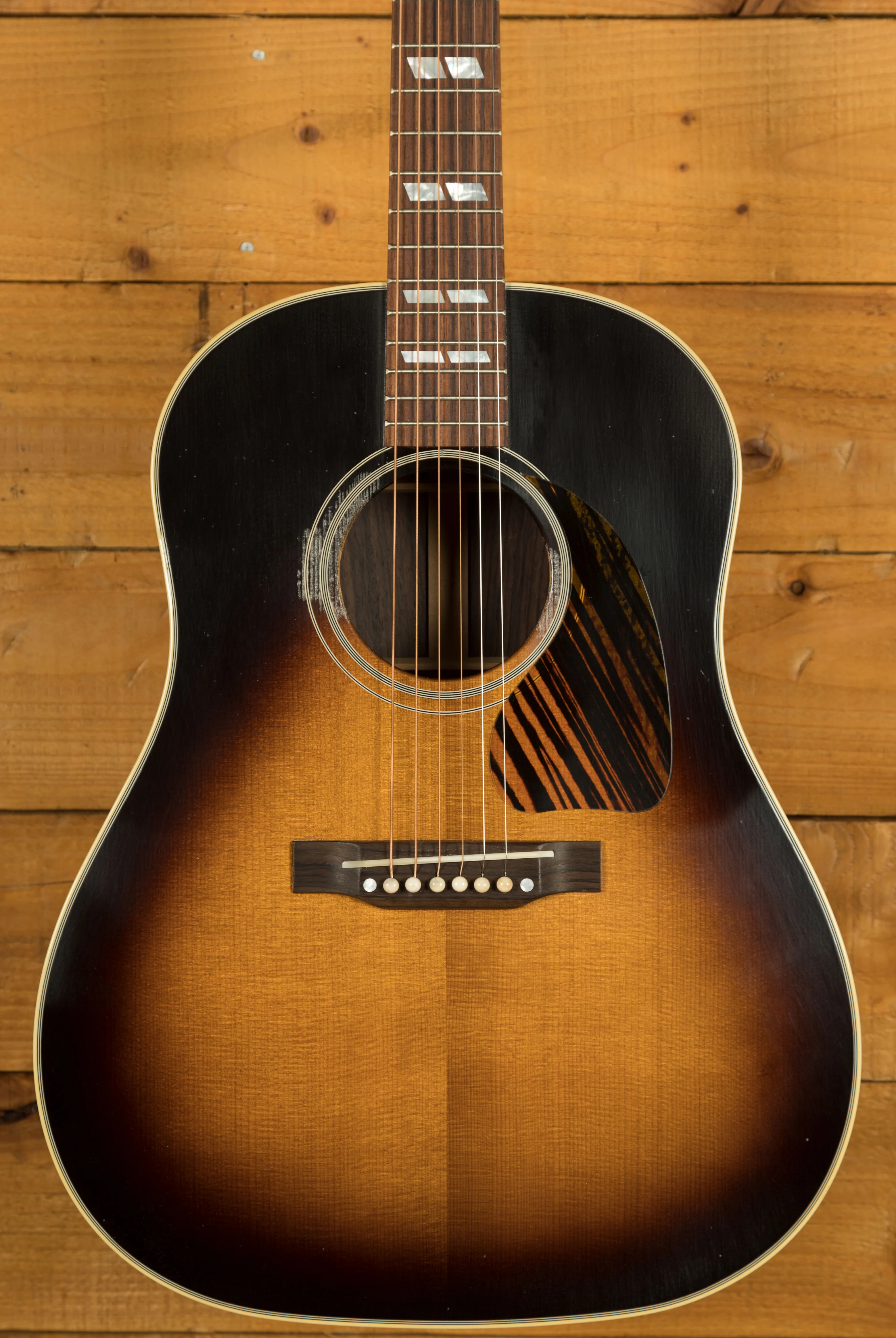 The Gibson Custom Shop Murphy Lab 1942 Banner Southern Jumbo Light Aged Vintage Sunburst offers players the look, feel, and sound of a vintage Gibson acoustic guitar that has been carefully preserved over time. This instrument features a thermally aged Adirondack red spruce top, which contributes to its tonal response and projection. The back and sides are constructed from rosewood, further enhancing the guitar's resonance and warmth. The guitar's versatility shines through whether playing chords or lead lines. A key feature is the "Only a Gibson is Good Enough" banner proudly displayed on the headstock, a hallmark of Gibson's Golden Era. Other period-correct appointments include an open slot rosewood bridge, a bone saddle and nut, and the classic 1.77" nut width. The guitar's vintage vibe is further enhanced by the Murphy Lab's Light Aged finish treatment. This specialised process simulates the wear and tear of decades of light use, giving the instrument the character and feel of a well-loved original. The ageing process also extends to the hardware, contributing to the overall authenticity of the instrument. The guitar's construction includes traditional hand-scalloped X-bracing with red spruce braces and hide glue, multi-ply binding on the top and back, and a mahogany neck with a C profile. The rosewood fingerboard has a 12-inch radius and mother-of-pearl parallelogram inlays. The scale length is 24.75 inches. The guitar comes with a period-correct case, a Gibson accessory kit, and a certificate of authenticity.